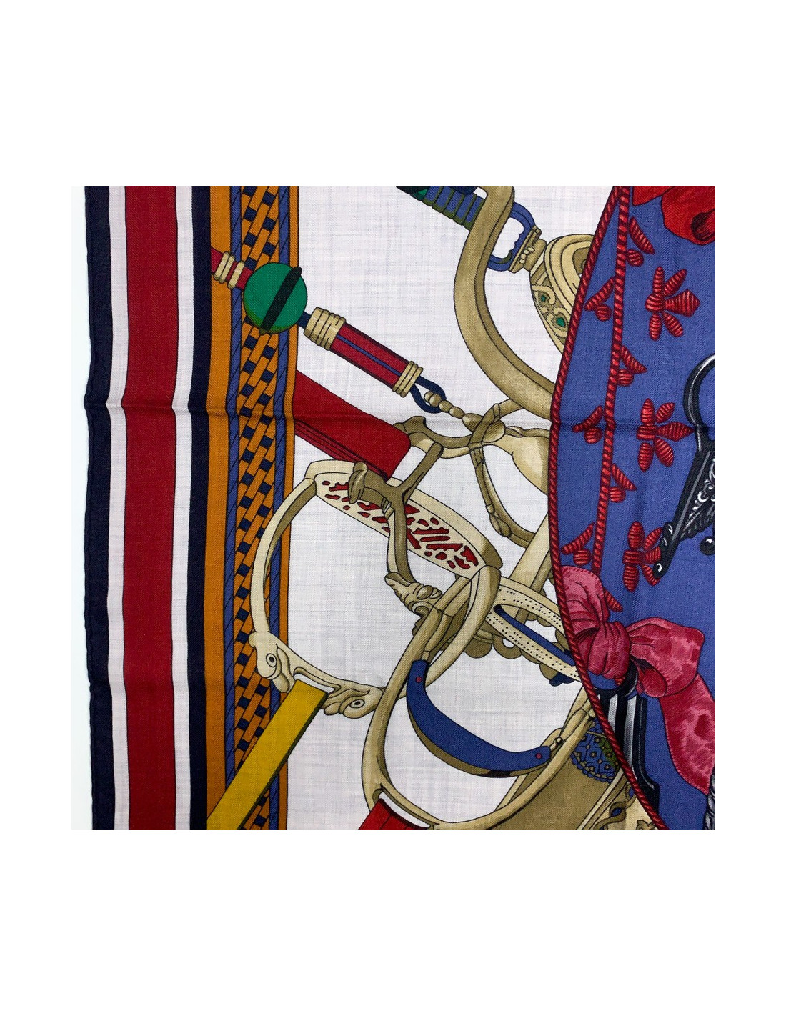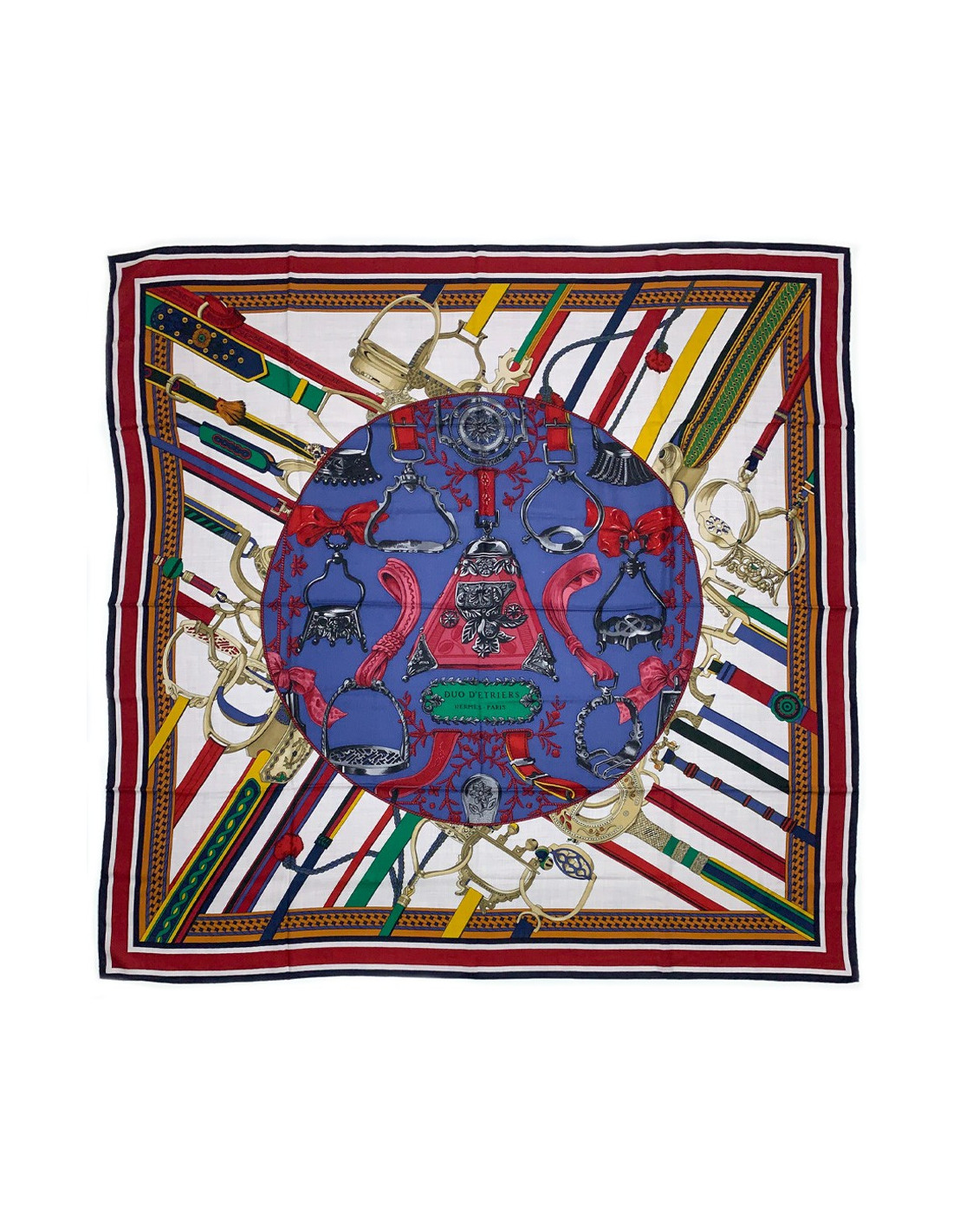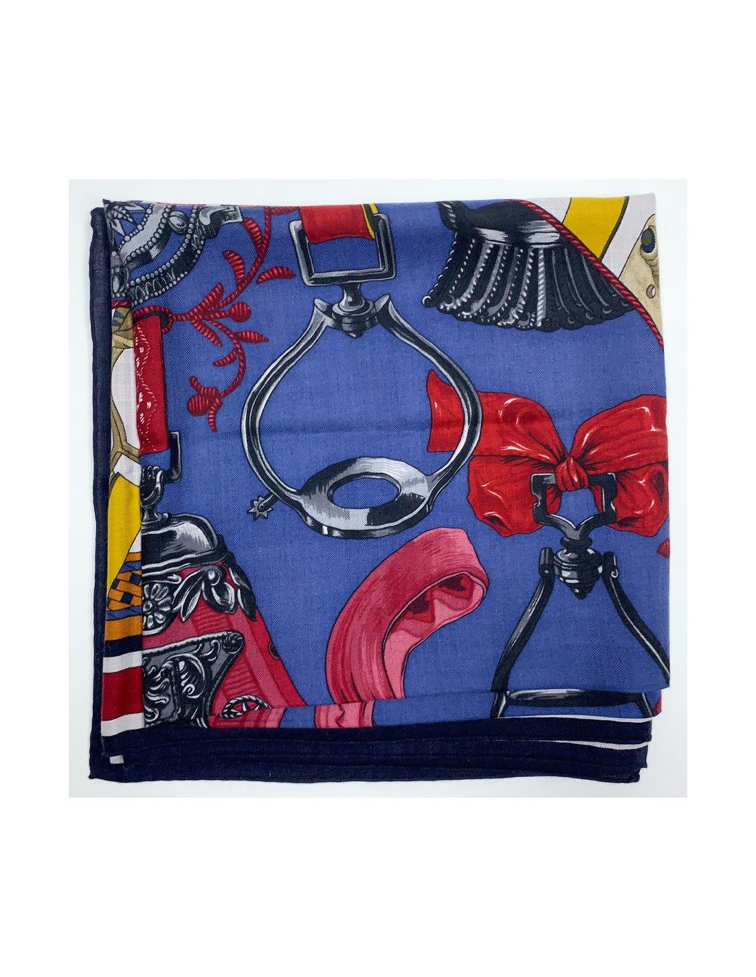 Le châle est de la Maison HERMES. Il a été dessiné en collaboration par Françoise de la Perrière et Virginie Jamin. Ses couleurs dominantes sont le bordeaux, le jaune et le bleu et son motif central comme l'indique son nom, est un étrier que l'on retrouve conjugué sous différentes formes et couleurs de part et d'autres du châle.