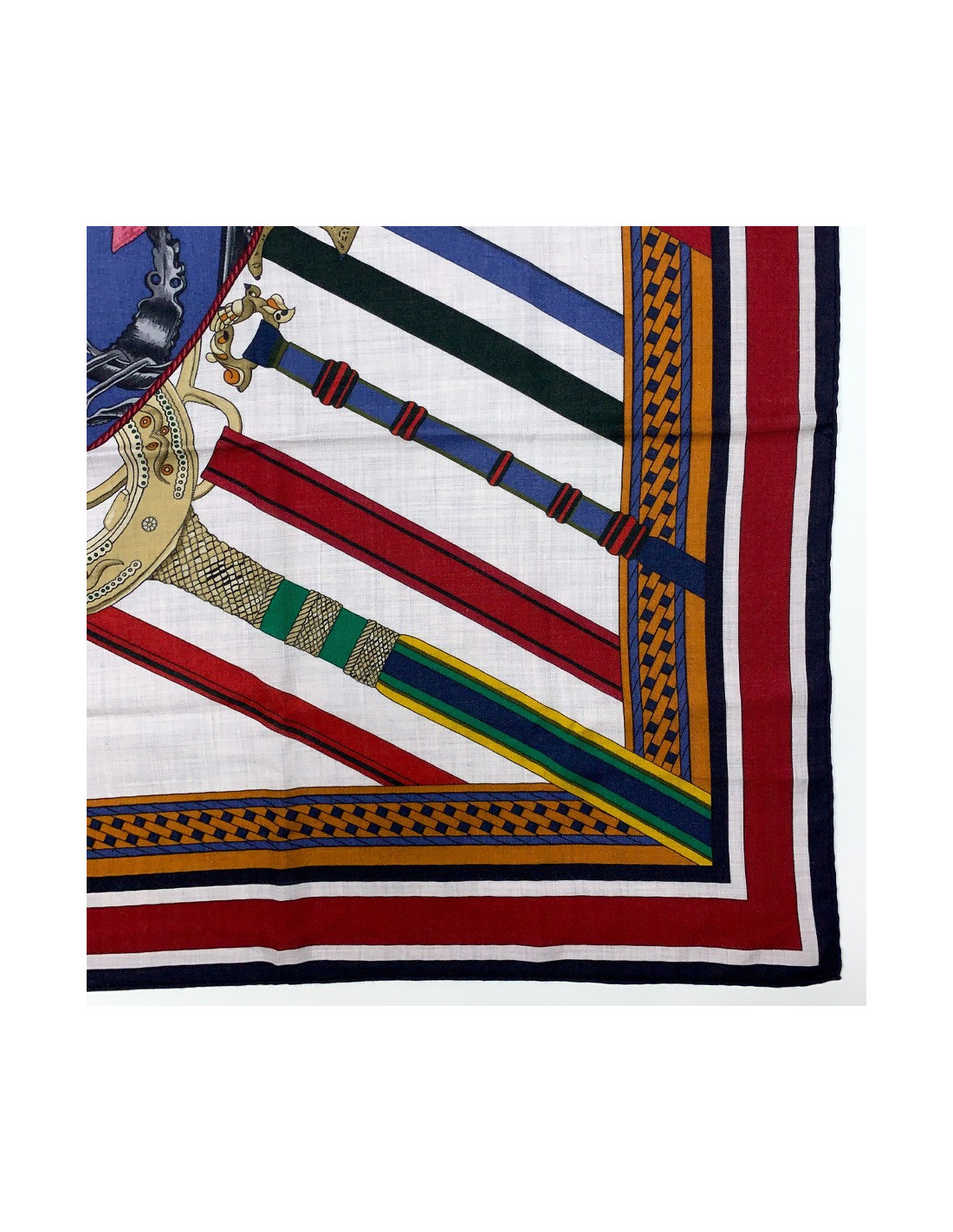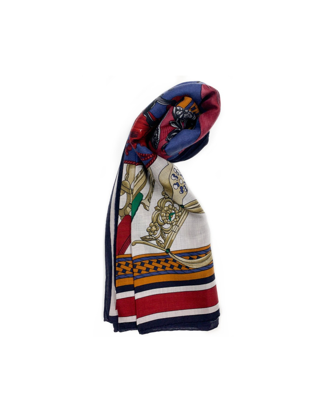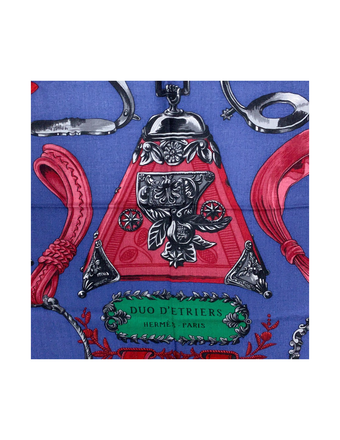 Le châle est de la Maison HERMES. Il a été dessiné en collaboration par Françoise de la Perrière et Virginie Jamin. Ses couleurs dominantes sont le bordeaux, le jaune et le bleu et son motif central comme l'indique son nom, est un étrier que l'on retrouve conjugué sous différentes formes et couleurs de part et d'autres du châle.