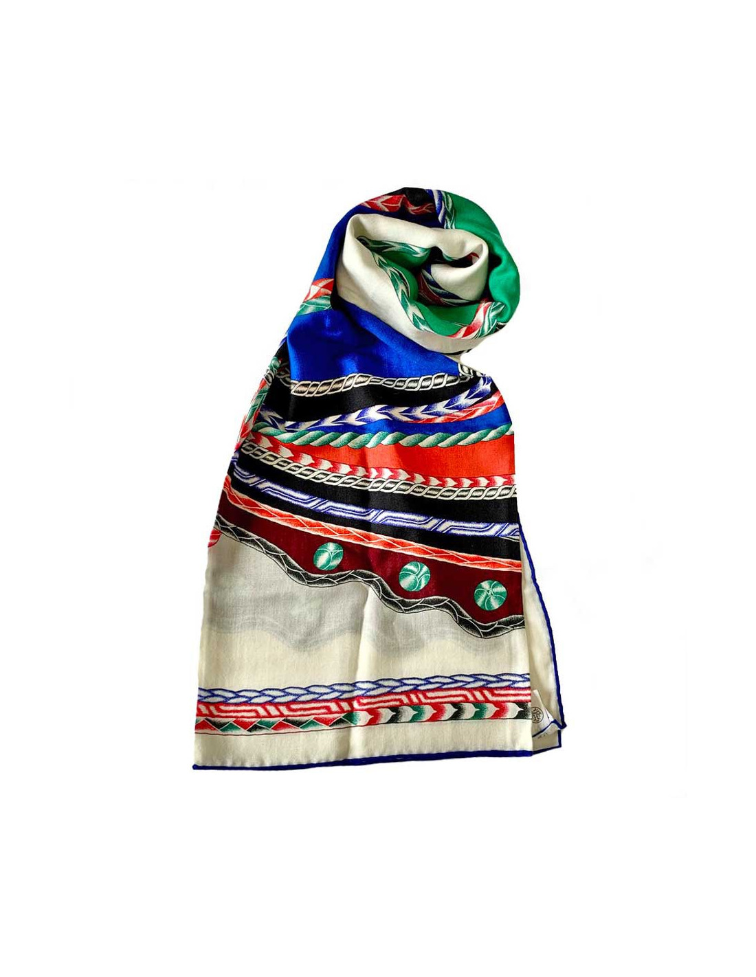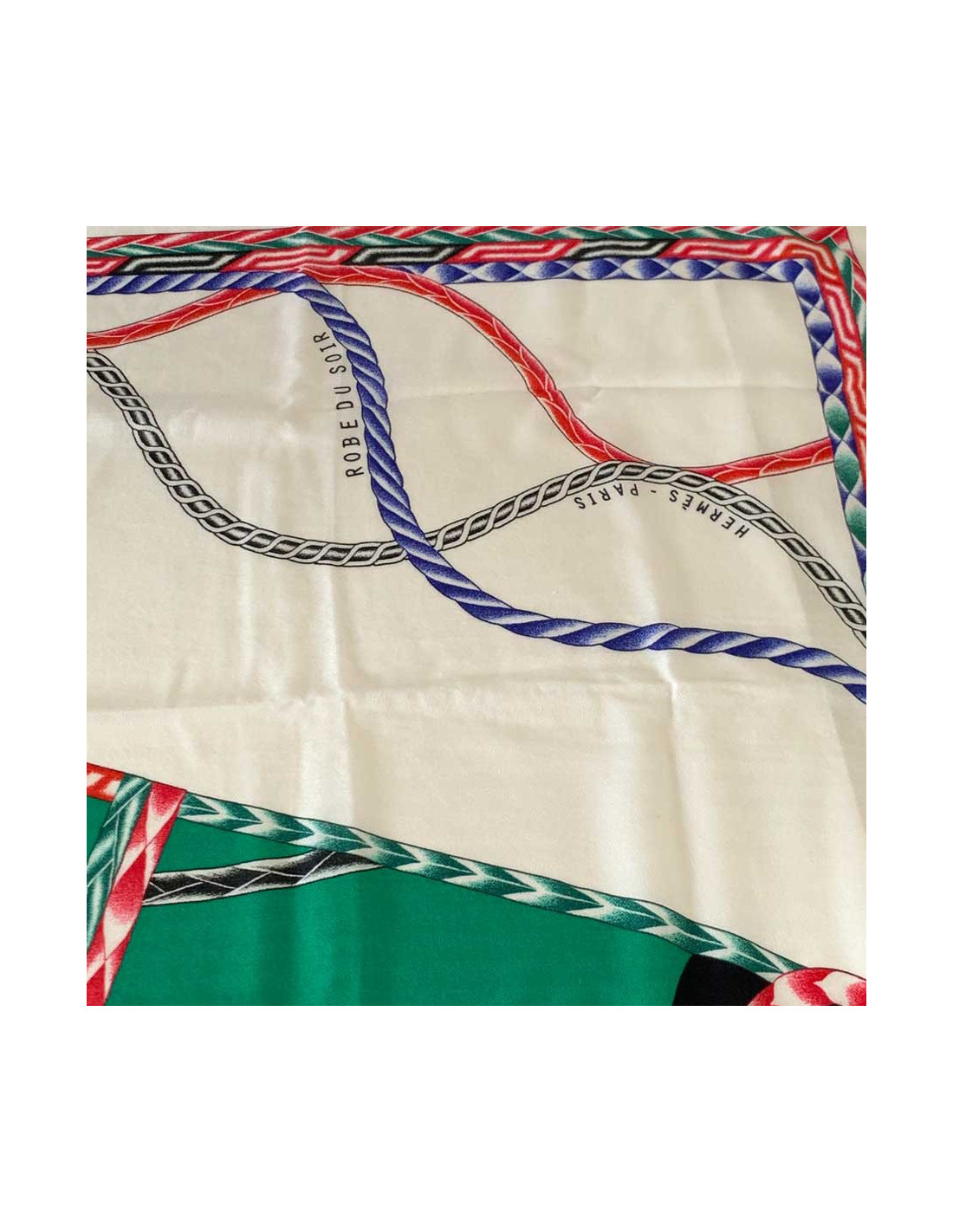 Le châle est de la Maison HERMES et s'intitulé "Robe du soir". Il a été dessiné par F. Hanlik qui propose là un cheval, animal fétiche de la marque. Il se décline dans les tons de bleu, rouge, vert, noir et blanc.