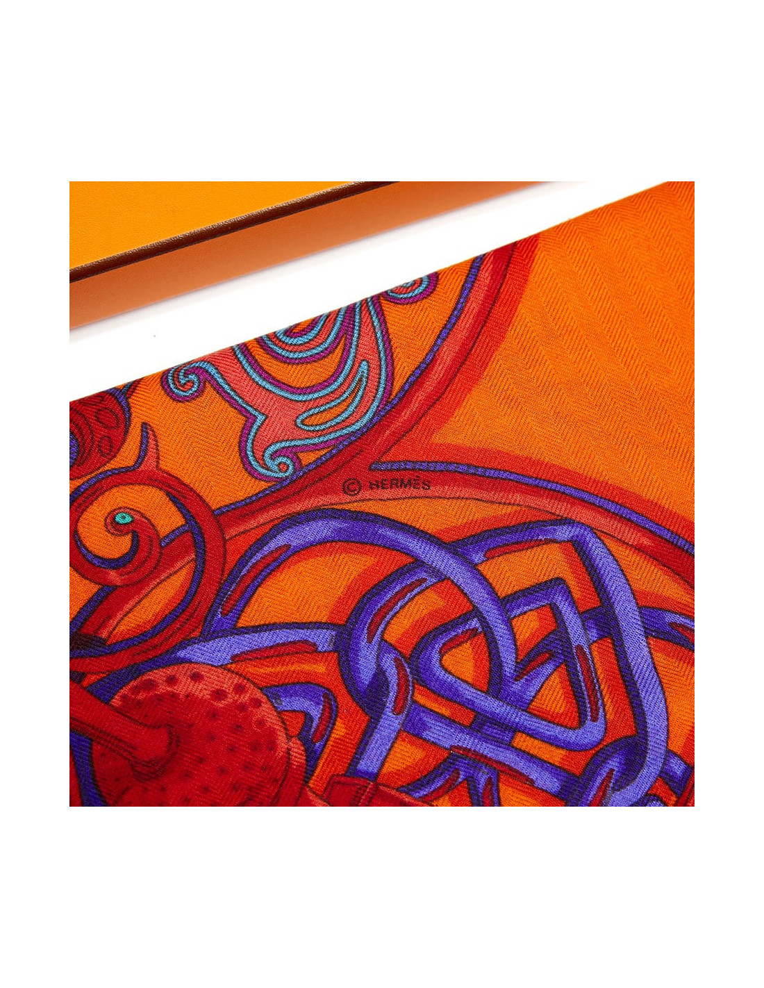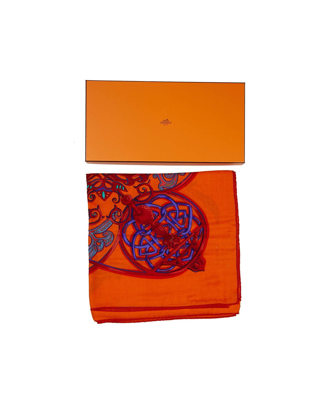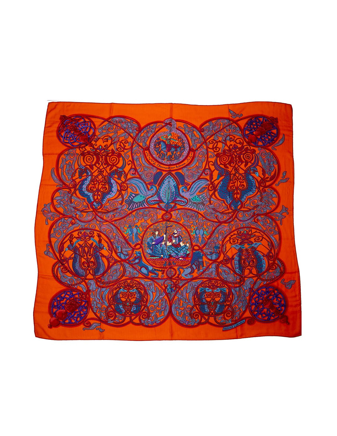 Très grand châle en cachemire et soie de la Maison Hermes dessine par Annie Faivre. La couleur dominante est le orange avec une pointe de rouge et bleu. Aucune usure.