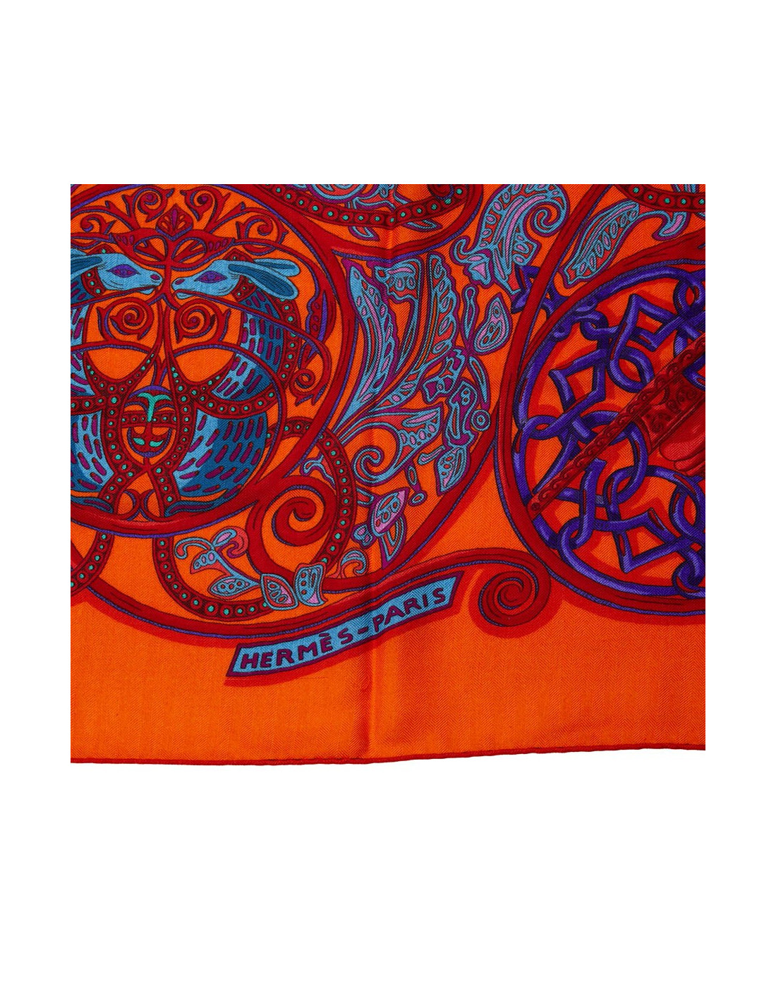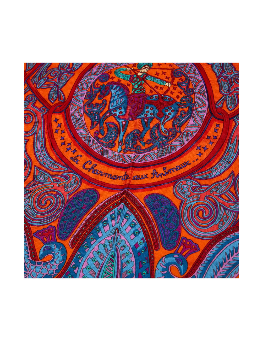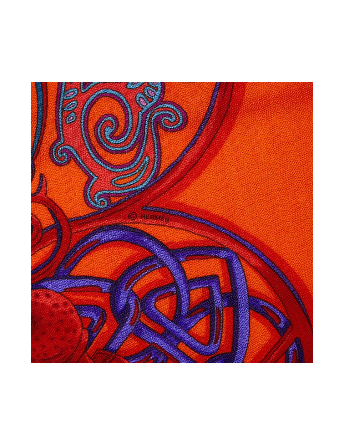 Très grand châle en cachemire et soie de la Maison Hermes dessine par Annie Faivre. La couleur dominante est le orange avec une pointe de rouge et bleu. Aucune usure.