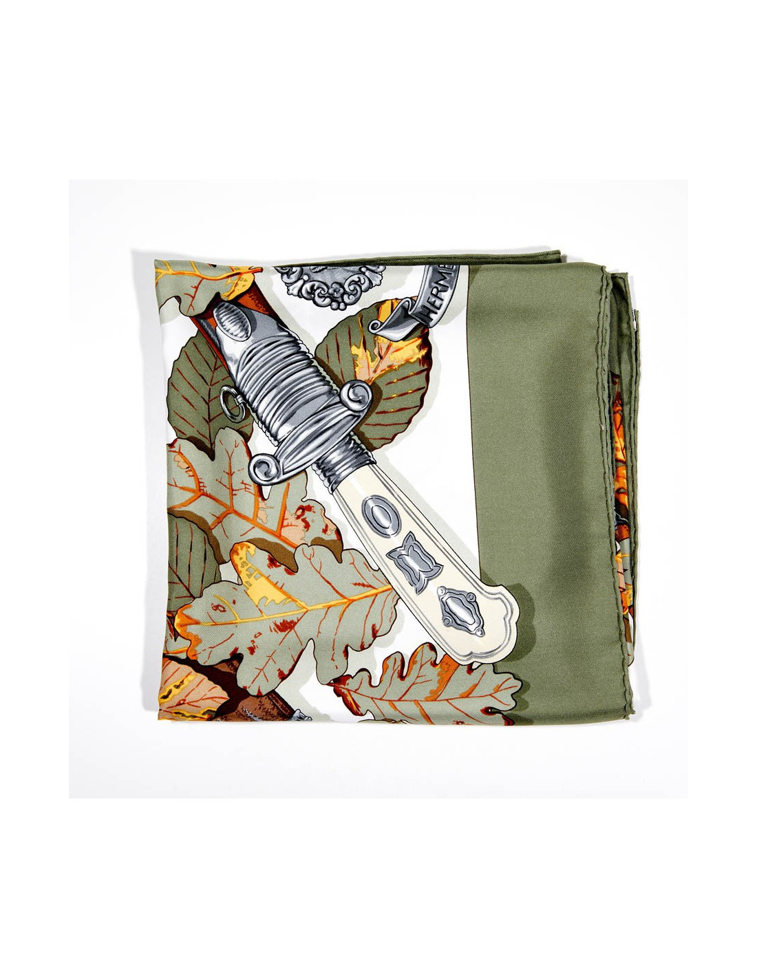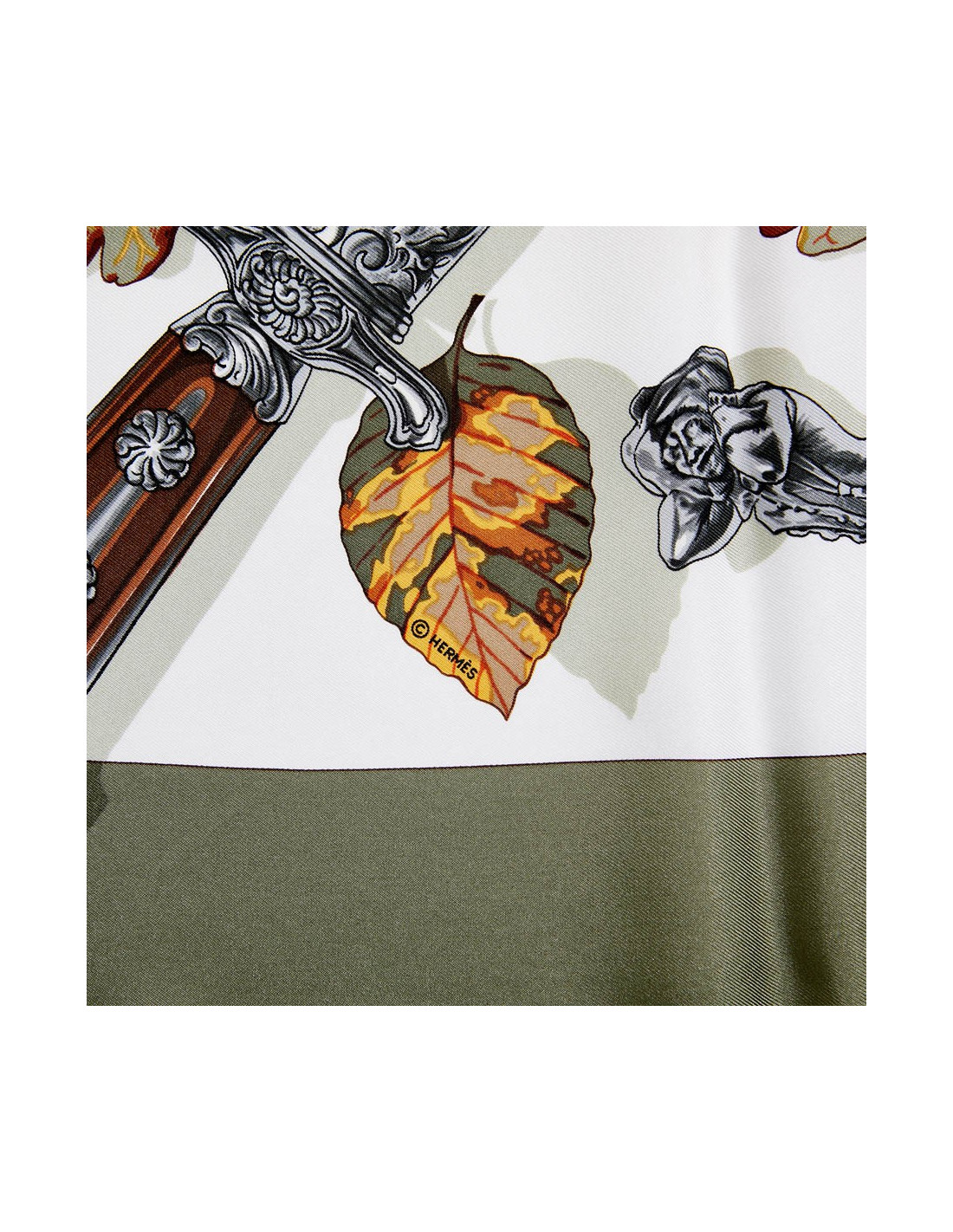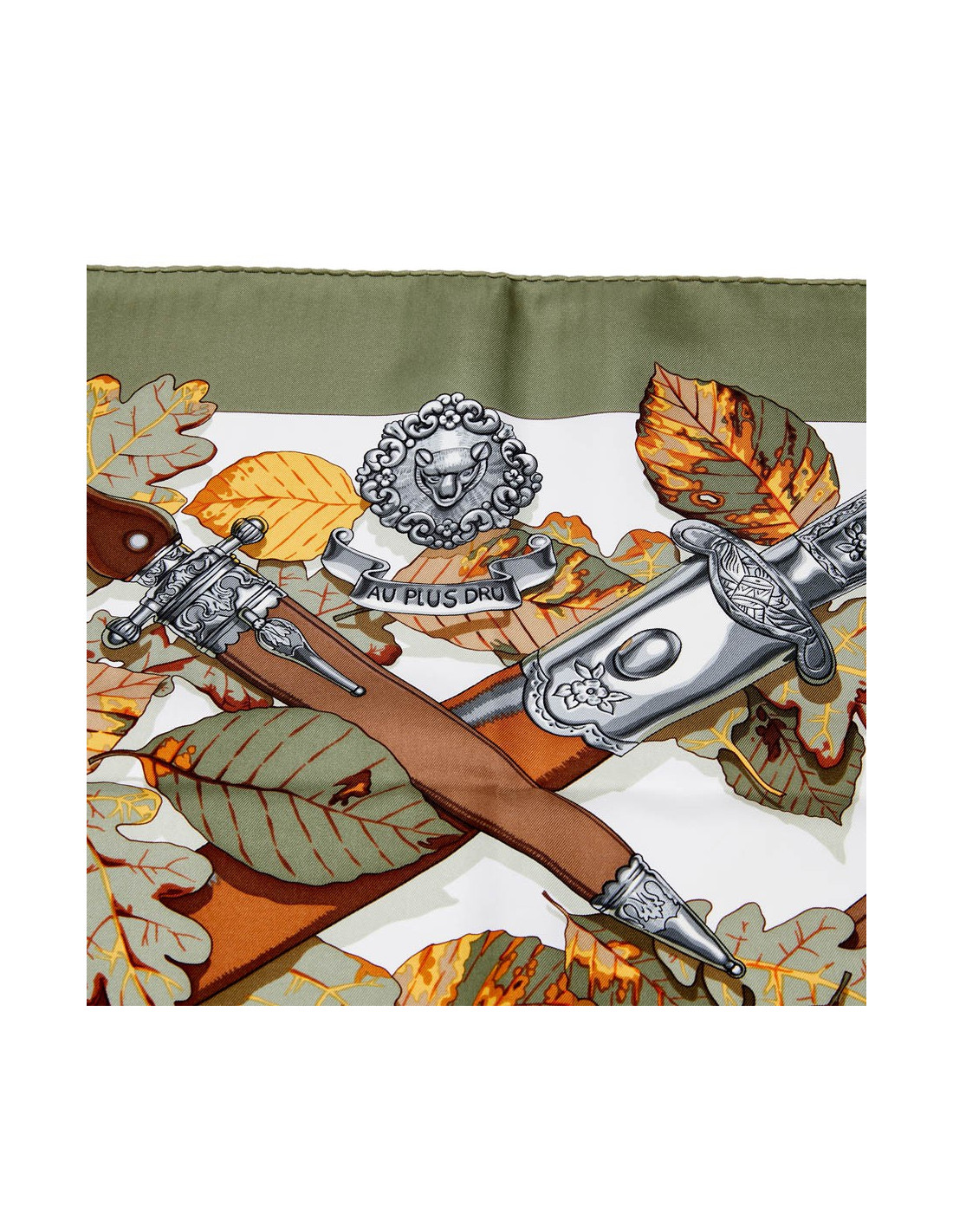 Carré Hermès, 90 x 90 cm en soie 100 %. Le motif : Au plus dru", a été dessiné par Vladimir Rybaltchenko en 1998. C'est la devise qui orne la garde en argent d'une dague de vénerie due au joaillier Froment-Meurice (collection Hermès du 19e siècle). Carré jamais réédité.
