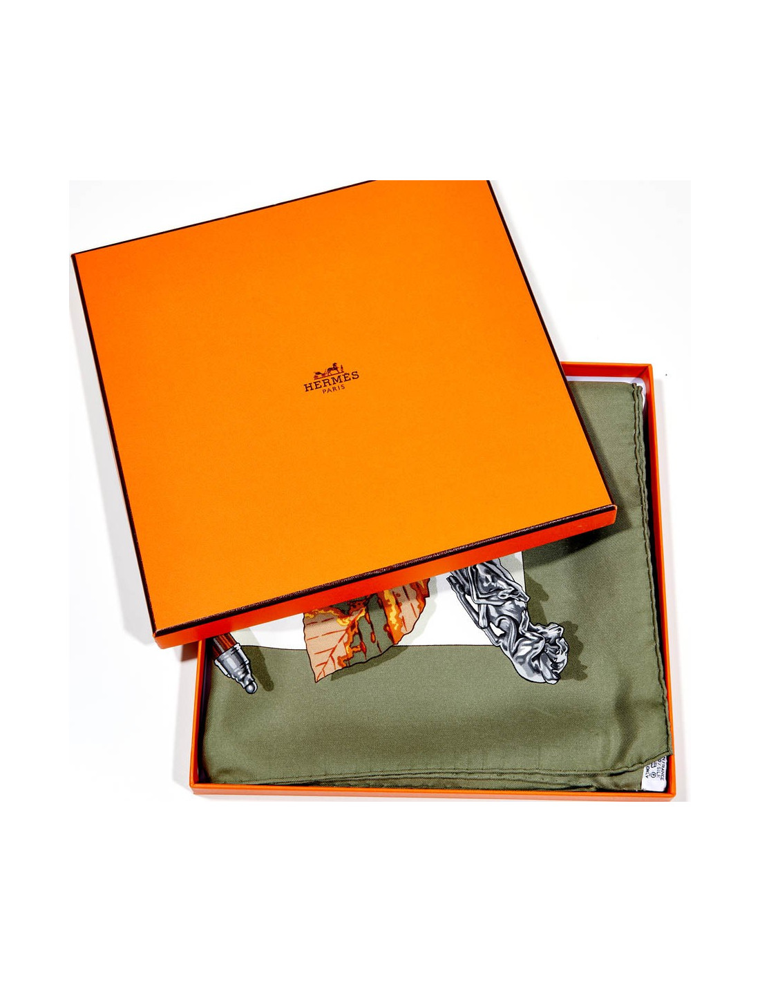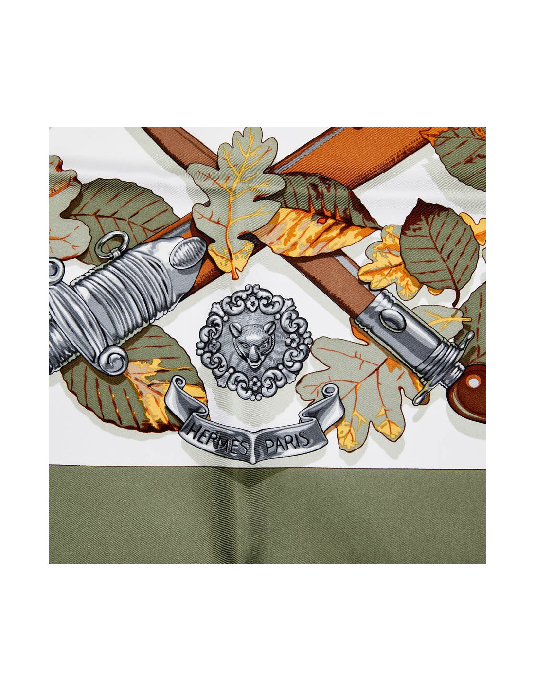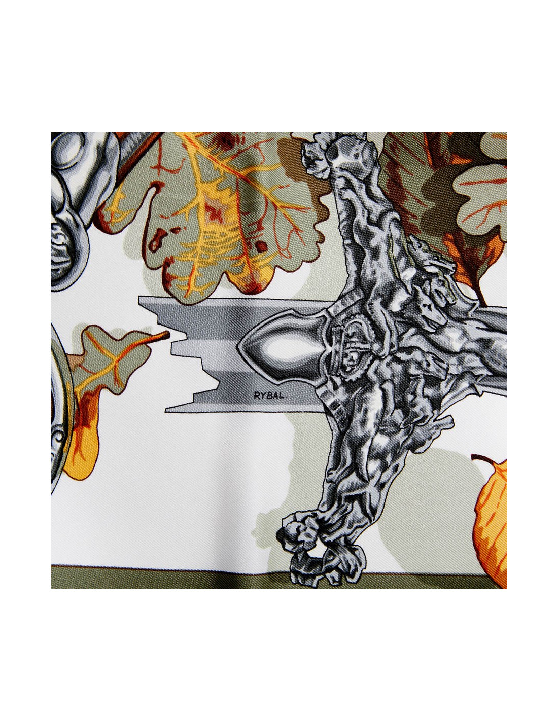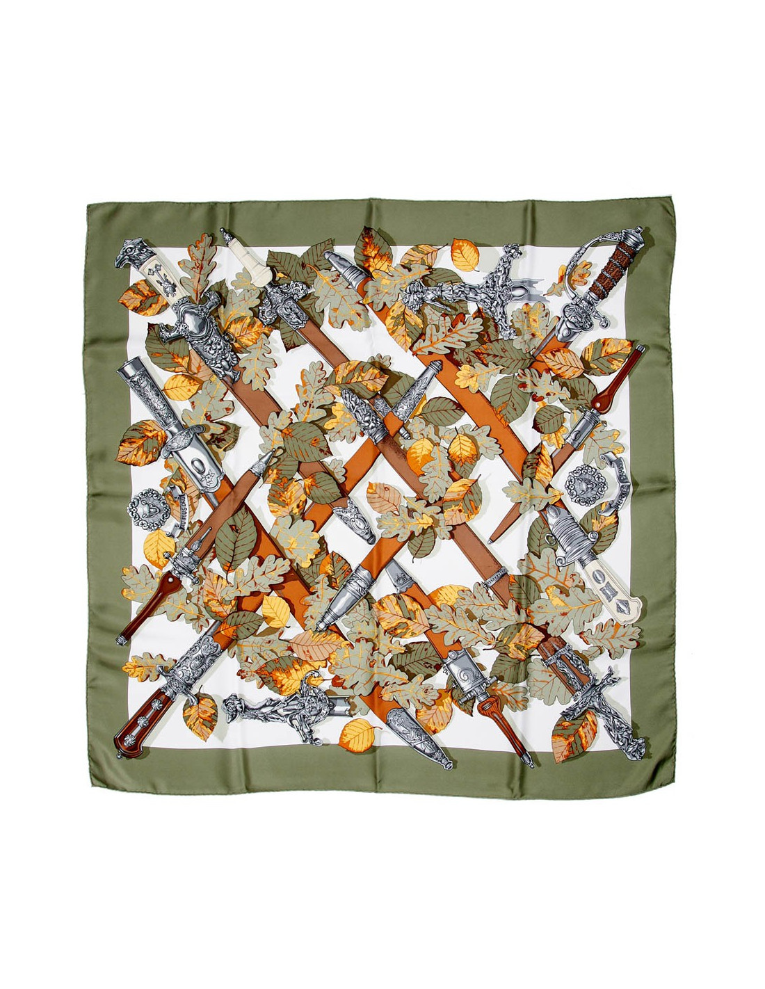 Carré Hermès, 90 x 90 cm en soie 100 %. Le motif : Au plus dru", a été dessiné par Vladimir Rybaltchenko en 1998. C'est la devise qui orne la garde en argent d'une dague de vénerie due au joaillier Froment-Meurice (collection Hermès du 19e siècle). Carré jamais réédité.