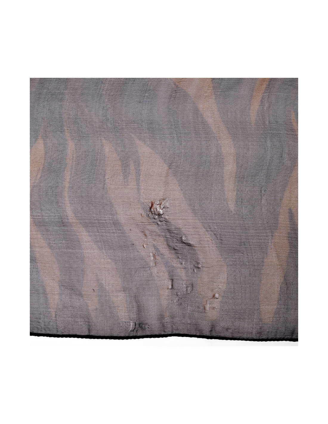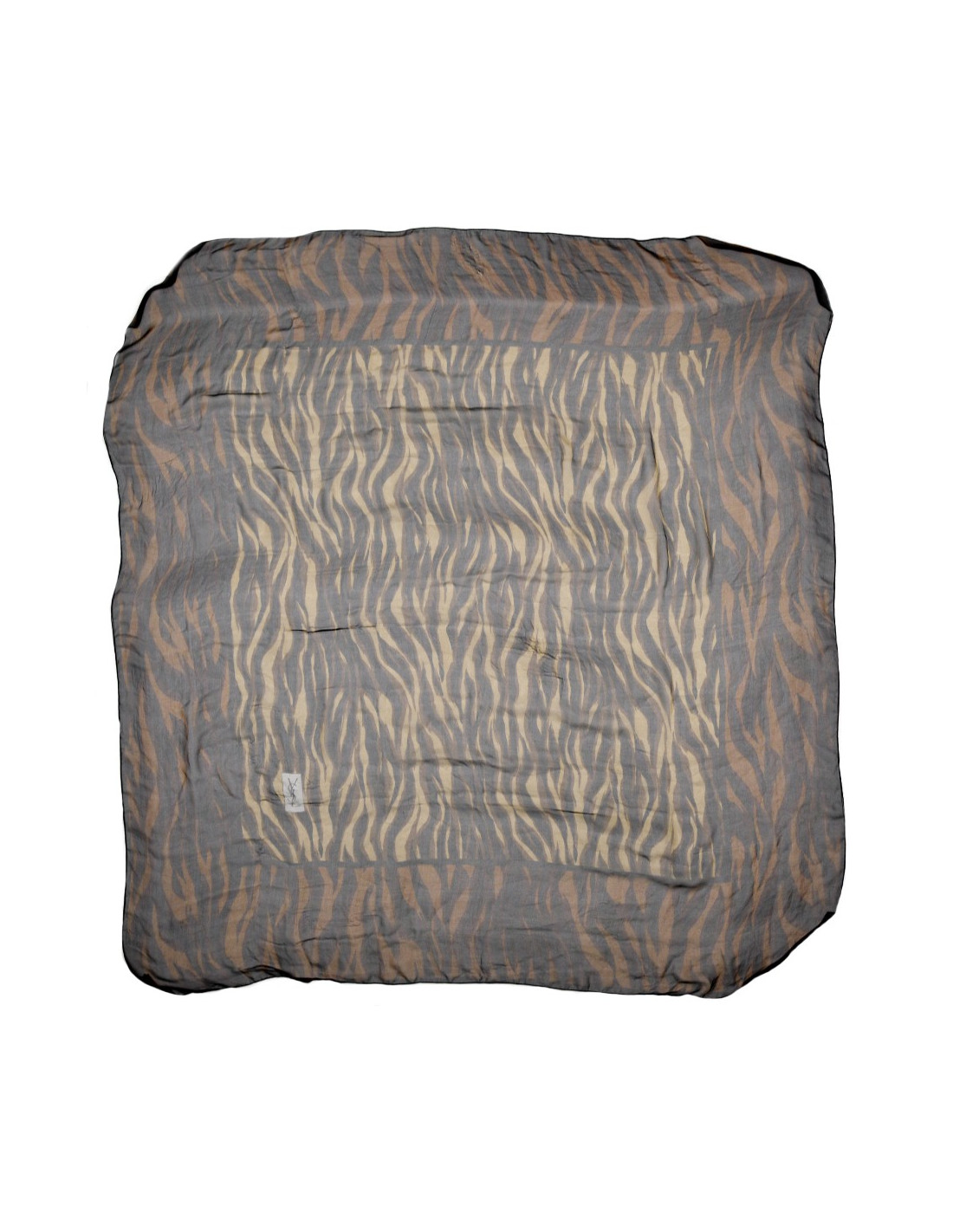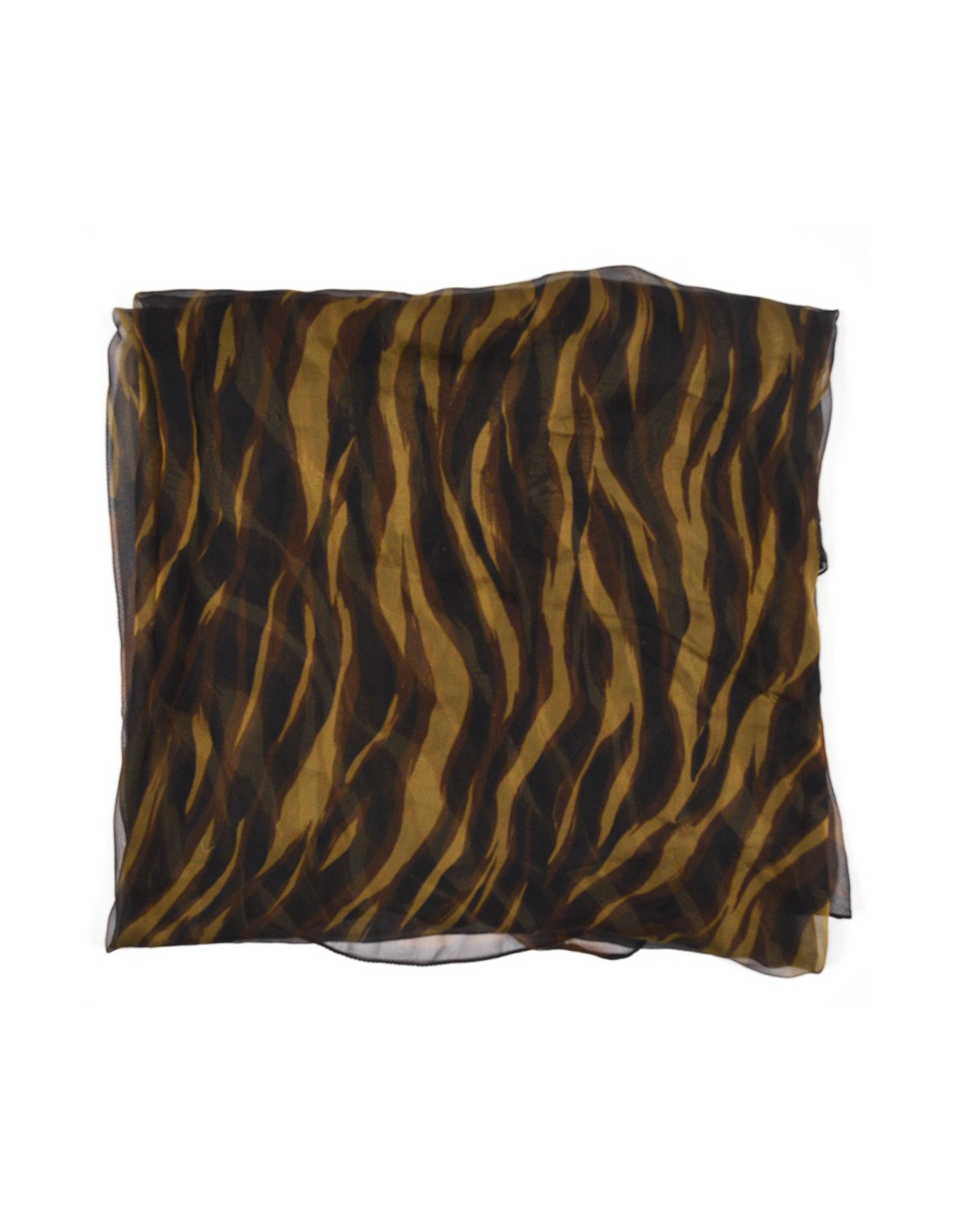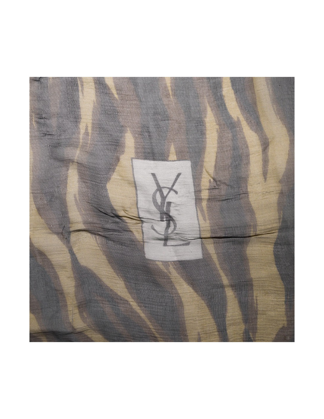 Le foulard est de la Maison YVES SAINT LAURENT. Il représente un voile de soie zébré dans les tons de marron et noir. Optez pour le look animal chic ! Présence du logo YSL.