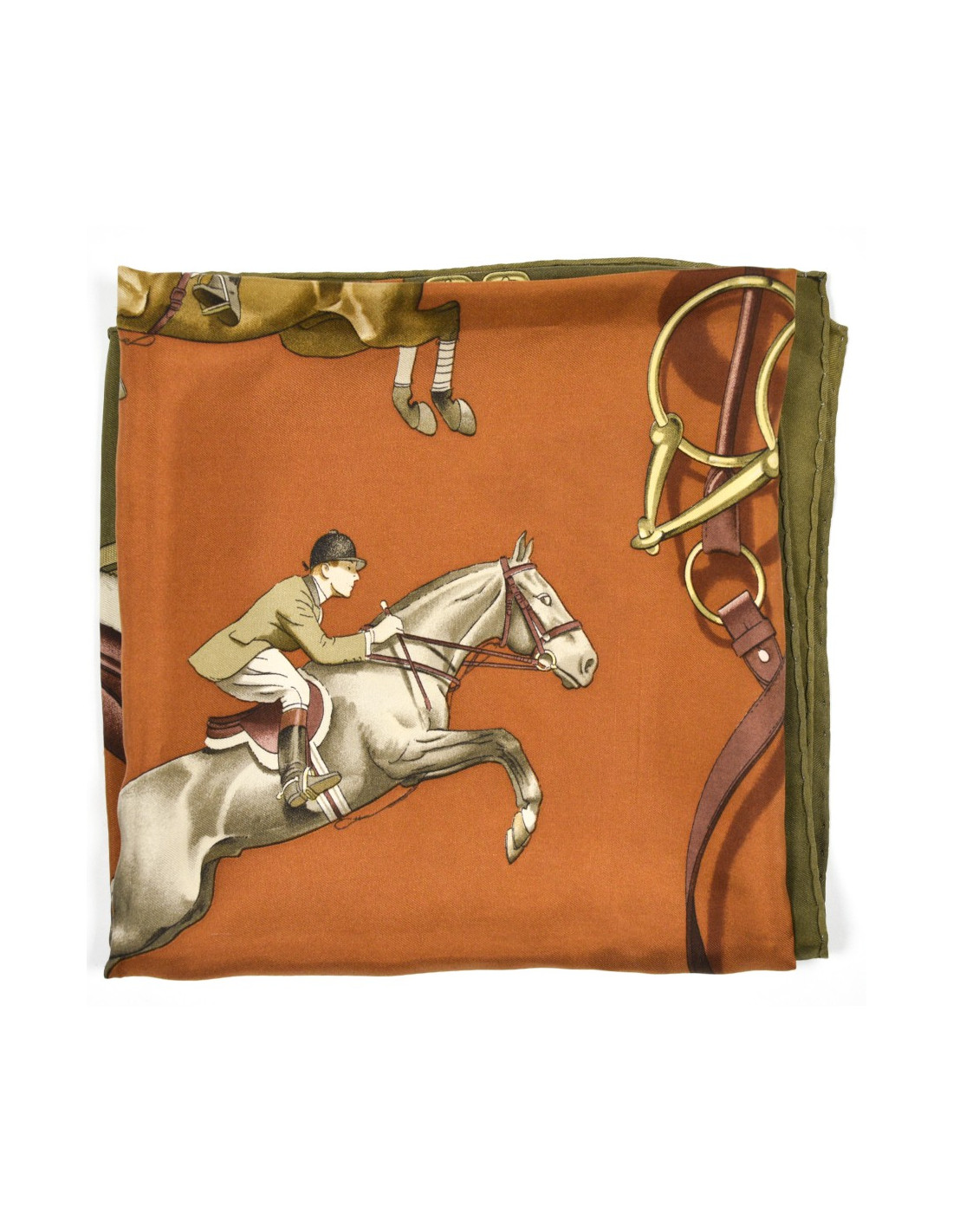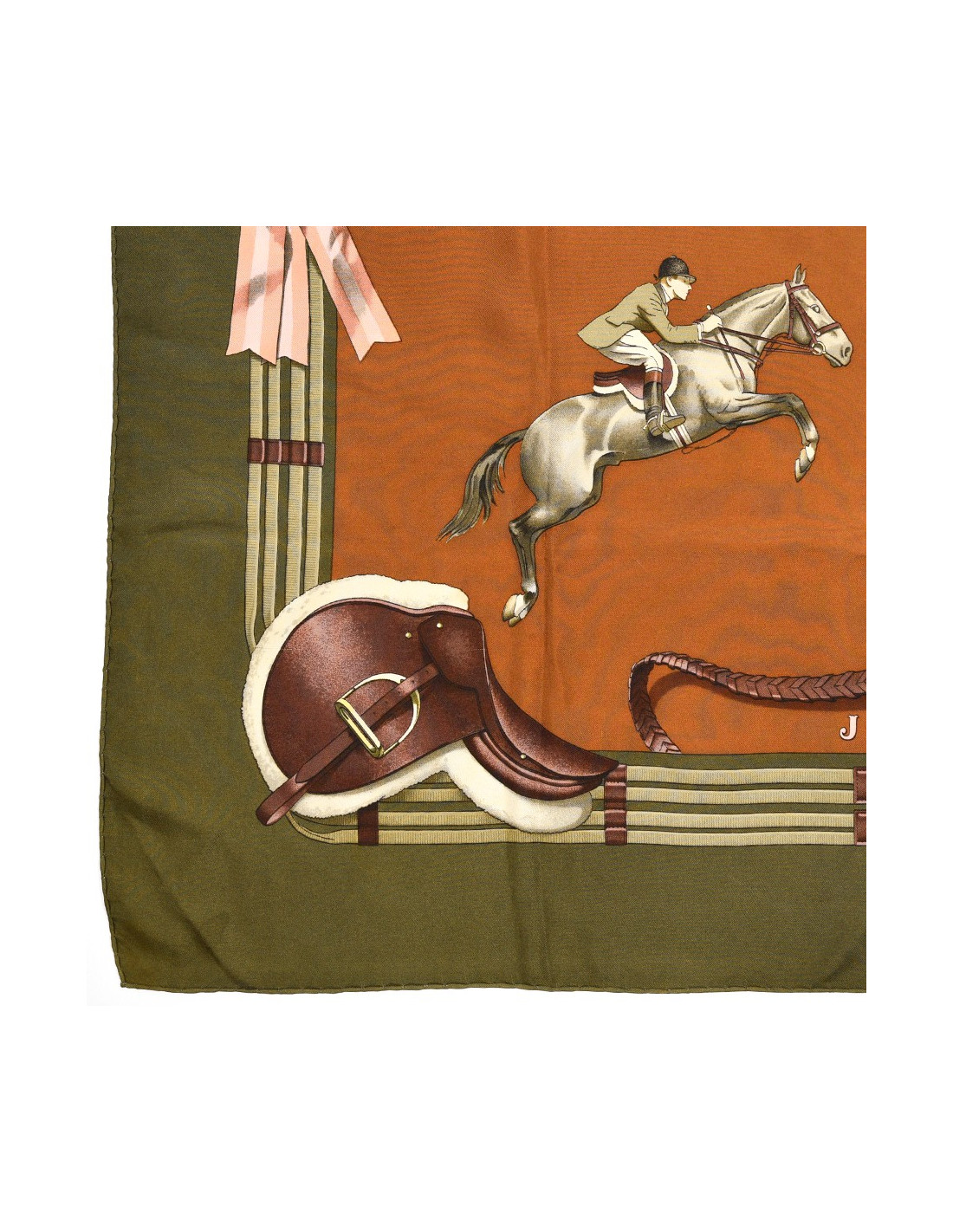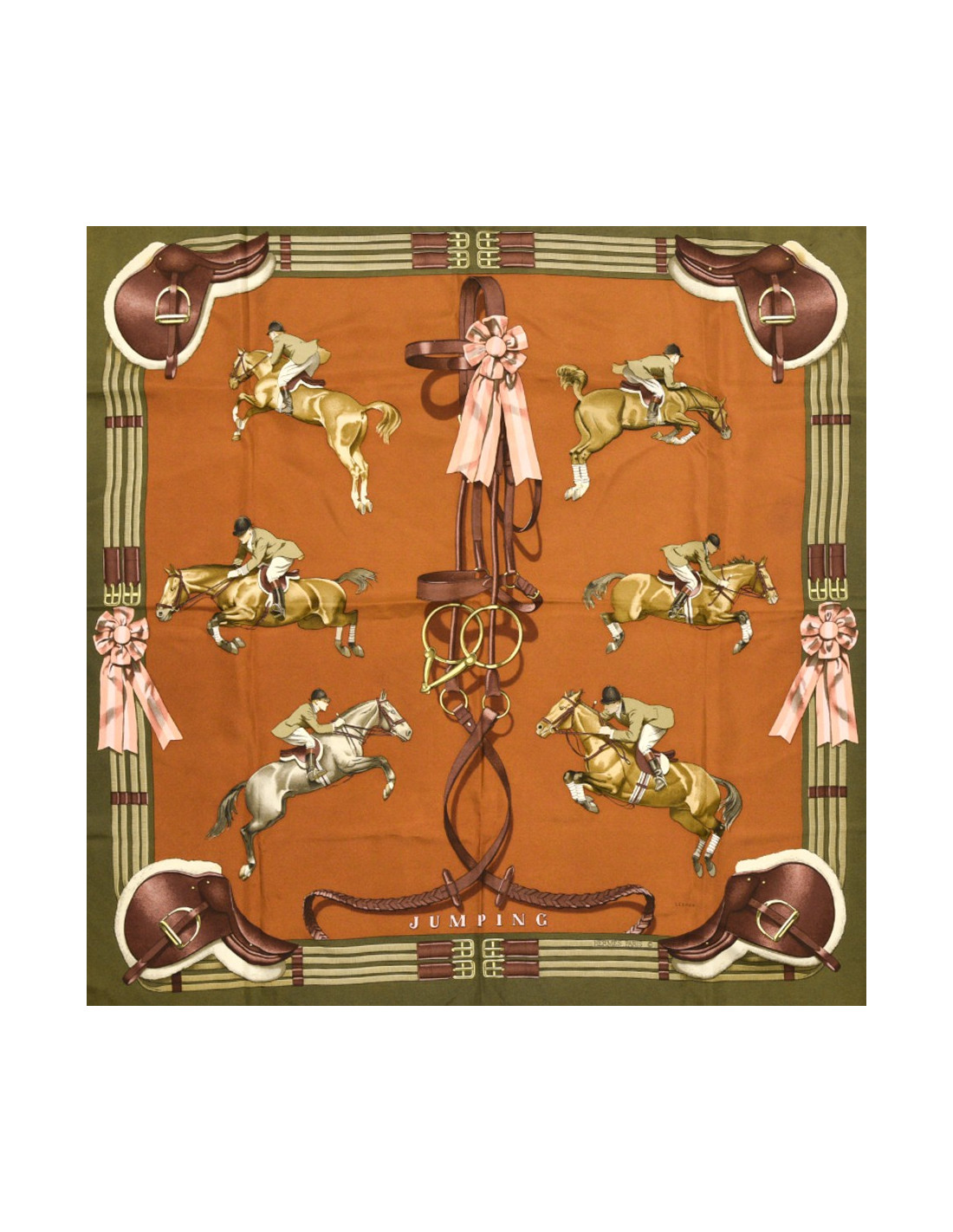 Le foulard provient de la Maison HERMÈS. Dessiné par Philippe Ledoux en 1971, le carré nous propose six chevaux en plein saut. Ici, le foulard est décliné dans les couleurs de kaki, marron et rose.