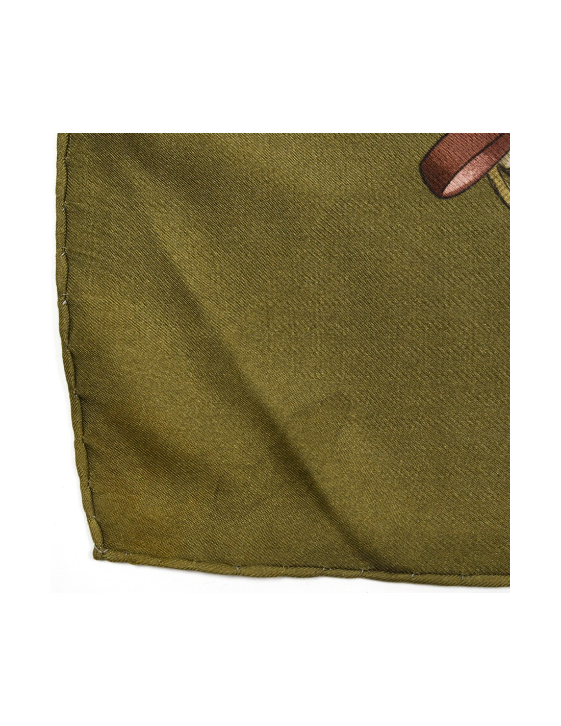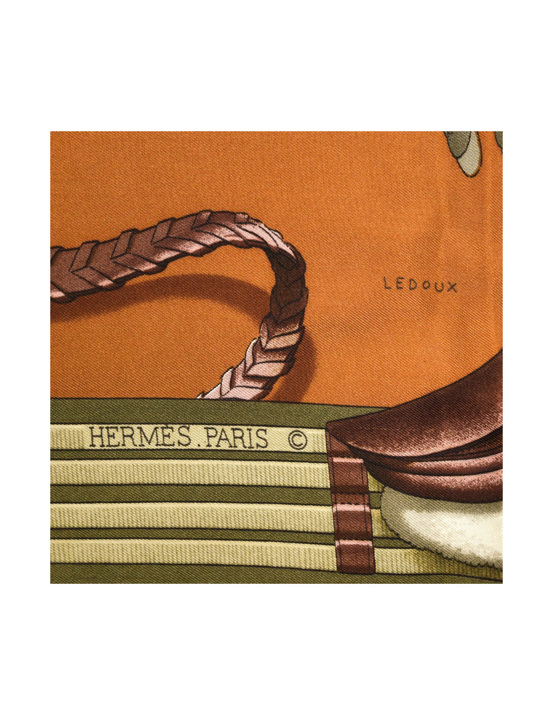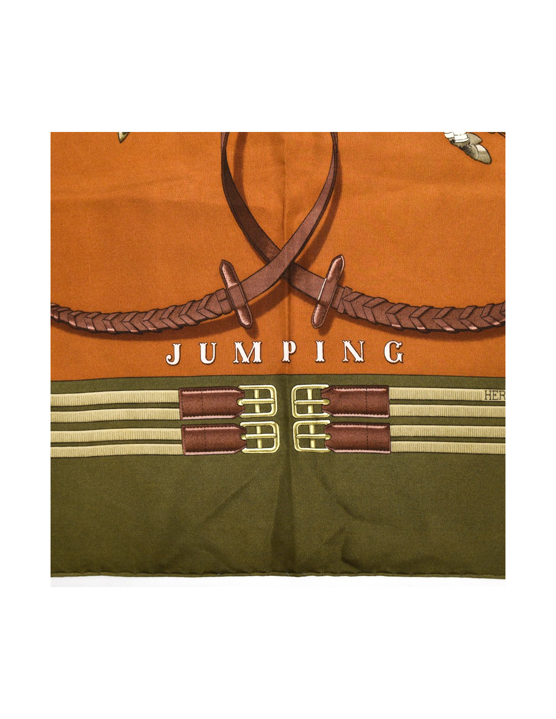Le foulard provient de la Maison HERMÈS. Dessiné par Philippe Ledoux en 1971, le carré nous propose six chevaux en plein saut. Ici, le foulard est décliné dans les couleurs de kaki, marron et rose.