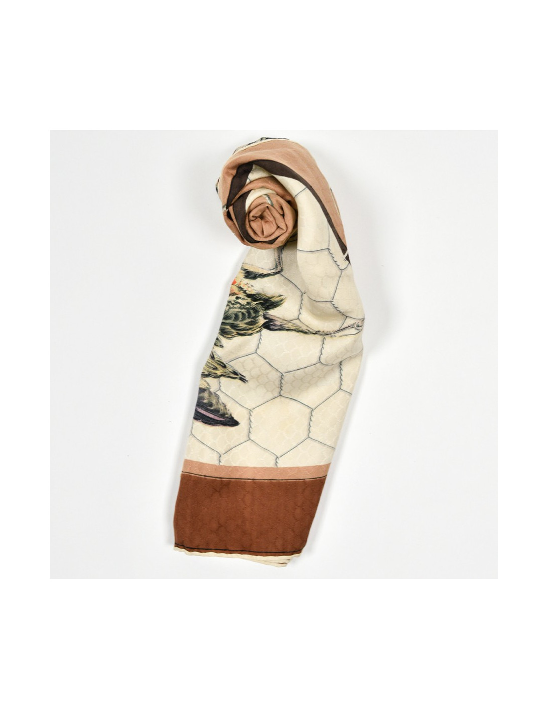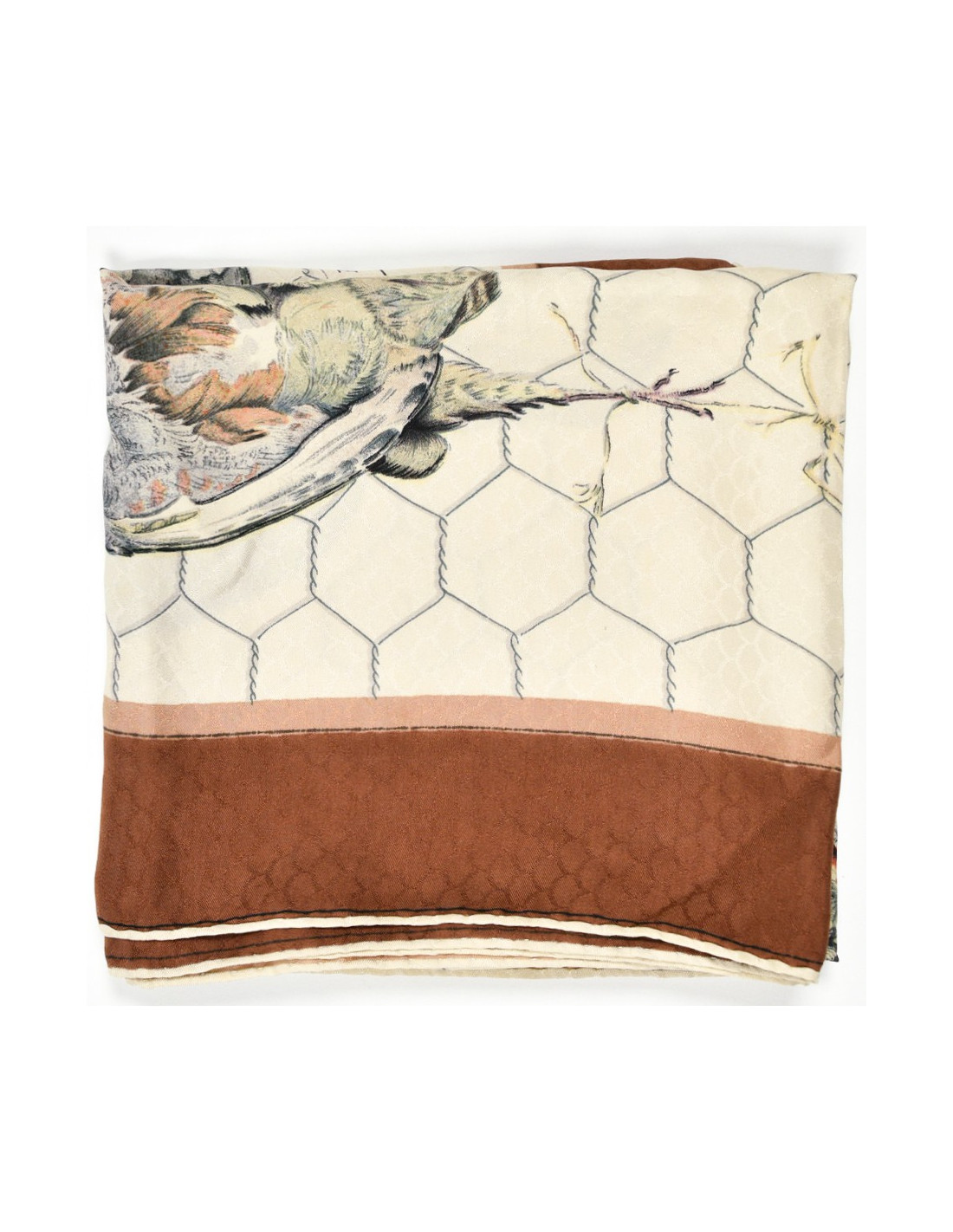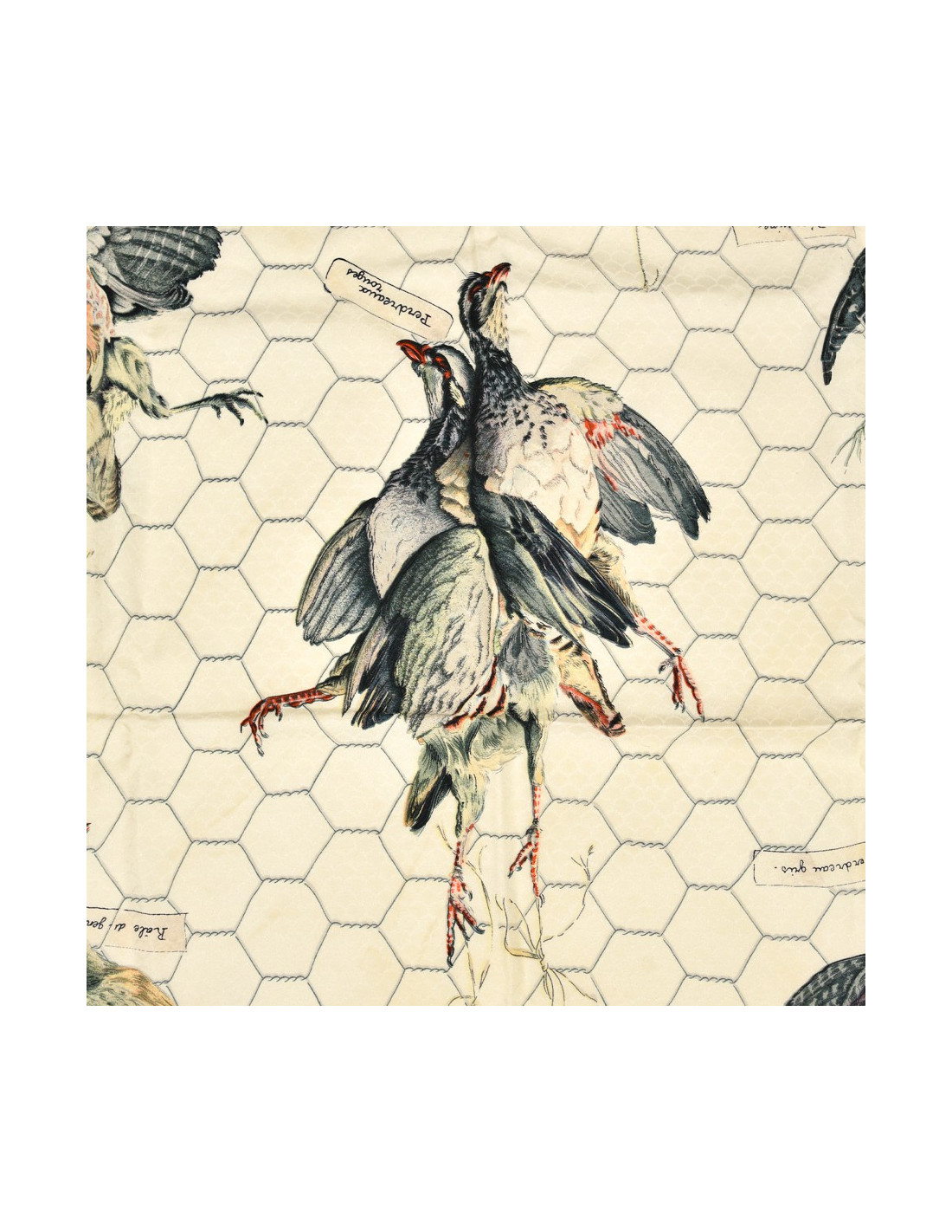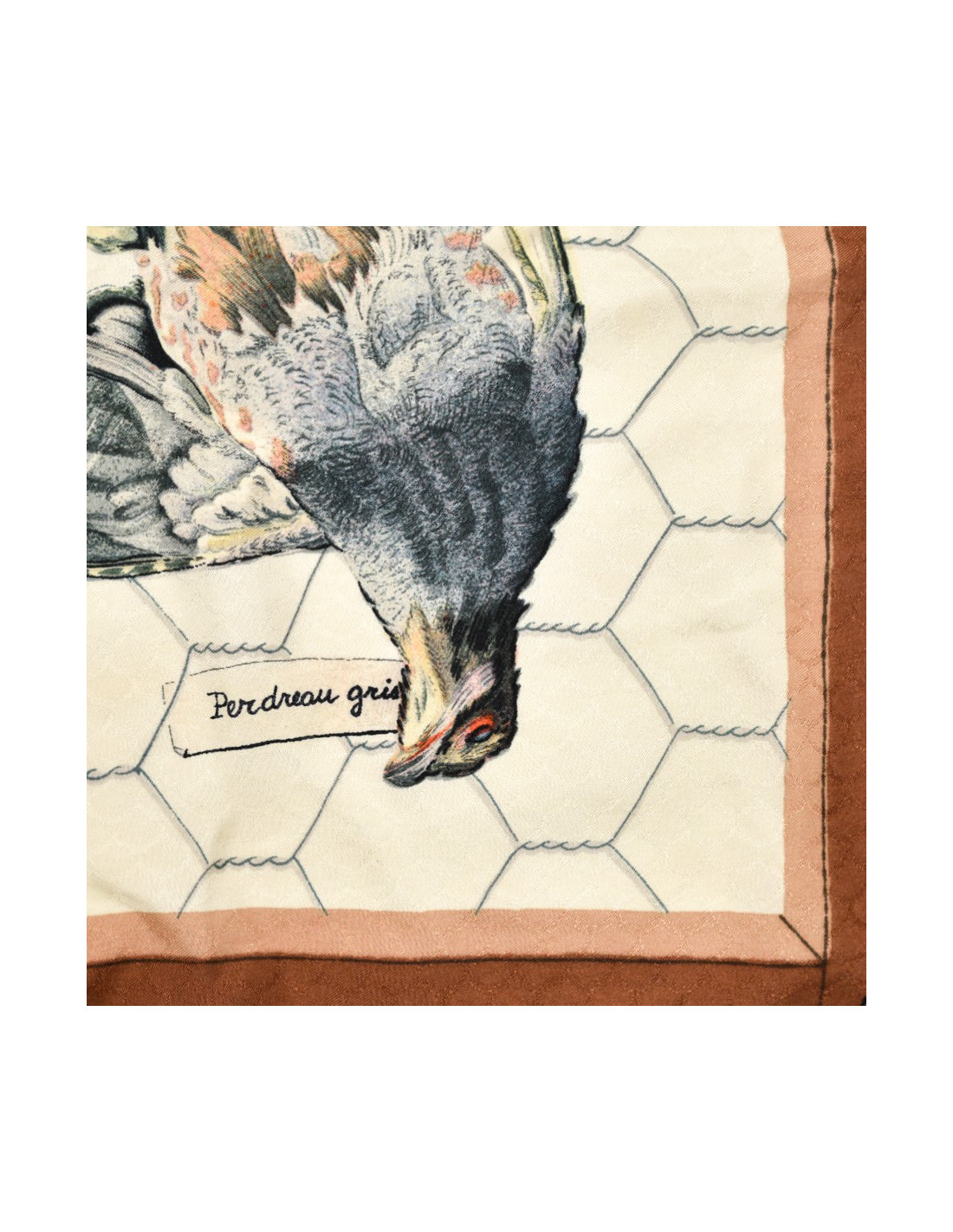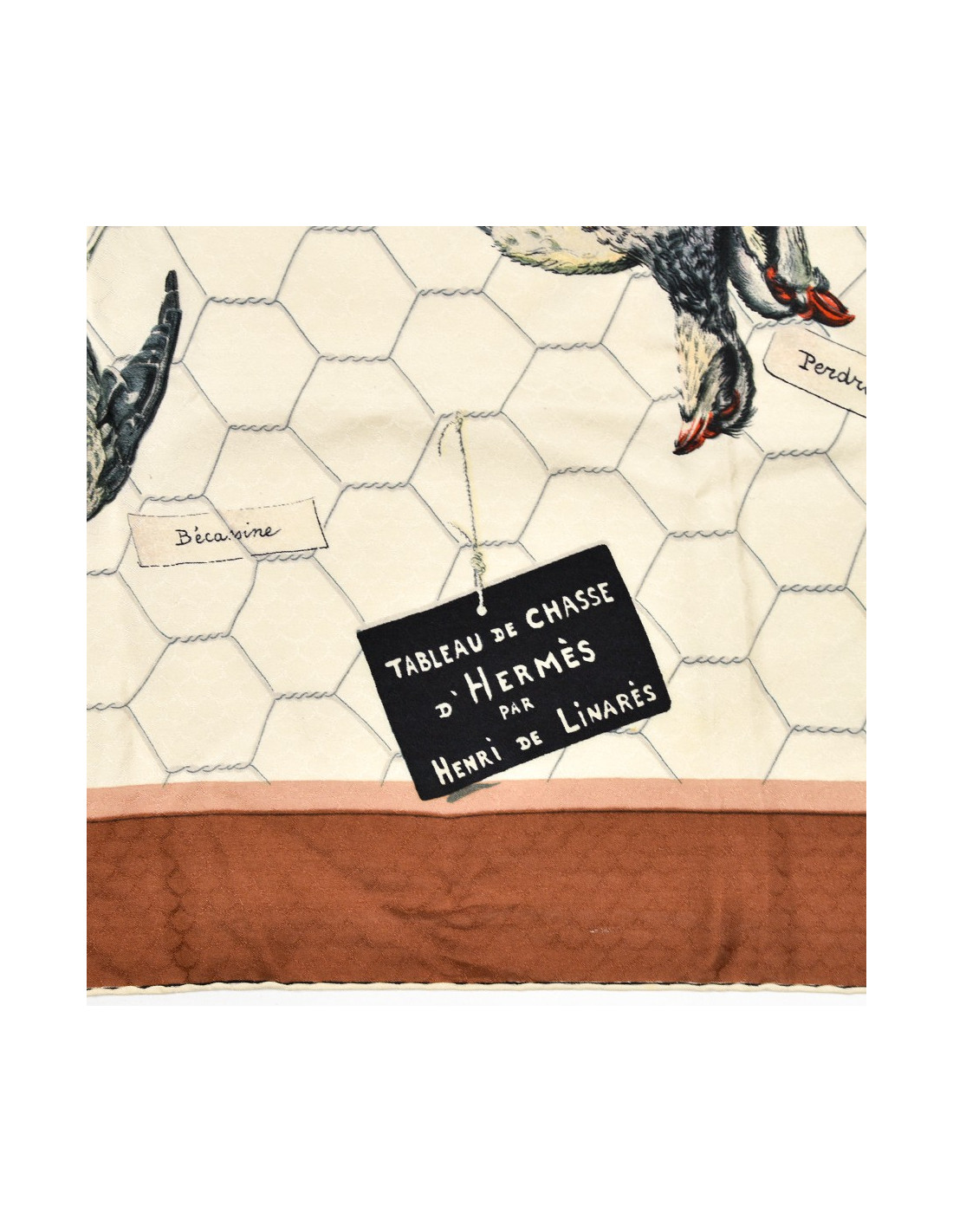 Le carré provient de la Maison HERMES. Il a été dessiné par Henri de Linarès en 1950 et s'intitule comme nous le voyons au bas du foulard: "Tableau de chasse". Comme son nom l'indique, il représente un tableau de chasse avec un grillage sur fond blanc et sur lequel sont suspendus des trophées : Bécassine, perdreaux rouges, perdreaux gris, grive, râle des genêts. Le foulard proposé ici dans les tons de vieux rose et marron.