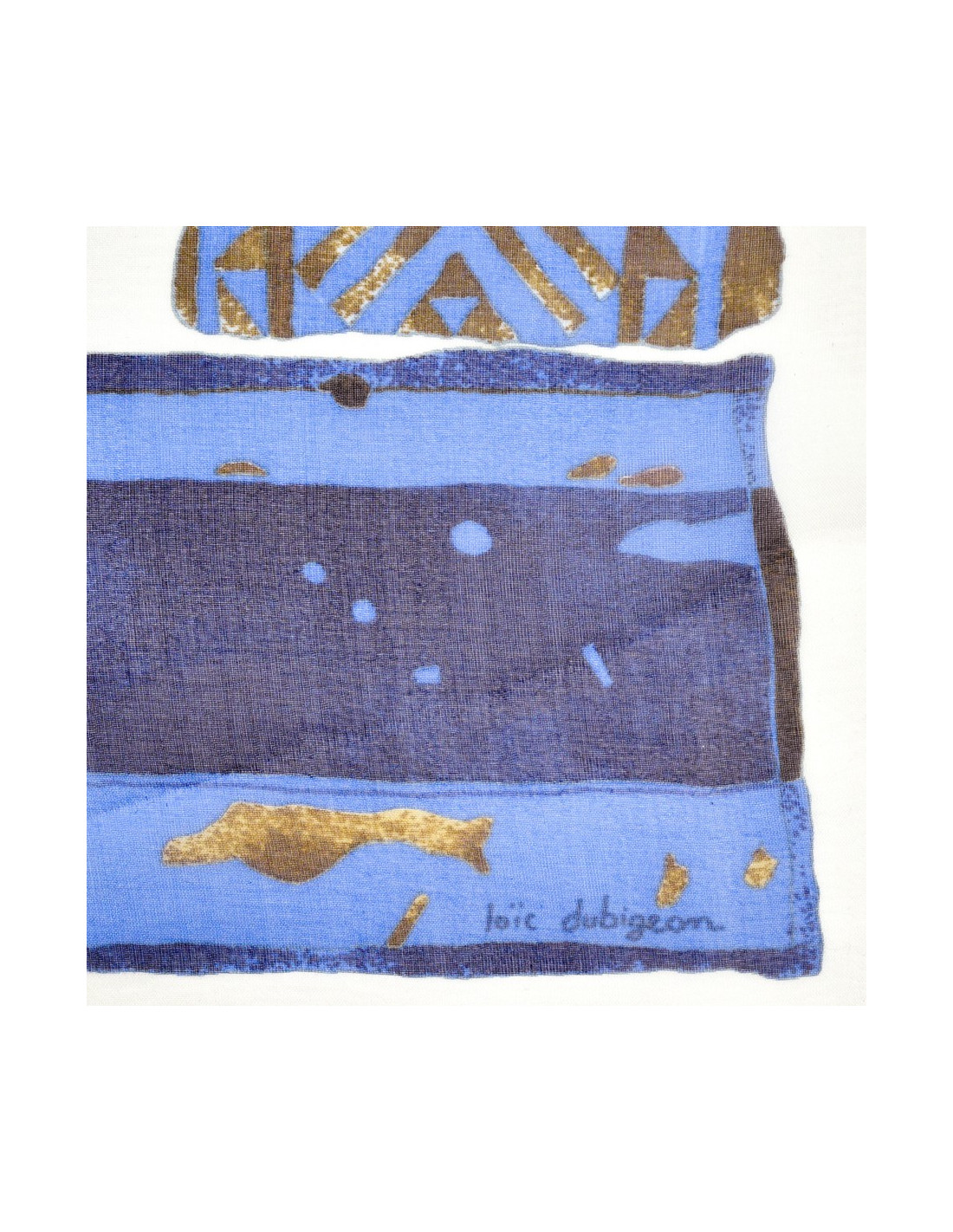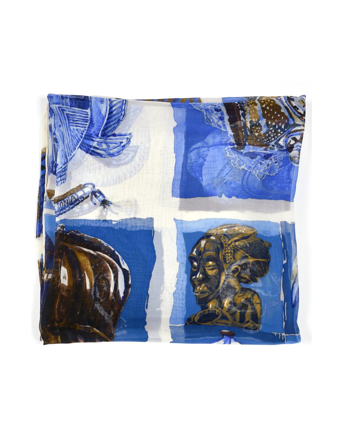Le carré est de la Maison HERMES. Dessiné par Loic Dubigeon qui l'intitule "Persona" en 1997, il représente des masques tribaux sur fond bleu et marron.