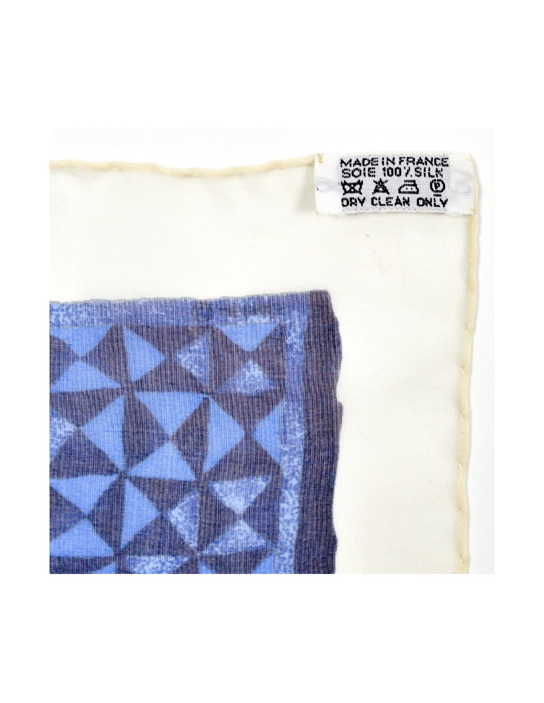 Le carré est en bon état. Seul bémol, une tâche au bas du foulard (cf photo). Autrement le roulotté est impeccable et nous n'observons pas de fil tiré. C'est un carré dont les côtés mesurent 90 centimètres. Présence de l'étiquette matière indiquant qu'il est fait à 100% de soie et qu'il est Made In France.