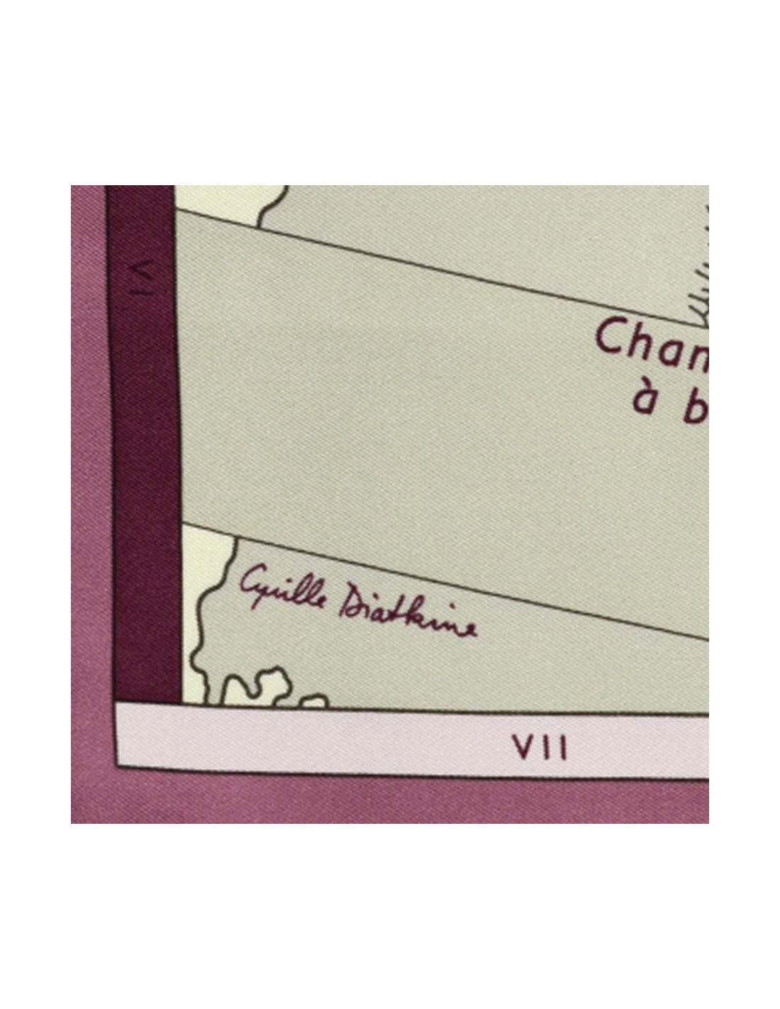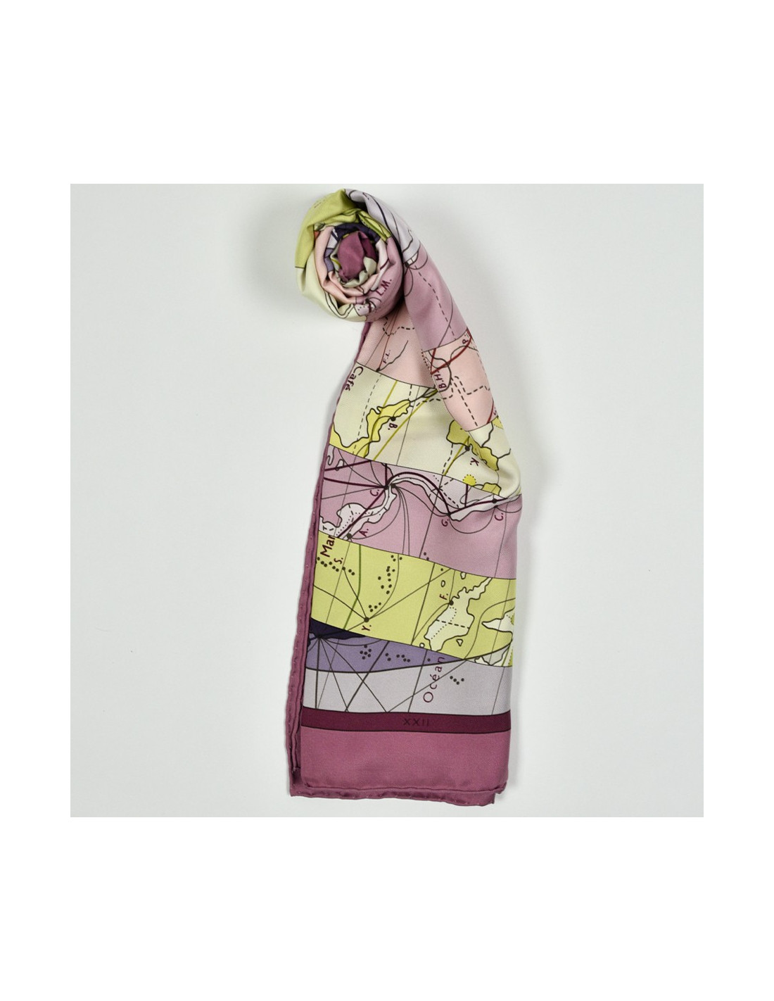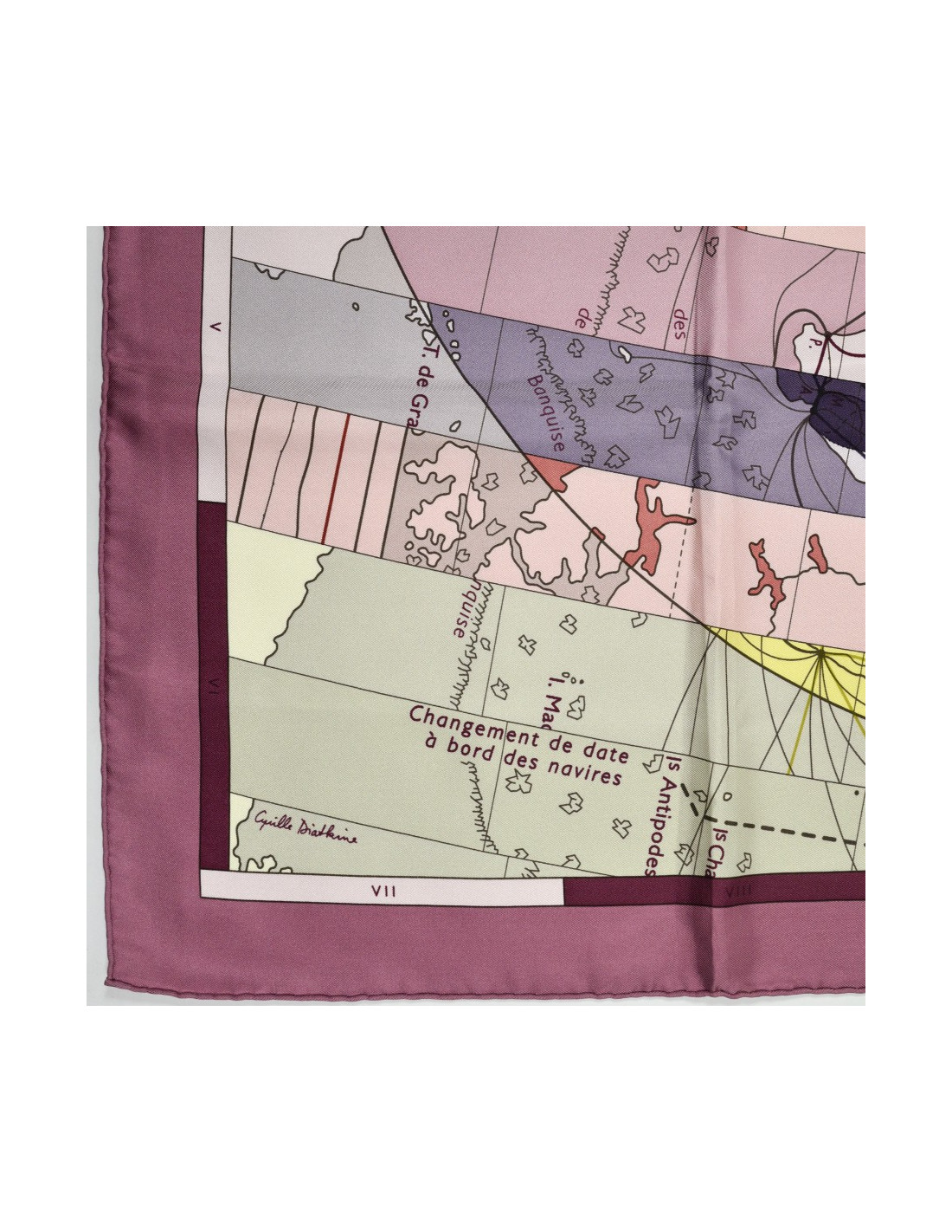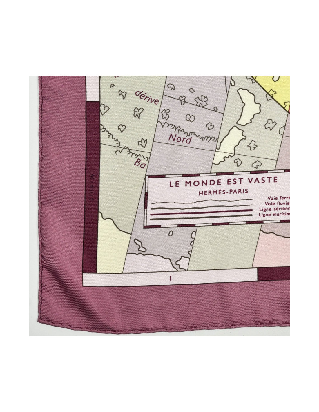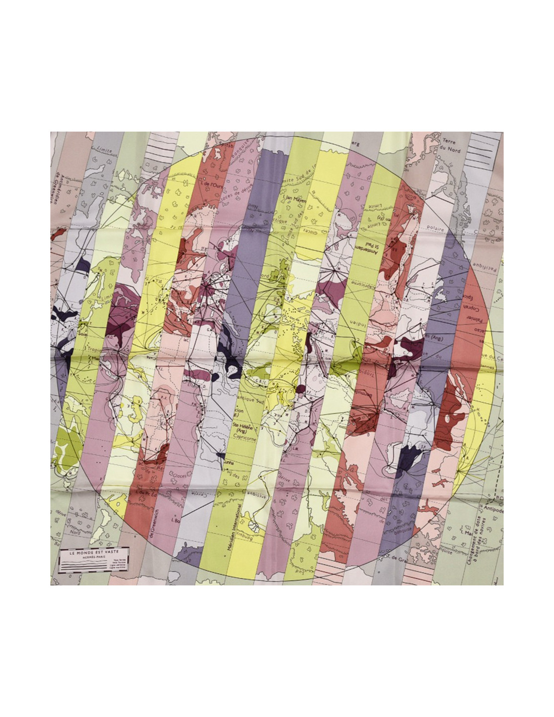 Le foulard est de la Maison HERMÈS. Intitulé "Le monde est vaste" par sa créatrice Cyrille Diatkine, il représente la carte du monde dans des couleurs roses, vertes, jaunes, et violettes. Nous y découvrons les mers, les voies fluviales, aériennes et maritimes. Rêvez voyages !