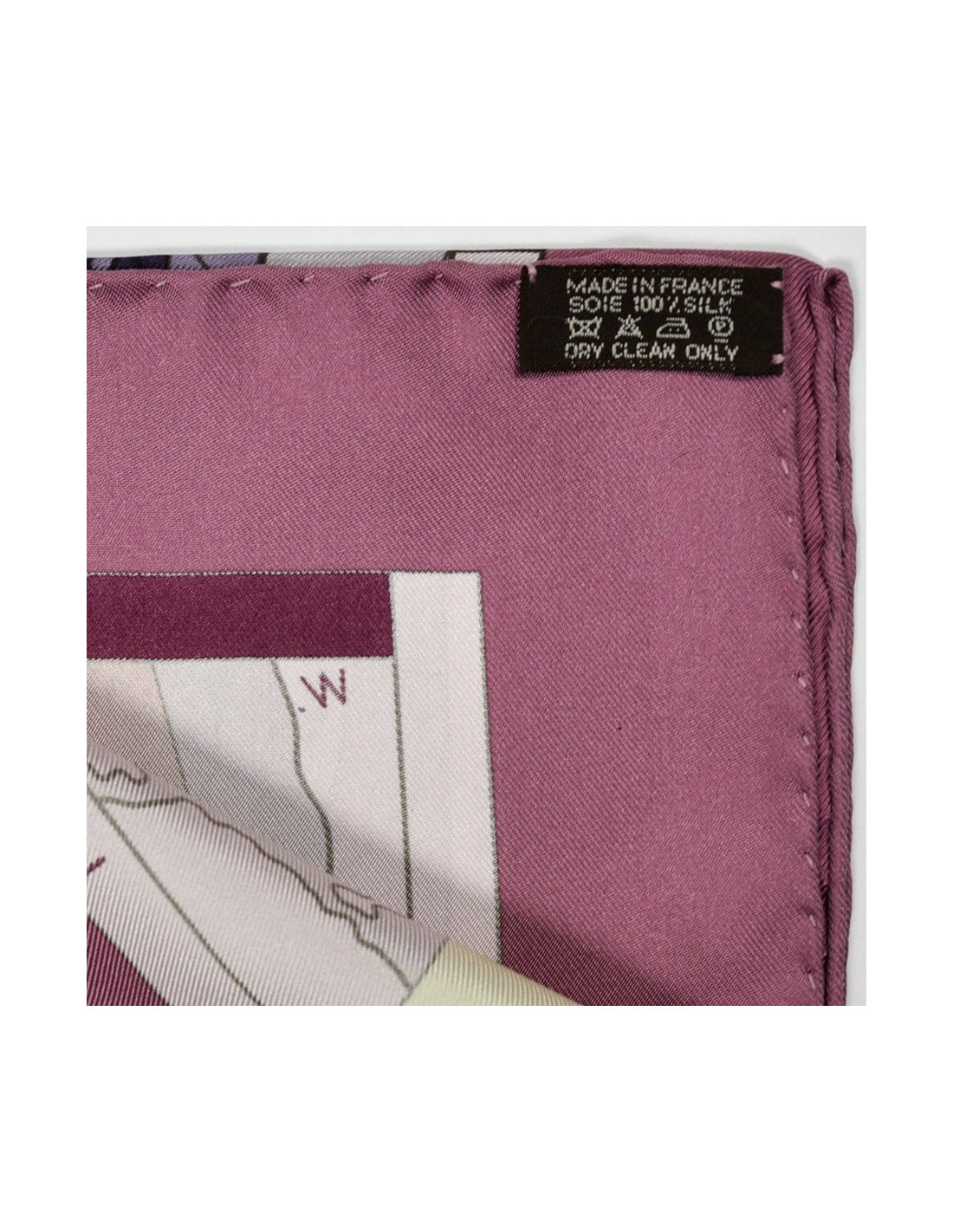 Le foulard est dans un très bon état. Nous ne relevons pas de fil tiré ni de tâche quelconque et son roulotté est impeccable. Le carré a des côtés qui mesurent 90 centimètres. Présence de l'étiquette matières qui nous indique qu'il est fait à 100% de soie et qu'il est Made In France.