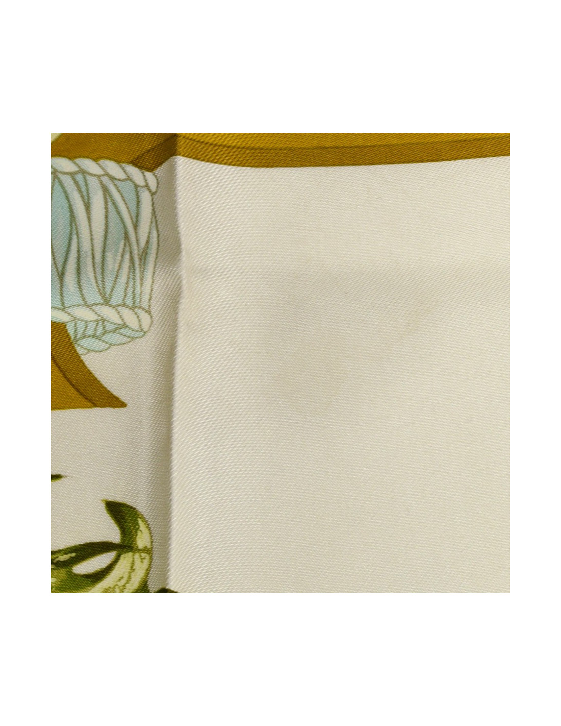 Le foulard et son roulotté sont dans un bon état. Ses couleurs sont toujours aussi éclatantes mais nous relevons la présence d'une auréole sur son encadré, ainsi que deux autres petits points quasi imperceptibles mais présents en haut du bouquet (cf photo). Hormis cet élément, nous ne constatons pas de fil tiré. Le carré a une longueur de 87 centimètres pour une largeur de 88 centimètres. Absence de l'étiquette matière mais nous pouvons constater qu'il se compose à 100% de soie.
