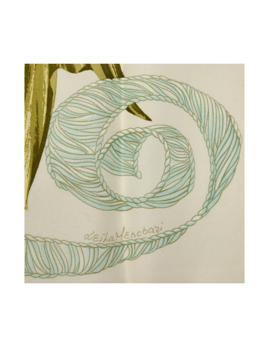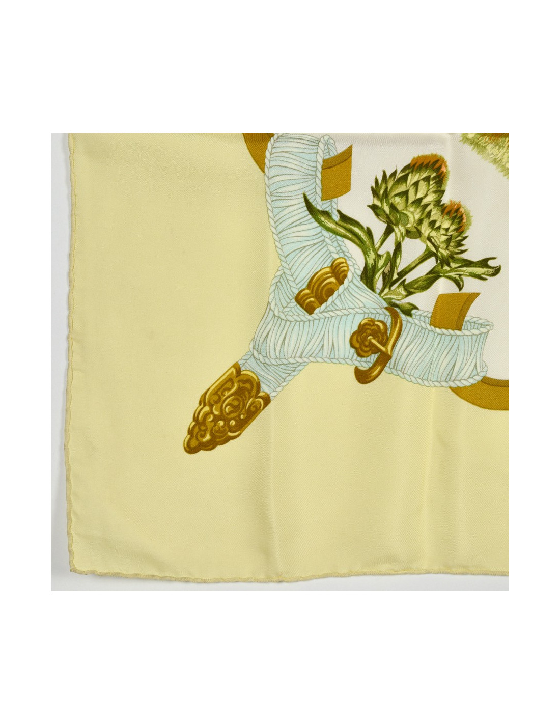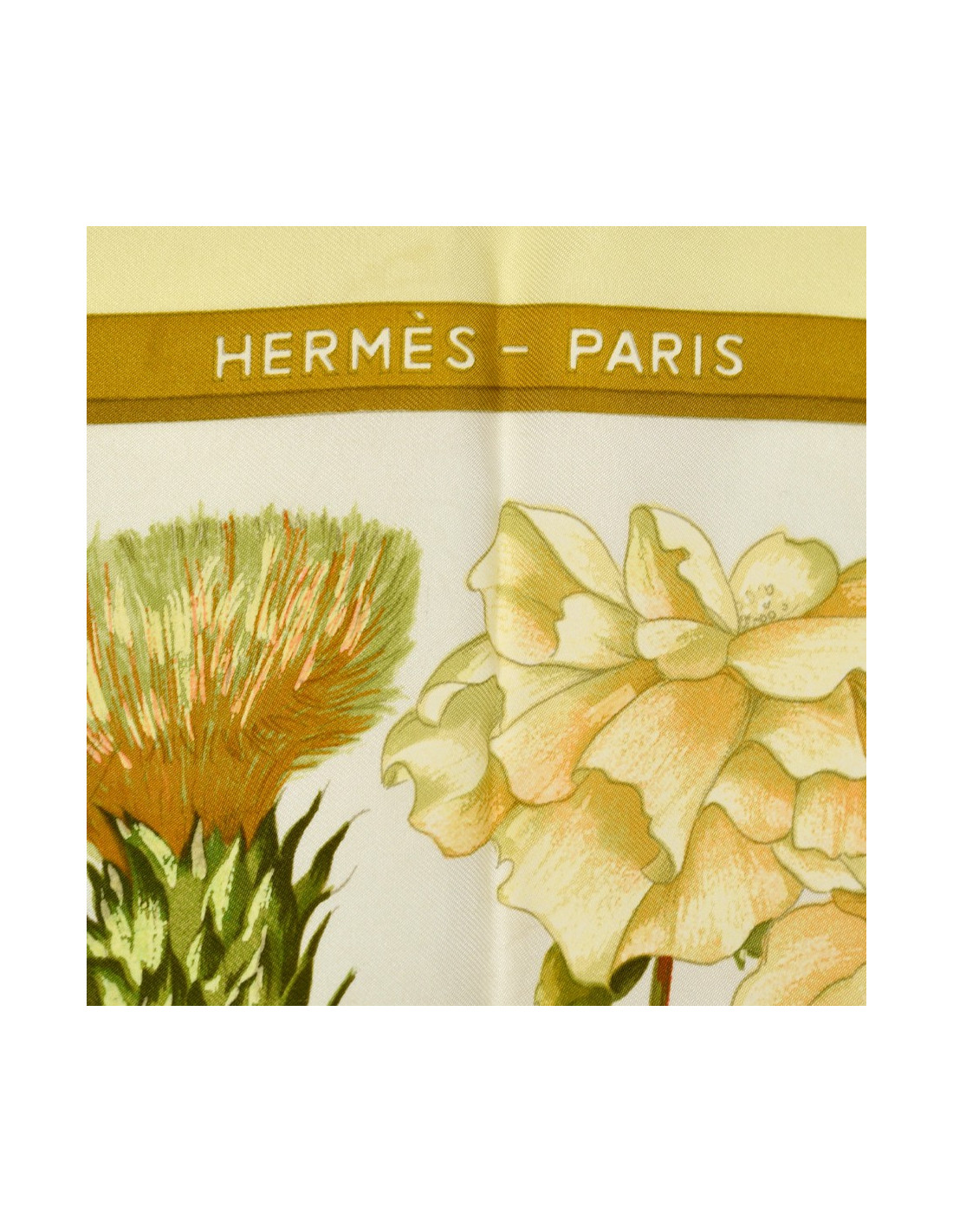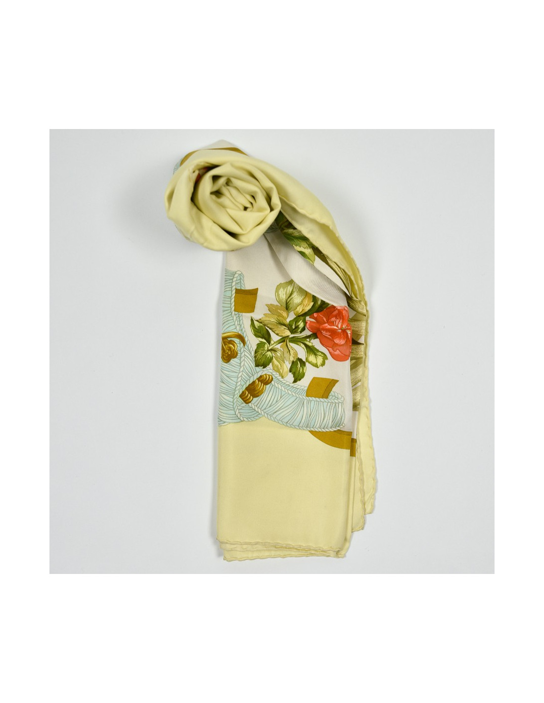 Le foulard est de la Maison HERMÈS. Dessiné par Leïla Menchari en 1972, il se décline ici dans les tons de jaune, vert et orange et présente comme élément central un bouquet de fleurs.