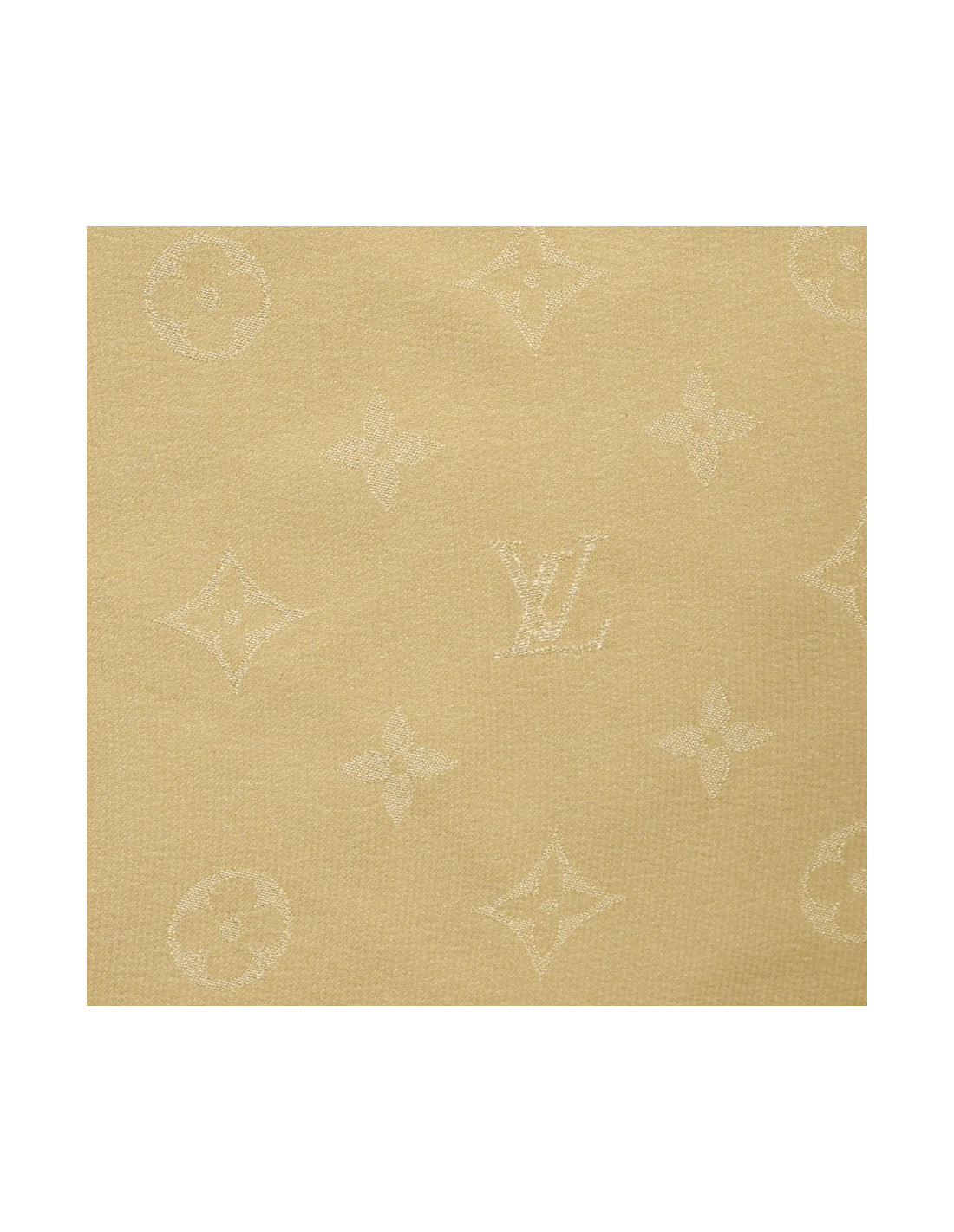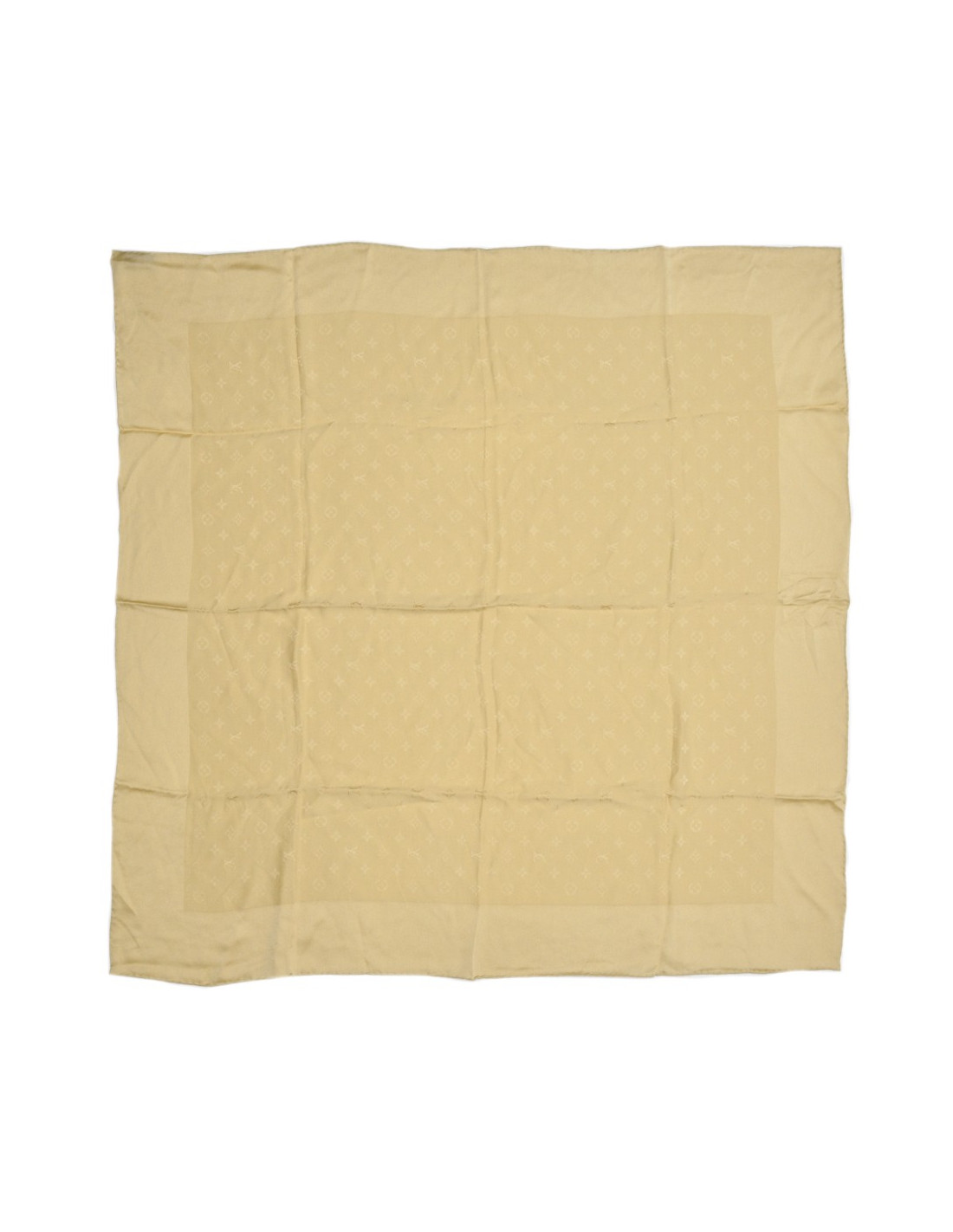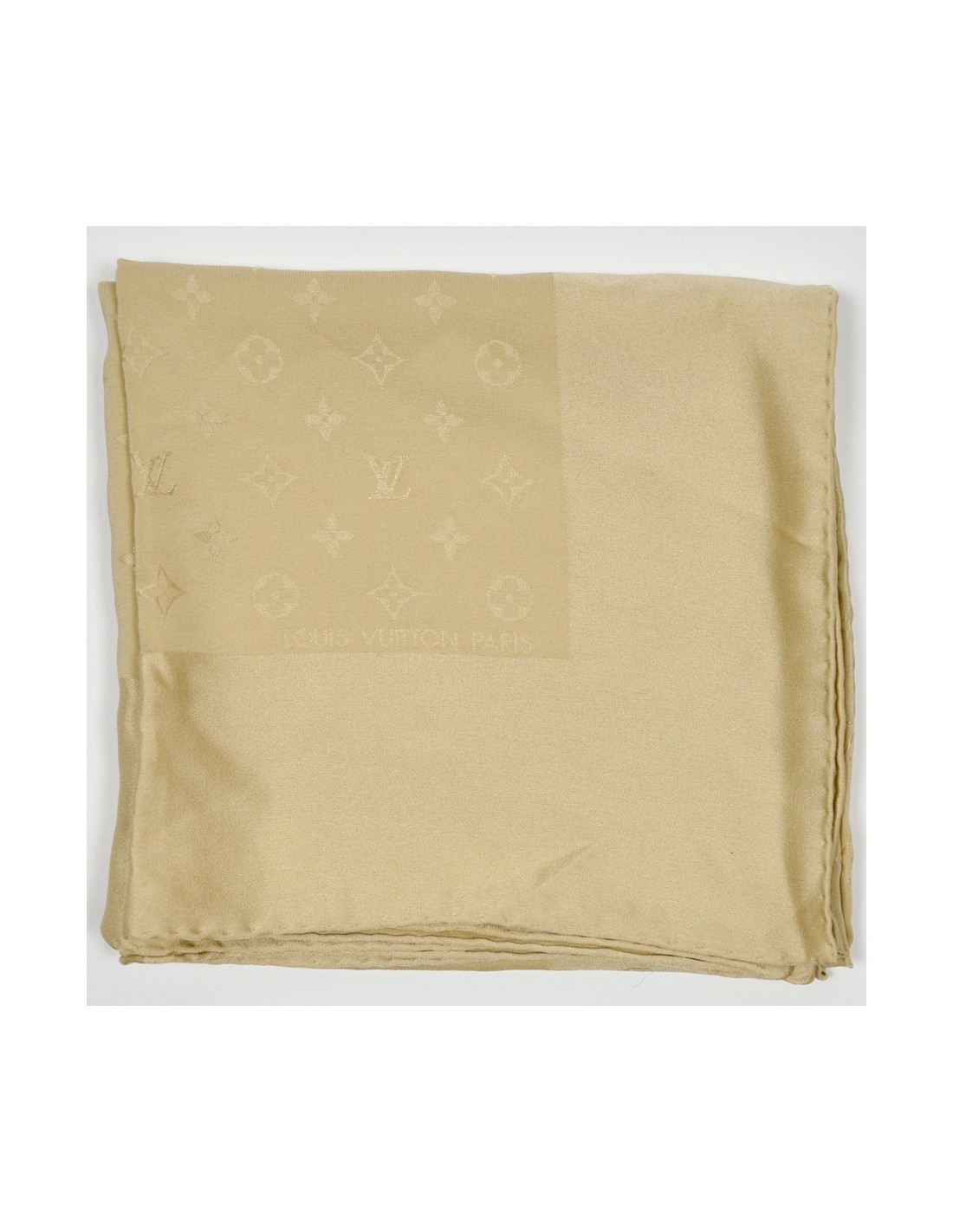 Le foulard est de la Maison LOUIS VUITTON. C'est un carré en soie beige avec comme motif l'emblématique toile monogram de la marque.