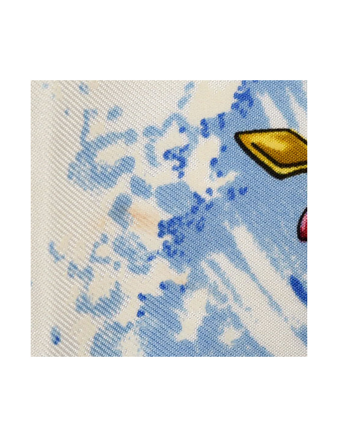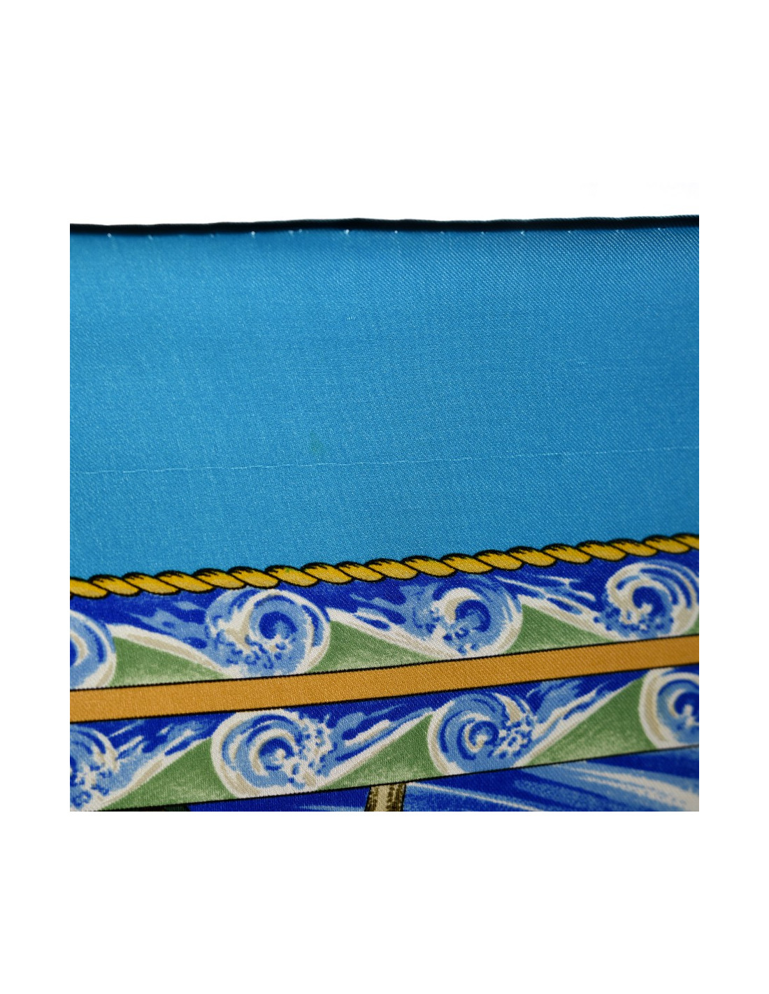 Le foulard est dans un très bon état. La structure est impeccable, aucun fil tiré et le roulotté est dans un très bon état. Nous percevons cela dit une tache très légère puisqu'imperceptible à l'oeil nu mais visible à la loupe (cf photo). Le carré a des côtés qui mesurent 90 centimètres. Présence de l'étiquette indiquant qu'il est de fabrication française.