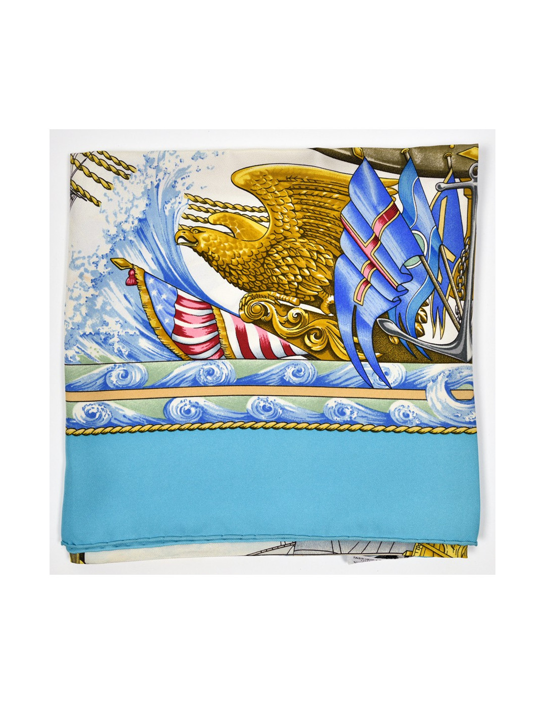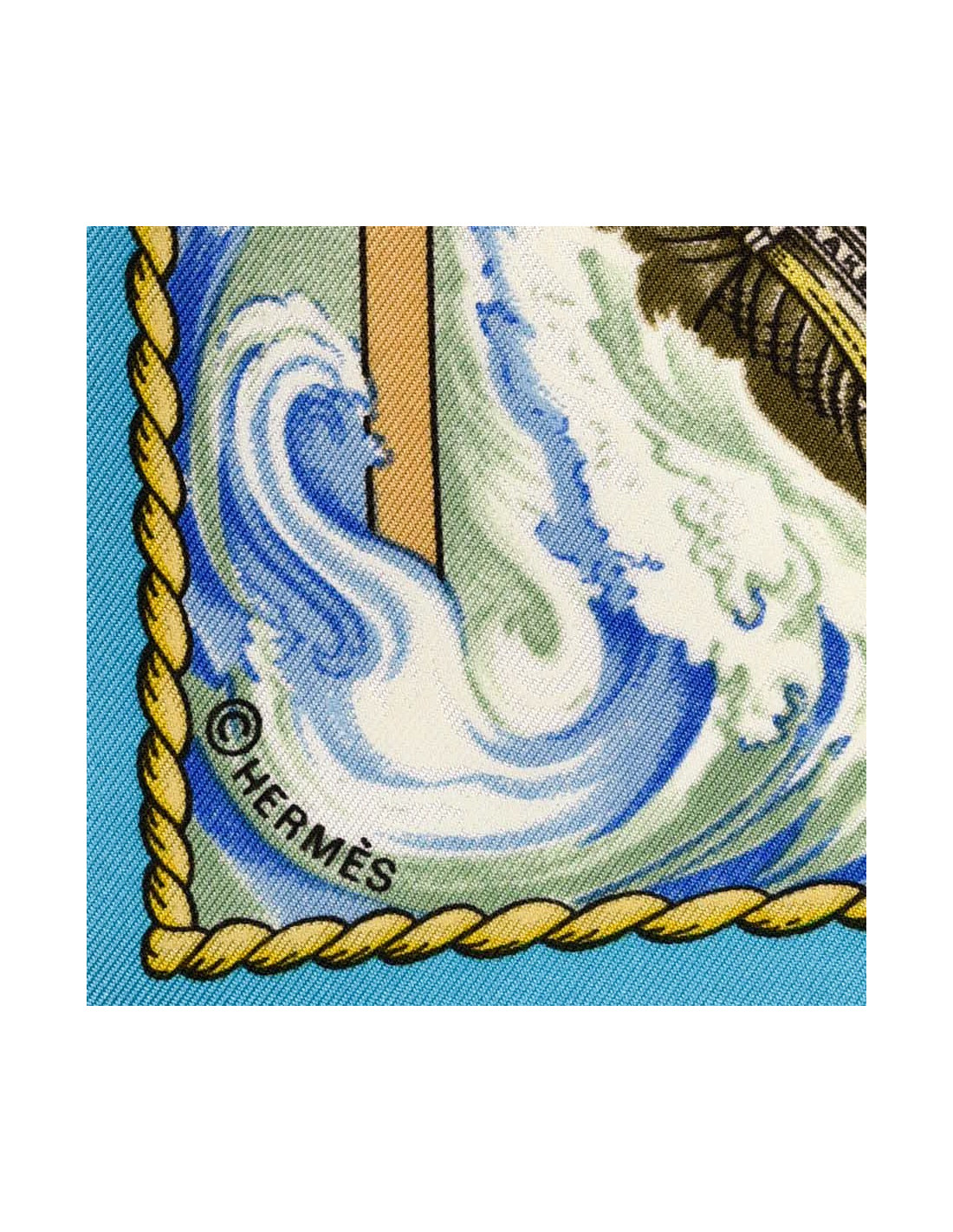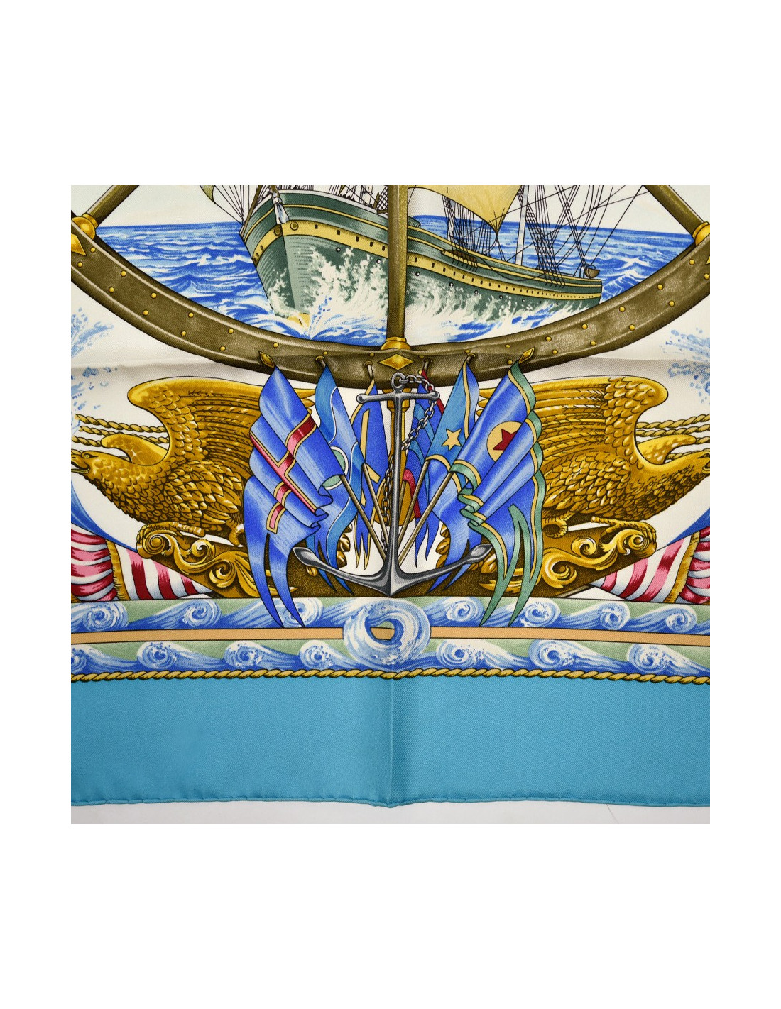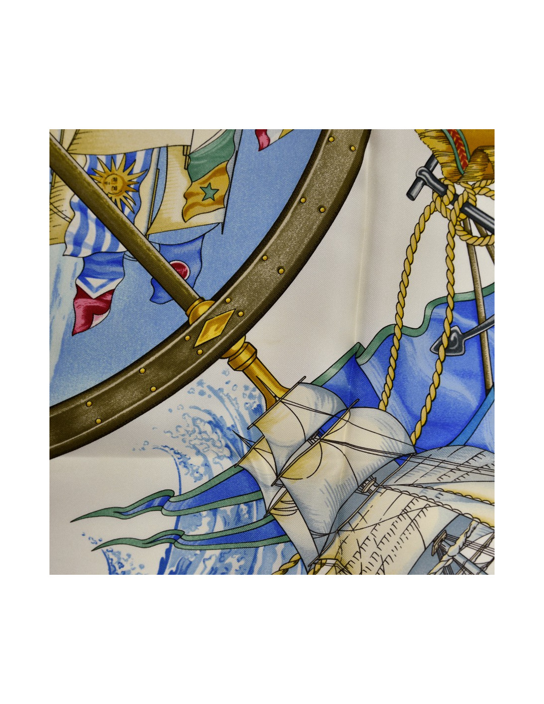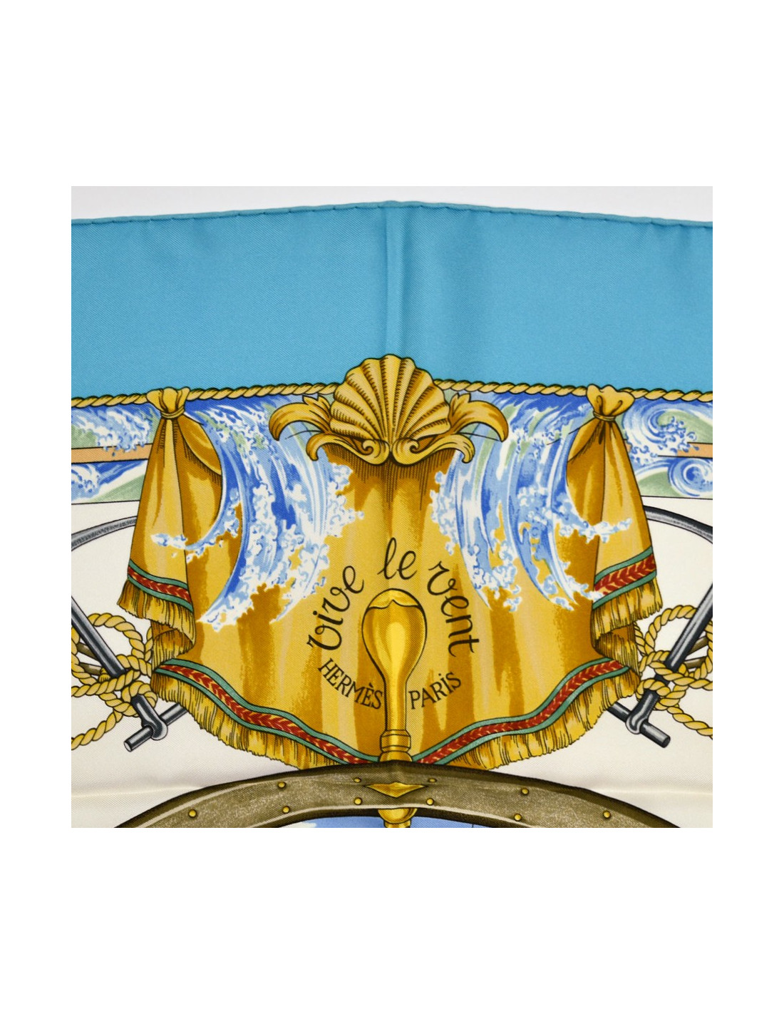 Le foulard est de la Maison HERMES. C'est un carré intitulé "Vive le vent" et dessiné par Laurence Bourthoumieux. L'élément central: un énorme voilier toutes voiles tendues dans le vent que l'on voie au travers d'une barre de gouvernail.