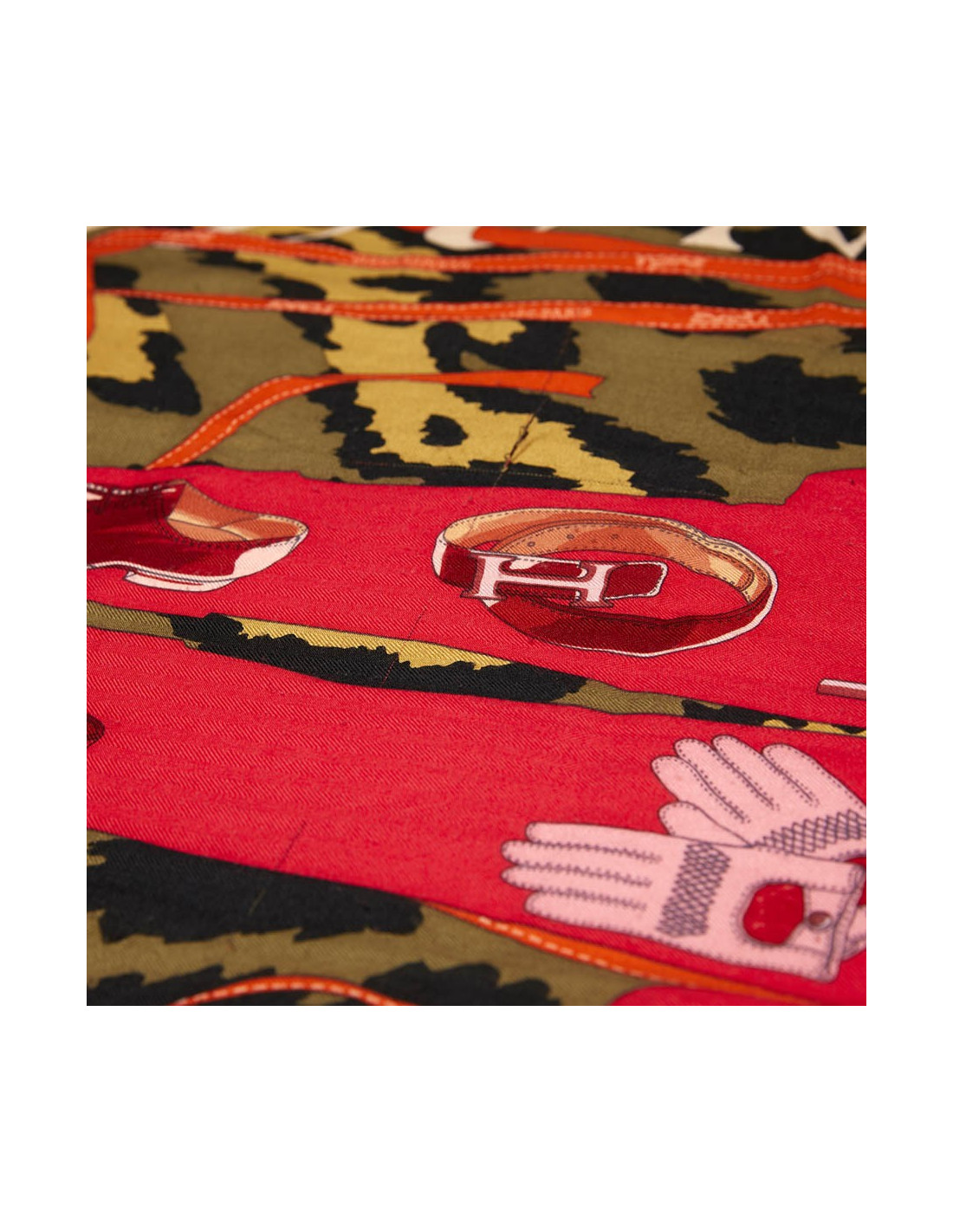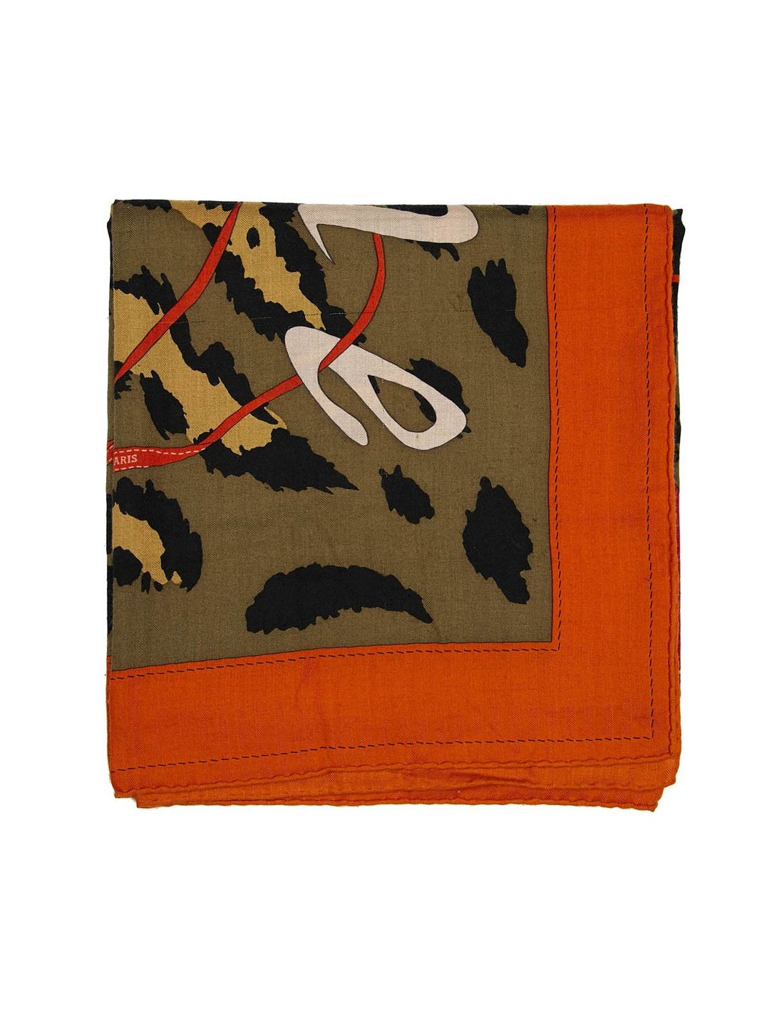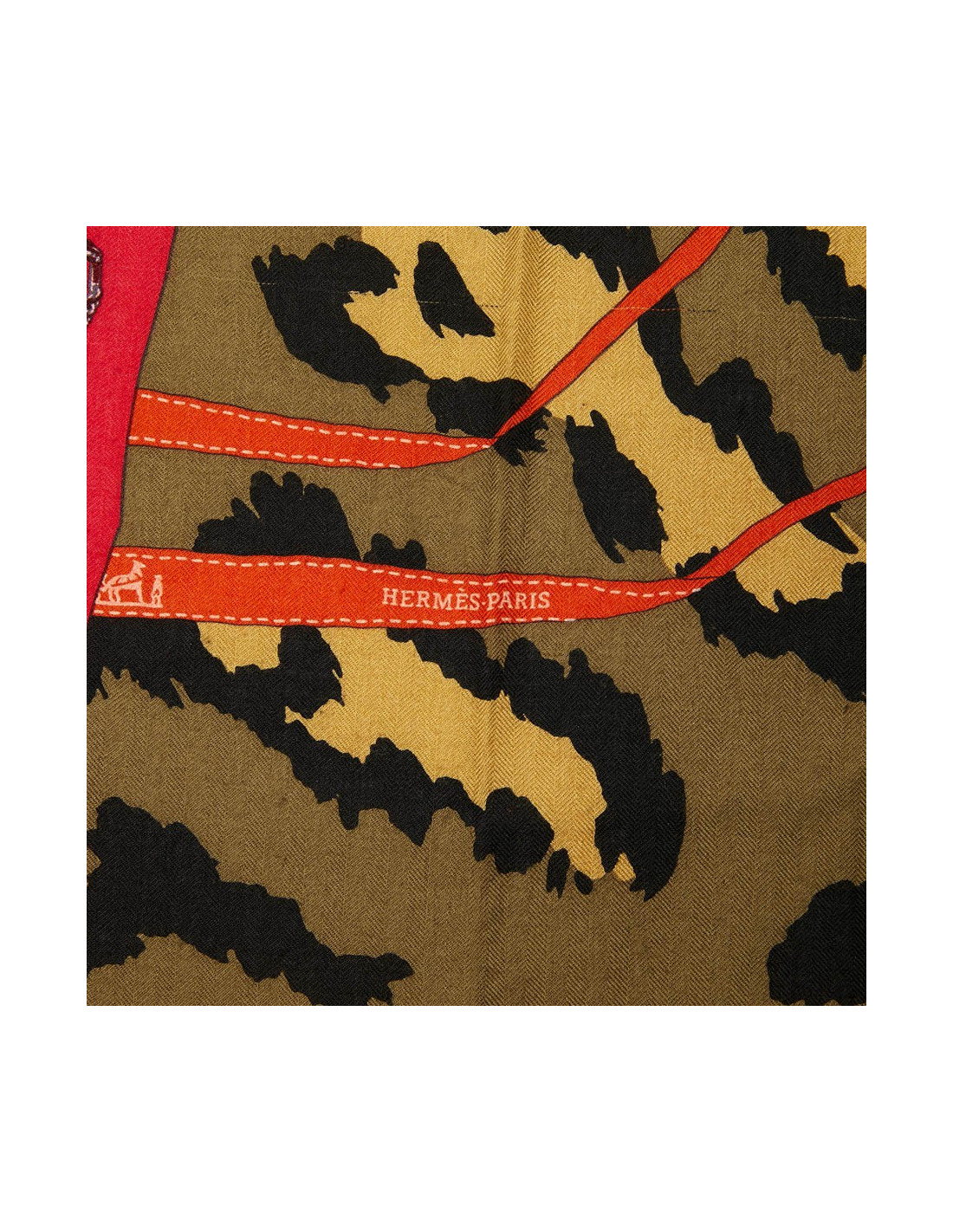 Grand châle Hermès en cachemire et soie, dans les tons kaki, orange et framboise. Il représente l'univers des accessoires Hermès homme et femme, sur fond de camouflage vert et noir et fini par son ruban orange.