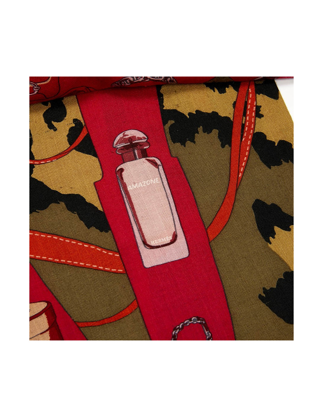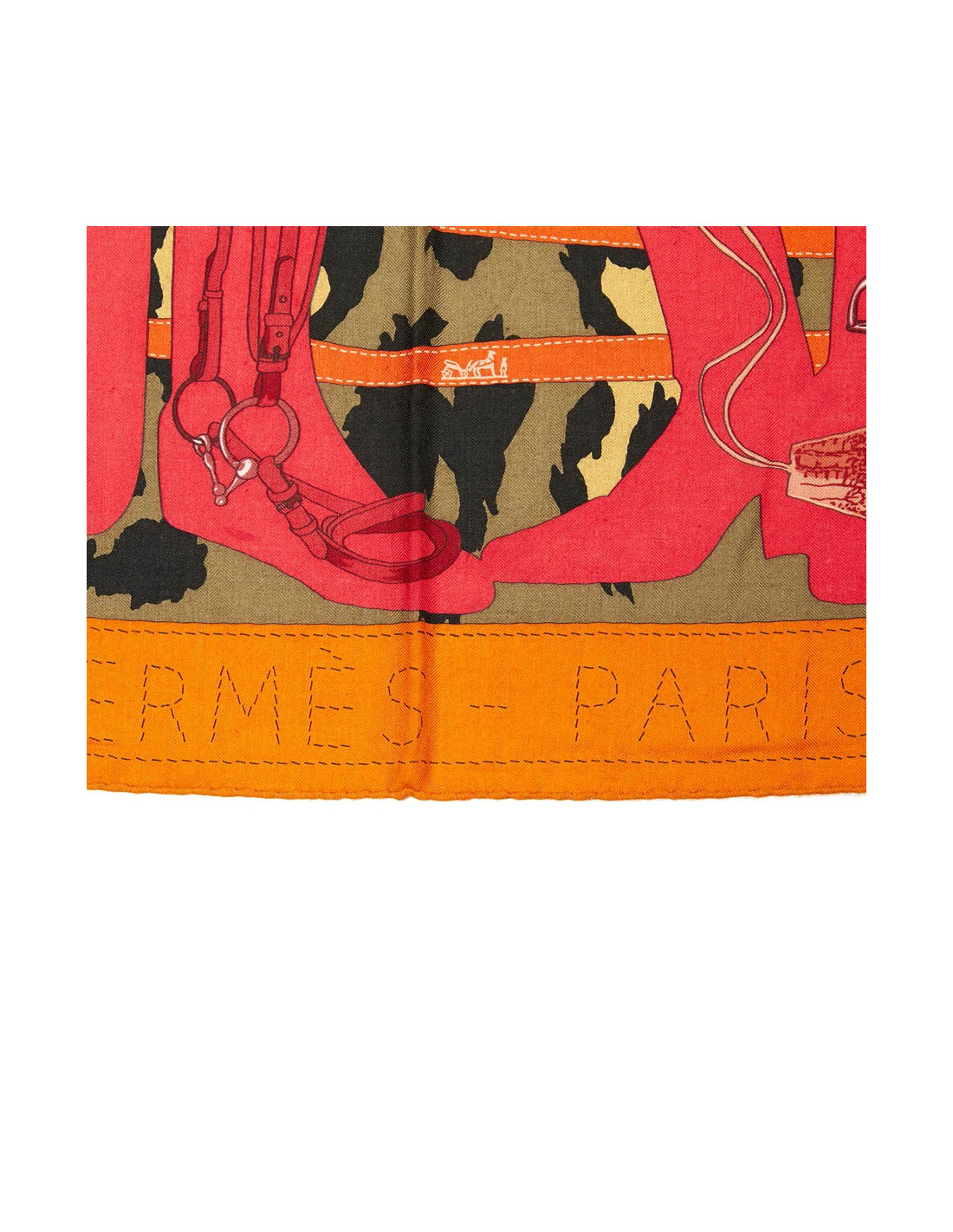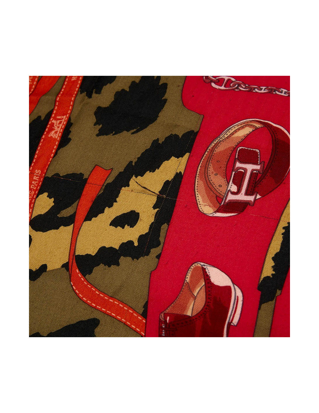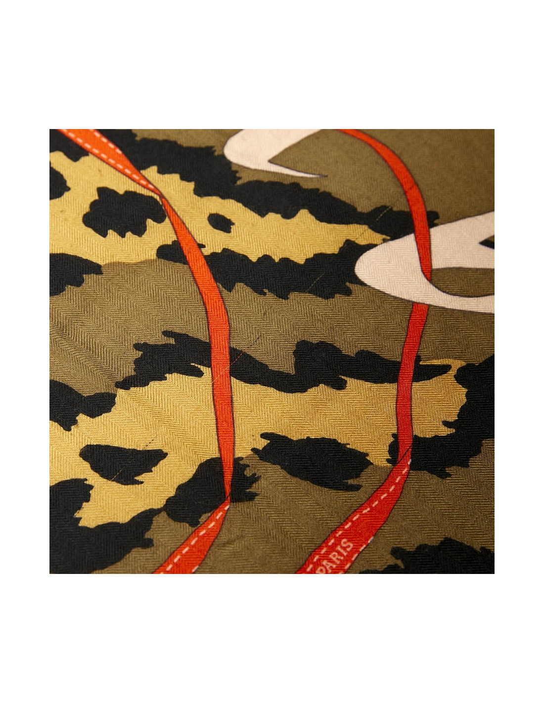 Grand châle Hermès en cachemire et soie, dans les tons kaki, orange et framboise. Il représente l'univers des accessoires Hermès homme et femme, sur fond de camouflage vert et noir et fini par son ruban orange.