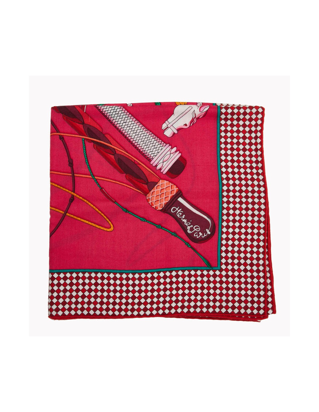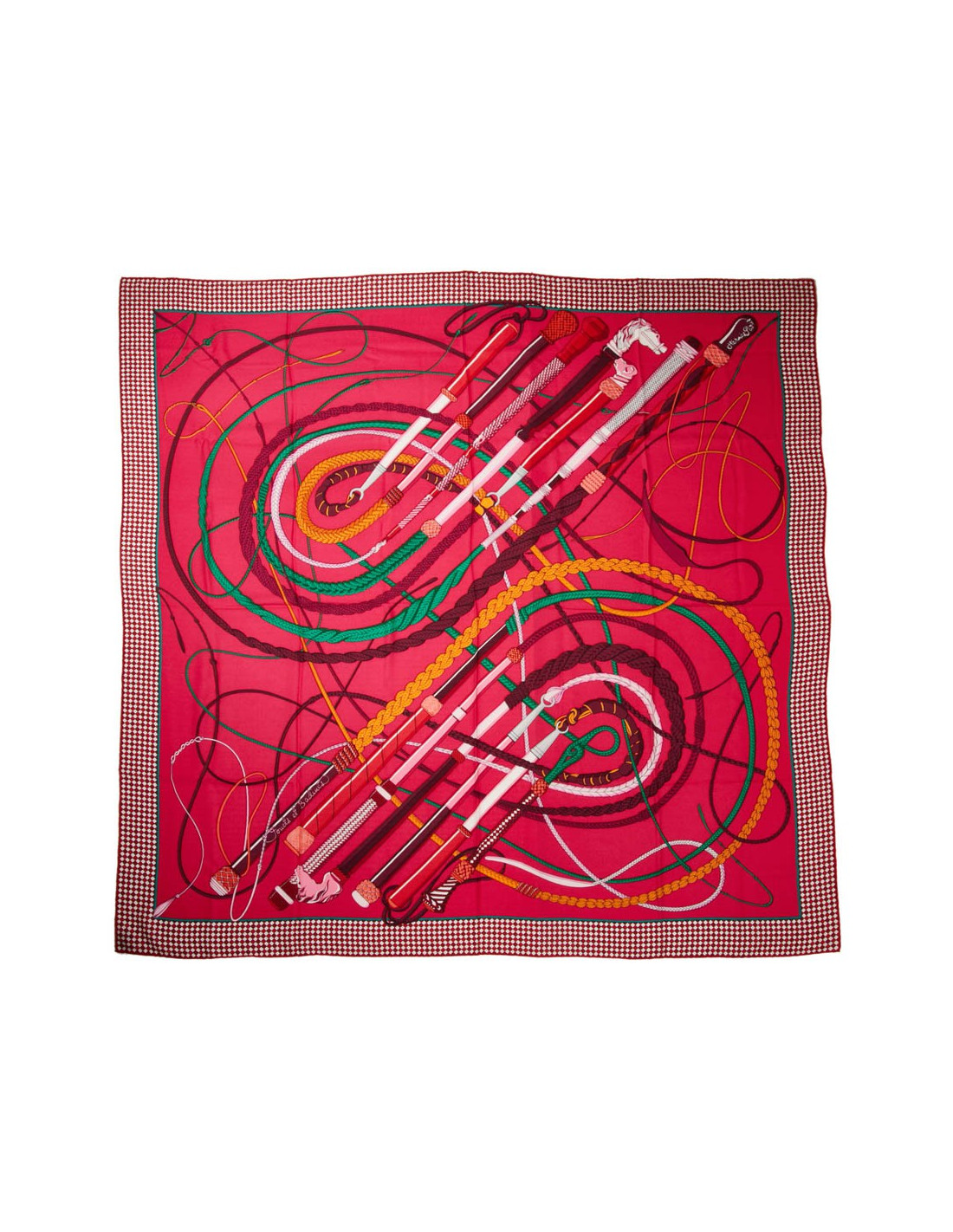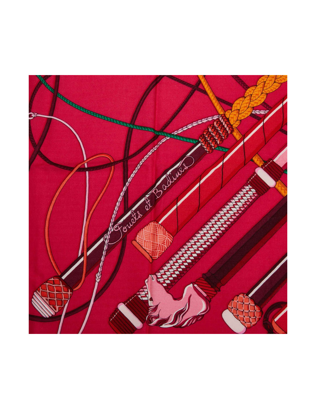 Ce grand châle Hermès est intitulé "fouets et badines", du XIX siècle. Le rose indien est la couleur prédominante. Il n'a jamais été porté.
