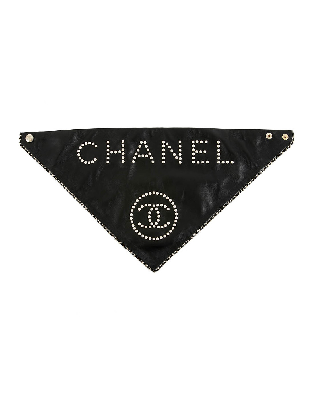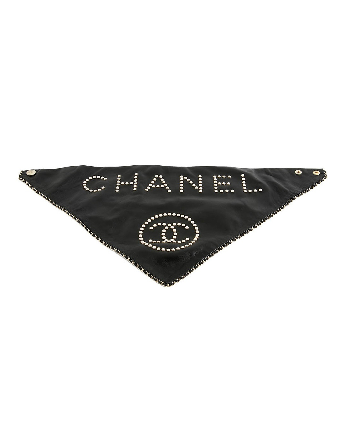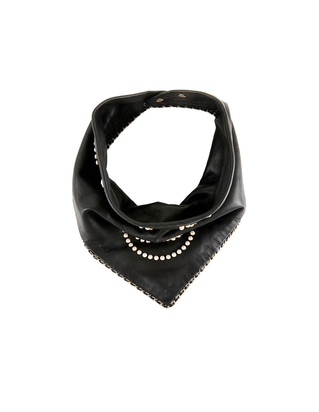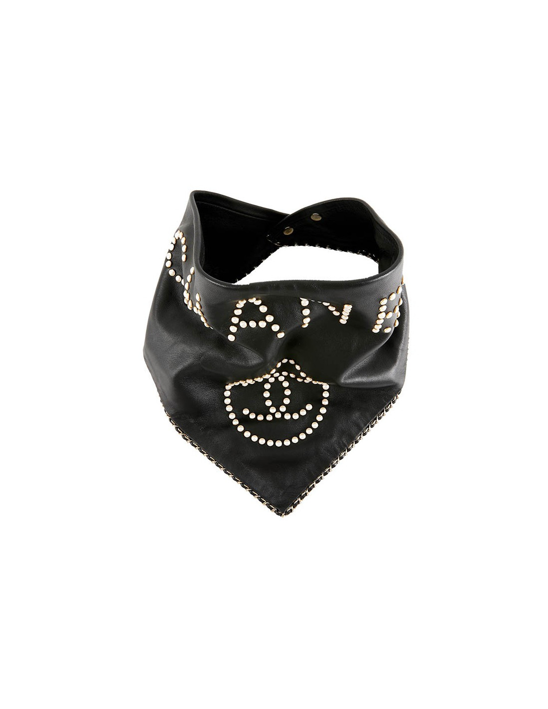 Collection actuelle. L'inscription de ce bandana en cuir d'agneau très souple donne un effet clouté mais en fait il s'agit de demi perles collées. Le tour se termine par la célèbre chaîne entrelacée de cuir. Il est réversible. La partie arrière est toute noire.