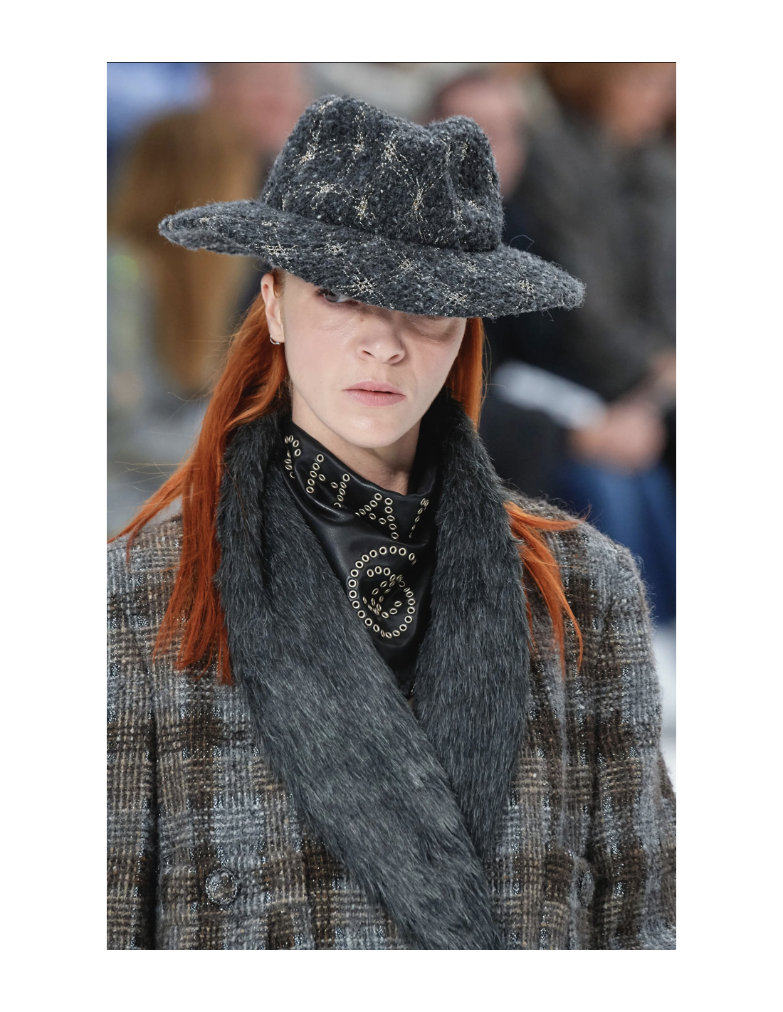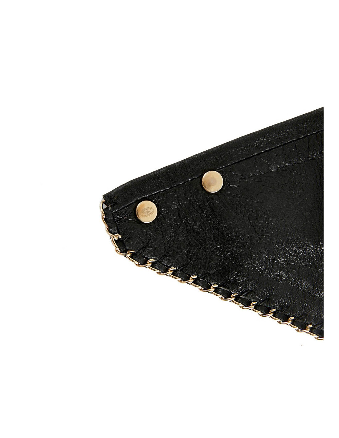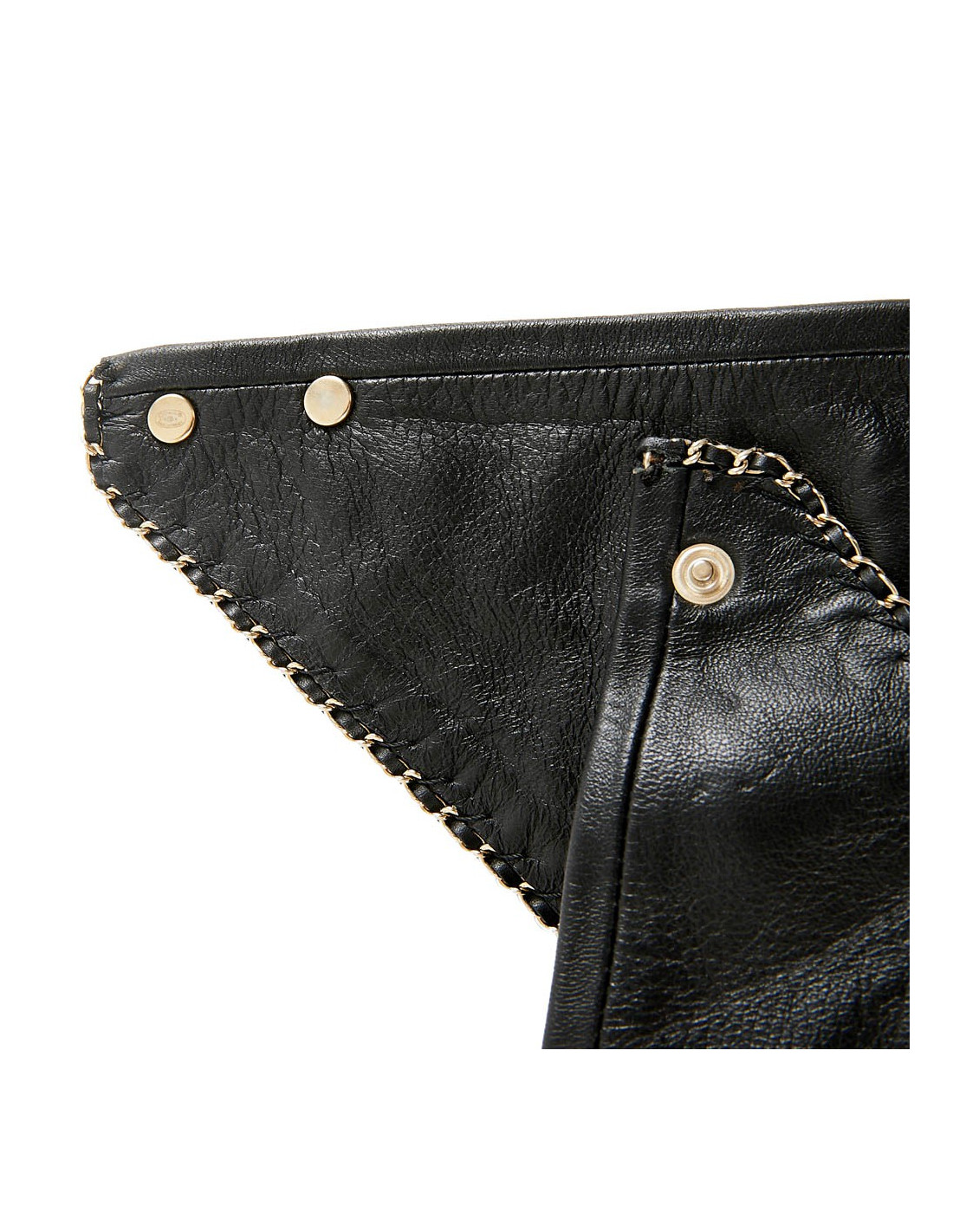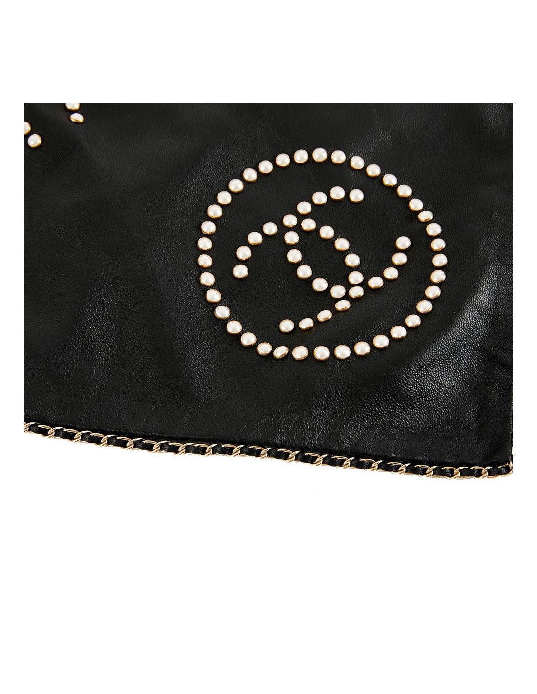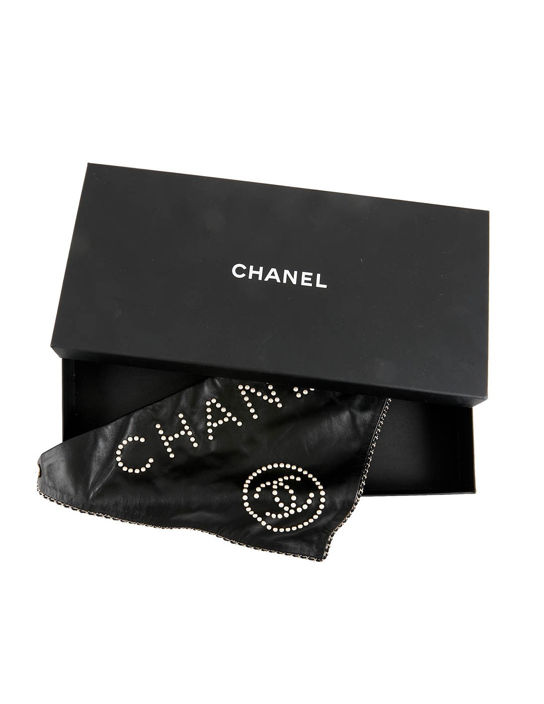 Collection actuelle. L'inscription de ce bandana en cuir d'agneau très souple donne un effet clouté mais en fait il s'agit de demi perles collées. Le tour se termine par la célèbre chaîne entrelacée de cuir. Il est réversible. La partie arrière est toute noire.