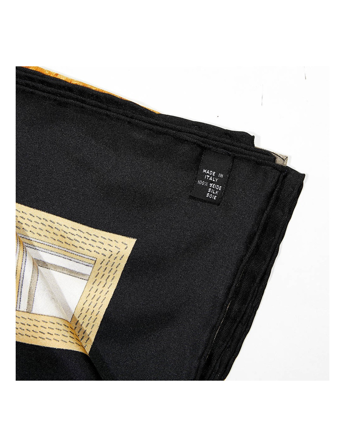 Il mesure 90 cm par 90 cm. Il est en soie. En très bon état. Il a son étiquette de matière et de pays de fabrication.