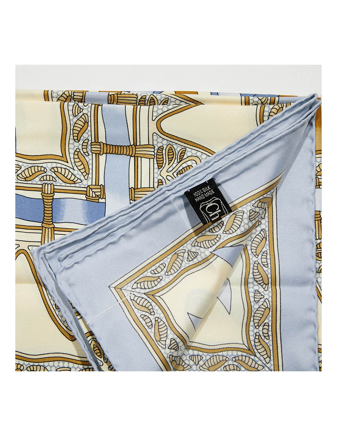 Ce carré est en soie. Les couleurs sont tendres bleu et jaune pâle. iL EST NEUF