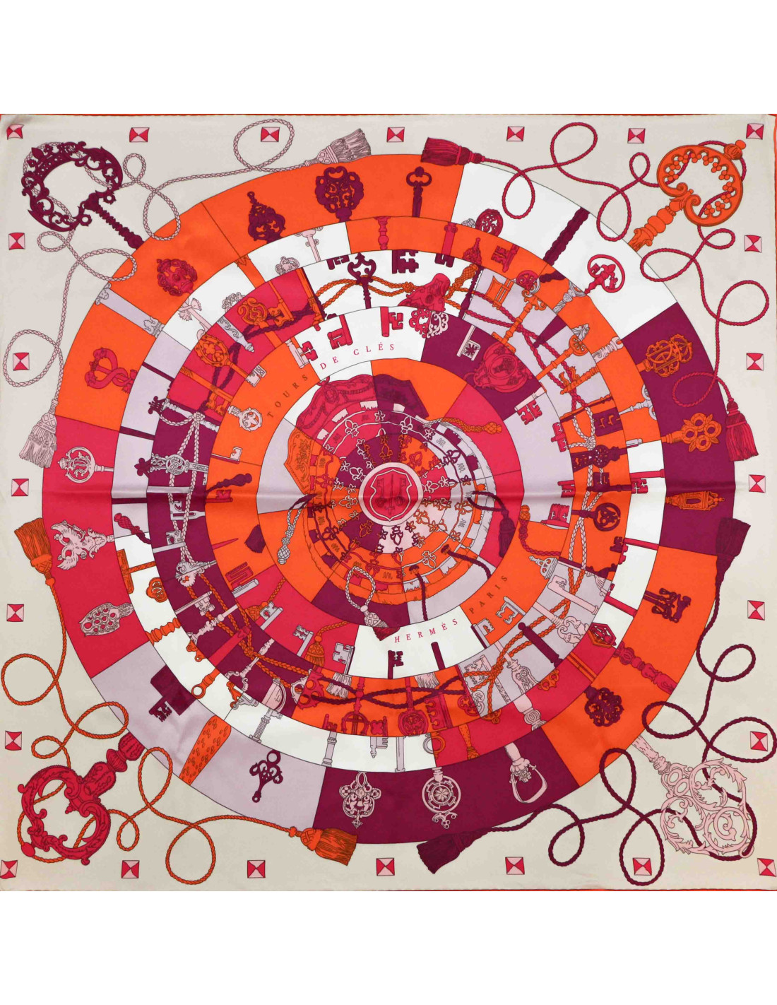 Foulard en soie HERMES Tours de ClésCondition : très bon état (roulotté impeccable, pas de fil tiré ou trace)