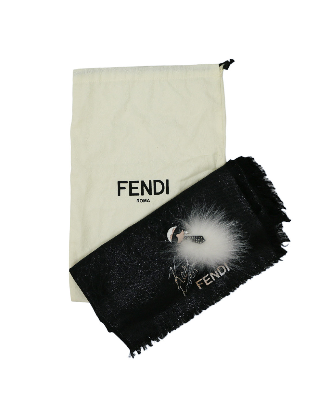 Détails : inscription "Karl loves Fendi", représentation de Karl Lagerfeld en cuir et fausse fourrure blanche, monogramme KL et petites franges noires