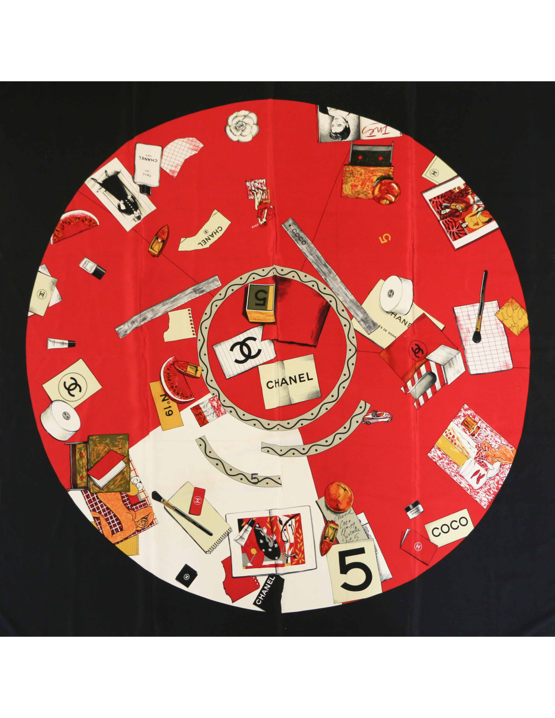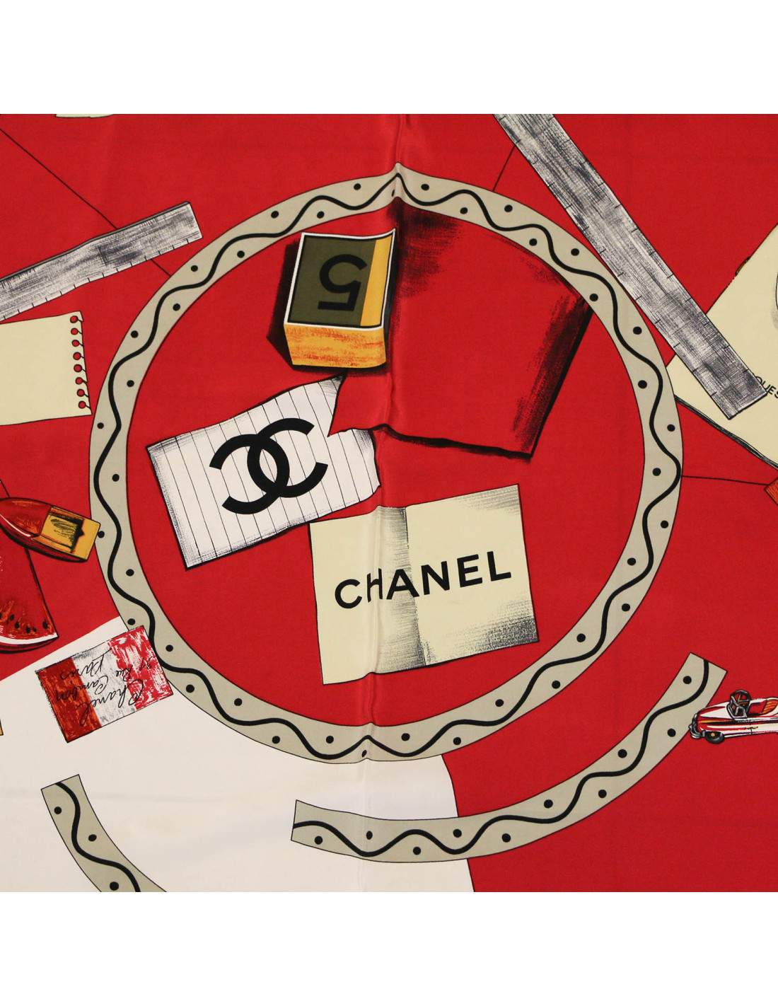 Détails : étiquette de composition absente, le roulotté est en très bon état. aucune tâche. Carré noir avec des dessins de produits de beauté dans un cercle rouge. Chanel : crème, pinceau, rouge à lèvres...