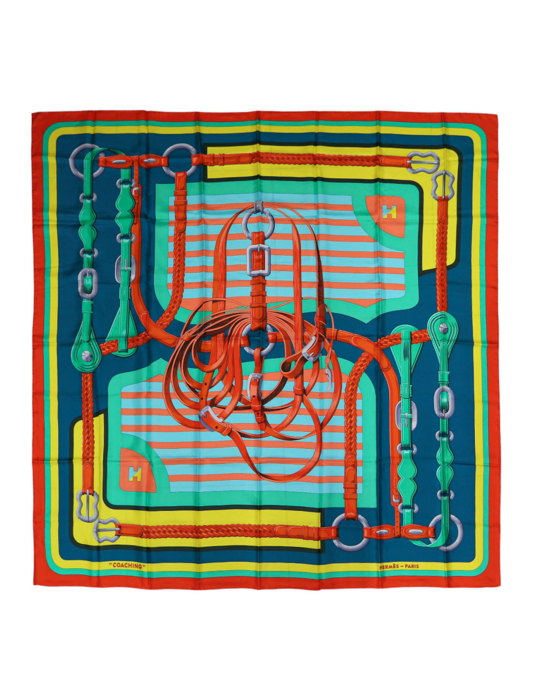 Détails : ce magnifique motif illustre l'univers équestre de la Maison HERMES. Il représente différents éléments de harnachement : couvertures, sangles aux couleurs vives.