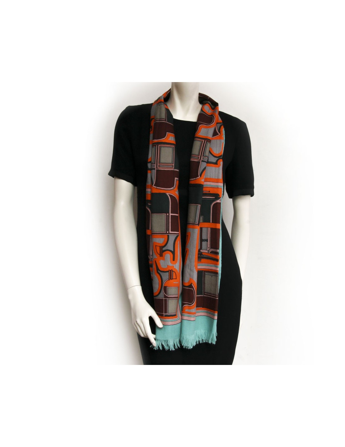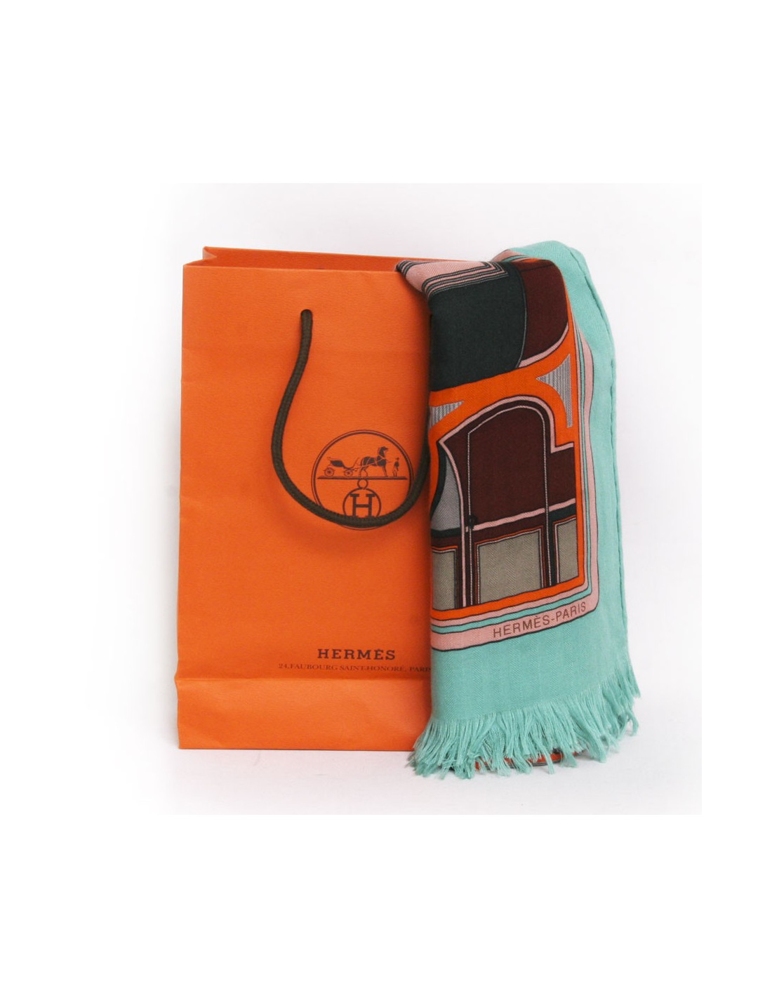 Long châle Hermès en cachemire et soie de couleur, turquoise, orange, bordeaux, grise et rose poudré. Il est bordé de petites franges.
