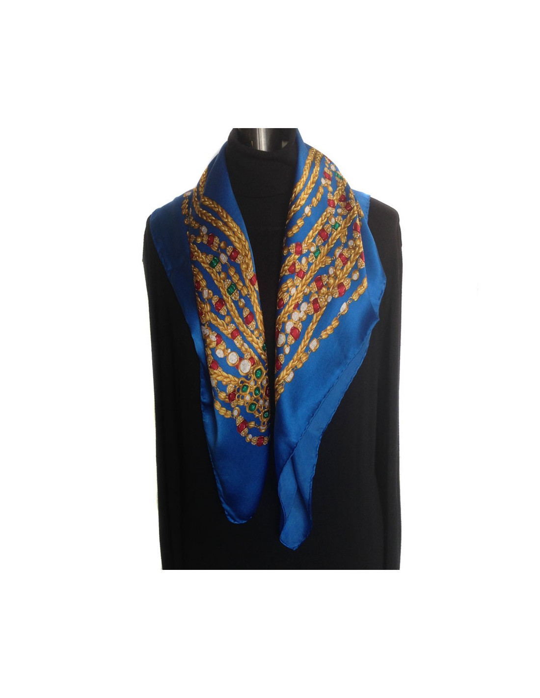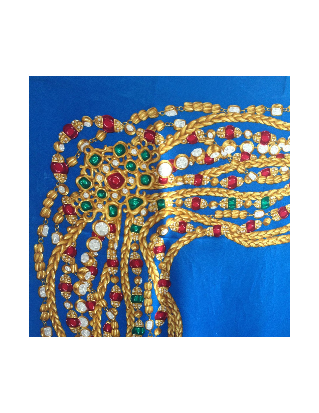 Superbe carré de soie CHANEL vintage dans les tons de bleu. Motif: les sautoirs Chanel en rubis, émeraudes etc...Soie très légèrement abîmée au niveau de la signature (voir photo). Le roulotté est en très bon état. Absence d'étiquette matière. Le carré a été nettoyé chez un teinturier de luxe.