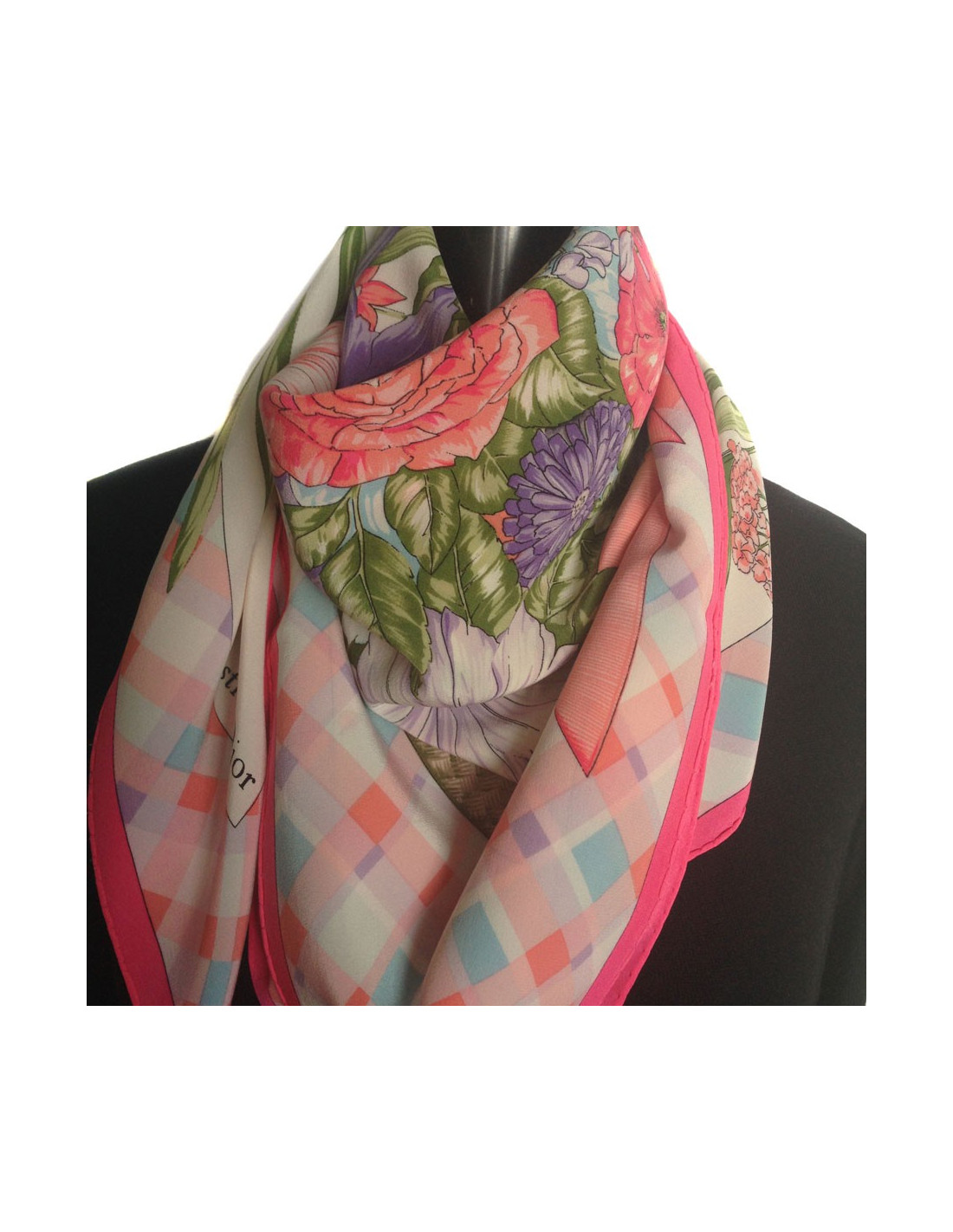 Très beau carré de mousseline de soie CHRISTIAN DIOR dans les tons roses.