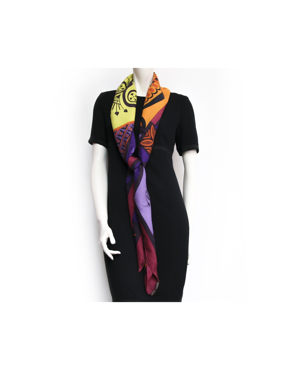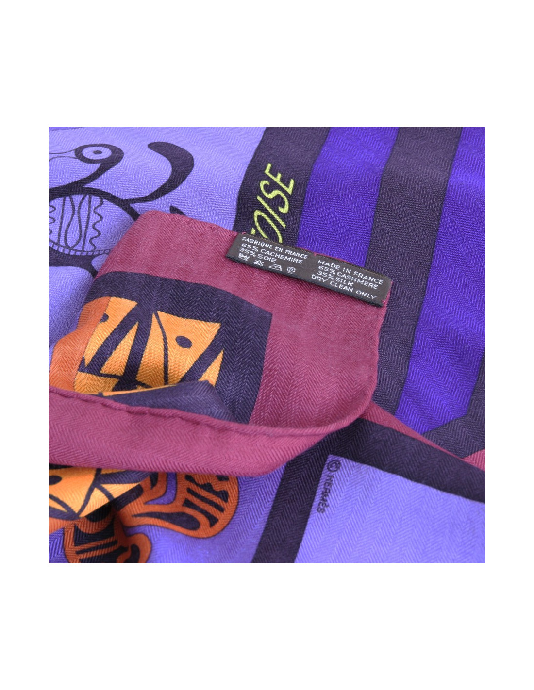 Sublime grand châle de la Maison Hermès signé J.Abadie, en cachemire et soie aux motifs "Géométriques Crétoises". De magnifiques couleurs illuminent le foulard, dégradé de violet, dégradé d'orange, bordeaux et vert anis.