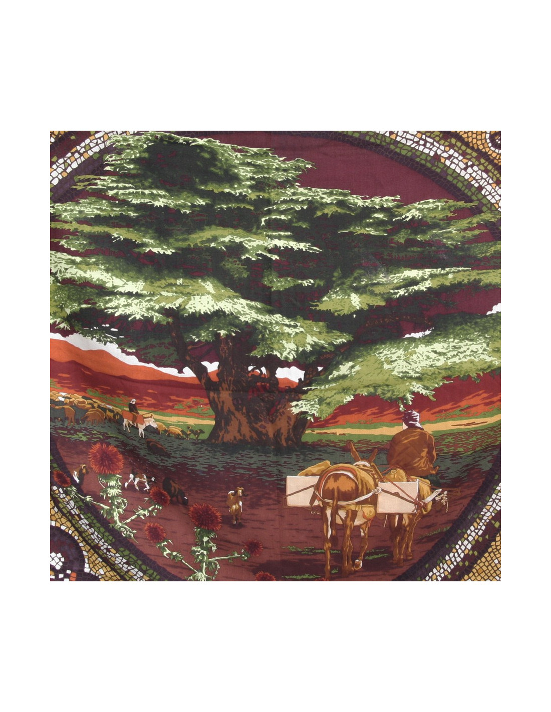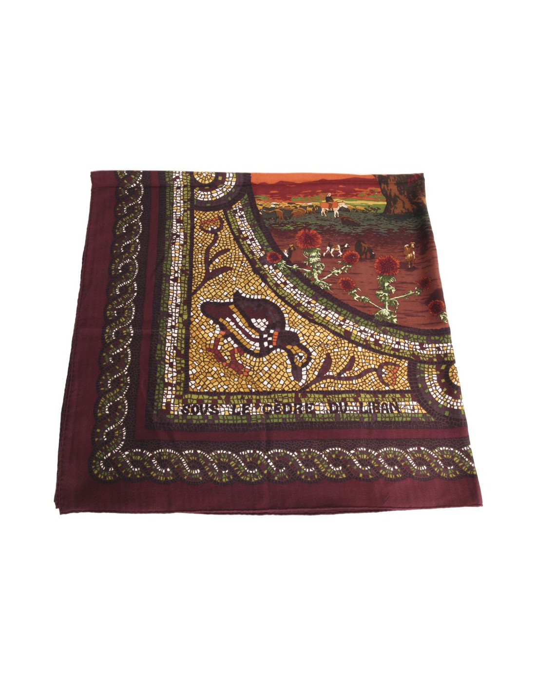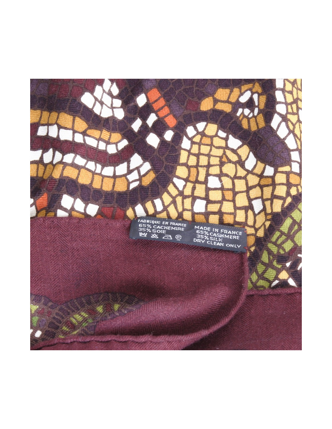 Grand châle de la maison Hermès en cachemire et soie "Sous le cèdre du Liban", motifs mosaïques avec de somptueuses couleurs chaudes, vert, marron, bordeaux, jaune vif. Made in France. En très bon état.