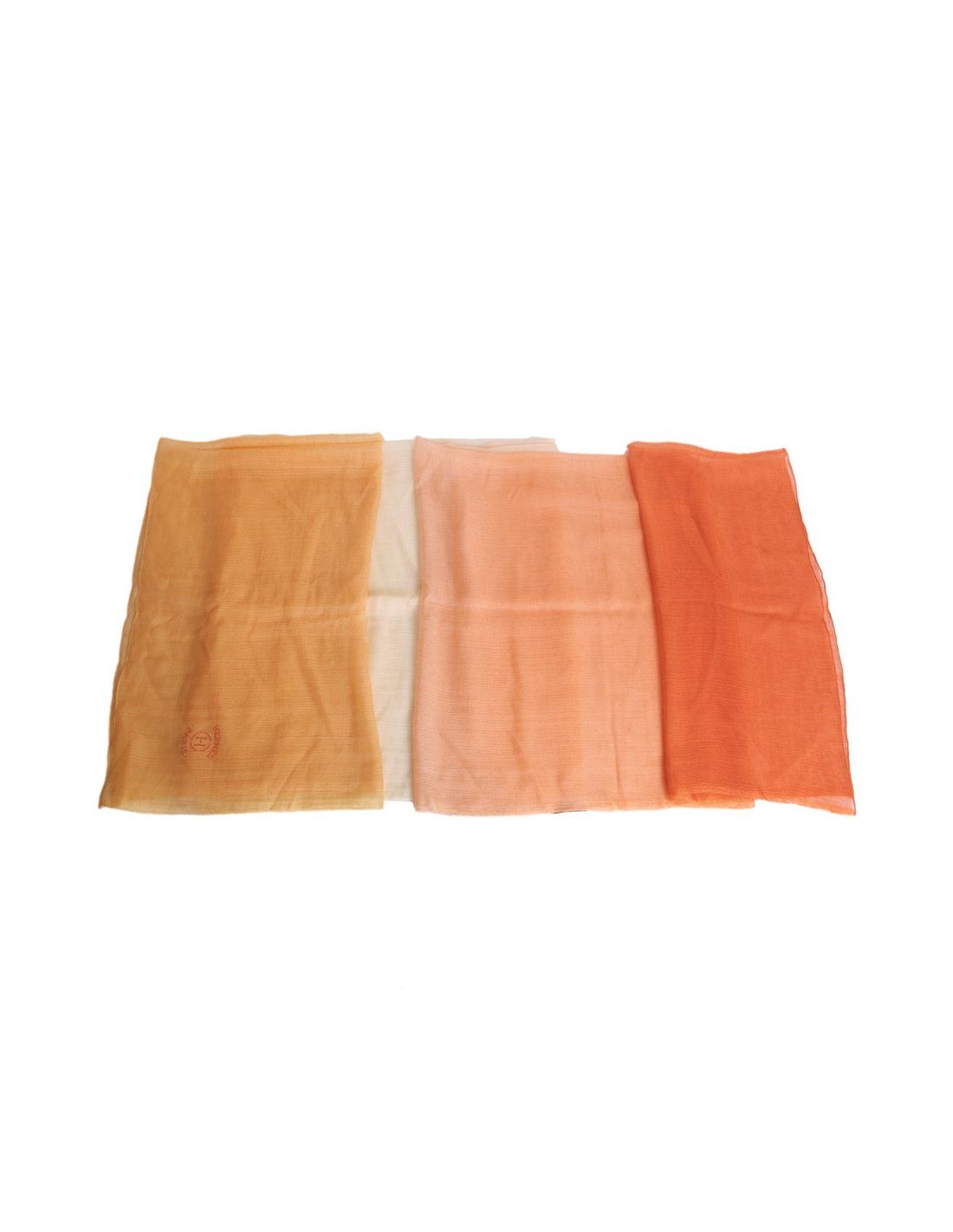 Grand châle Hermès en cachemire et soie dégradé de jaune et orange, il est doux et soyeux au touché et pourra être porté en toutes saisons.