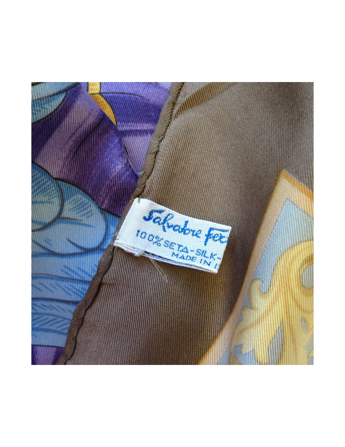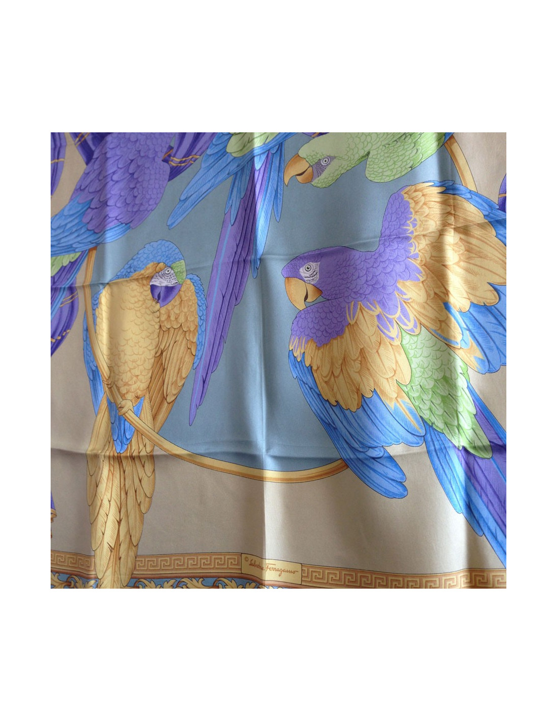 Superbe carré de soie Salvatore FERRAGAMO vintage. Motif: perroquets multicolores. La bordure est étoupe, fond gris et or pâle. Perroquets à dominante de mauve. Le roulotté est en très bon état, décousu sur une petite partie. Etiquette de matière présente. Le carré a été nettoyé chez un teinturier de luxe.