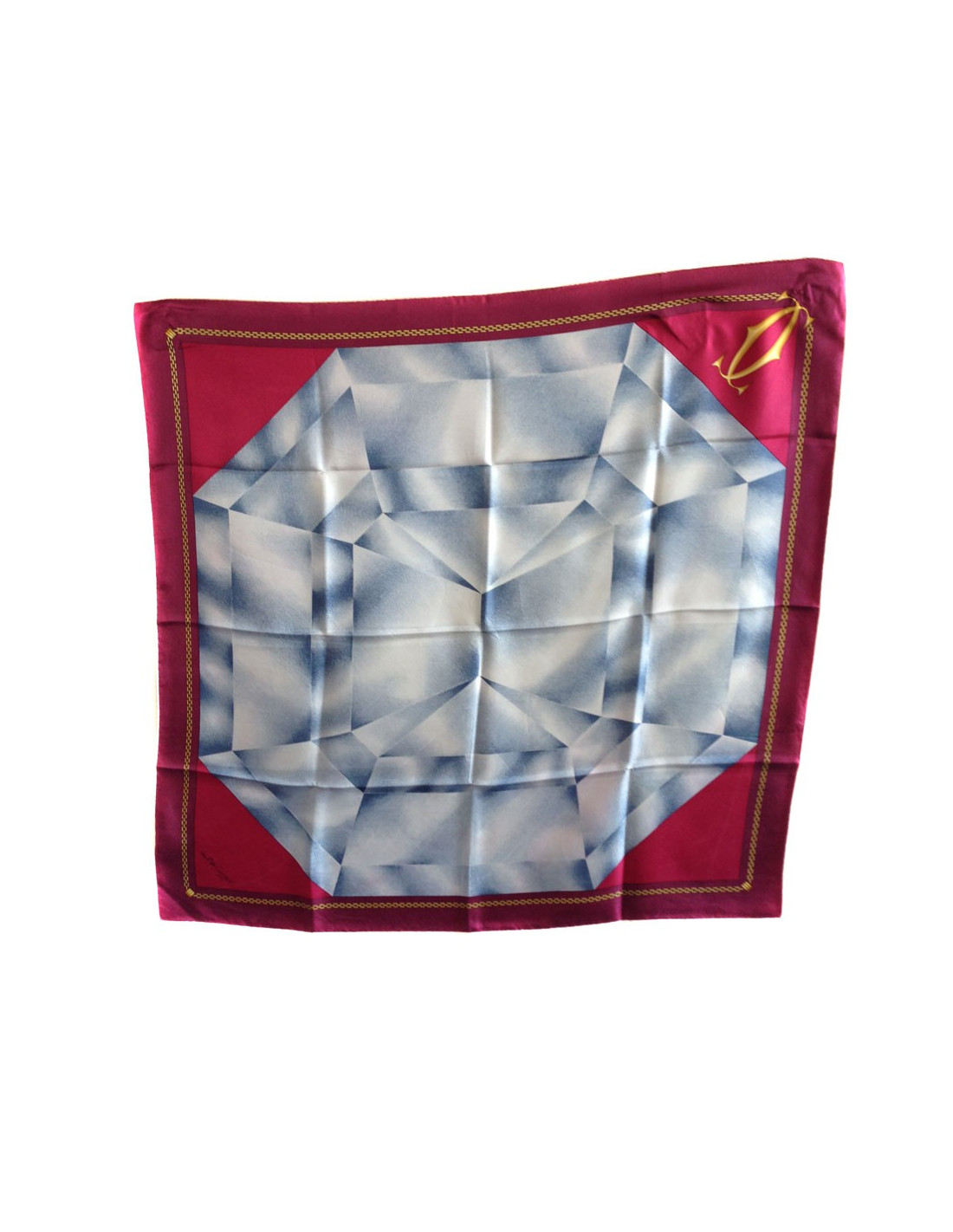 Motif principal: un diamant facetté. Les initiales de la maison sont présentes sur un angle du carré. Foulard en très bon état. Légères décolorations sur le fond bleuté (voir photos). Le roulotté est impeccable. Etiquette de matière présente. Le carré a été nettoyé chez un teinturier de luxe.