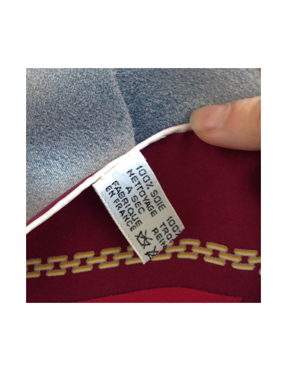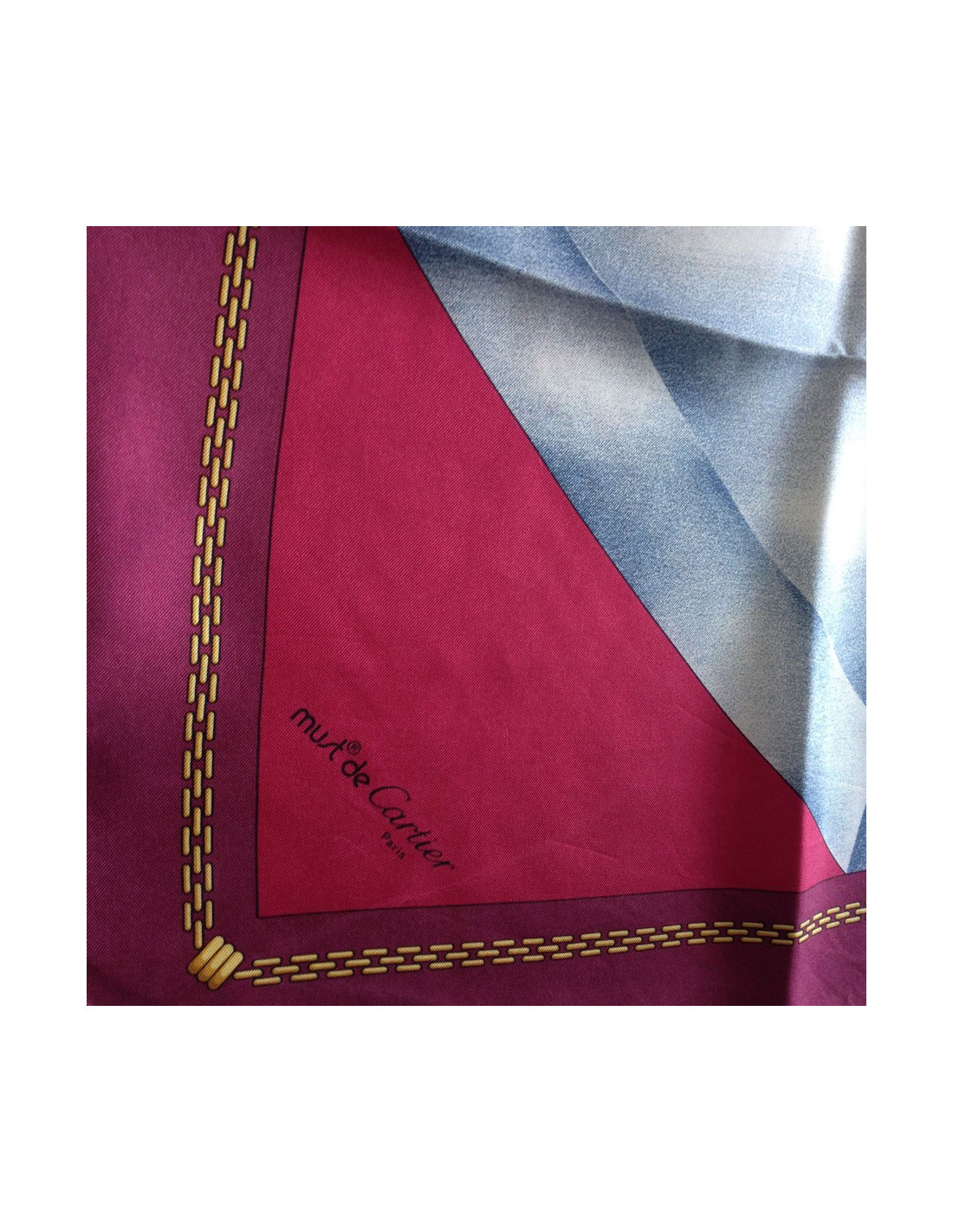 Très beau carré de soie MUST de la maison CARTIER. Bordure rouge bordeaux, fond à tendance bleuté.