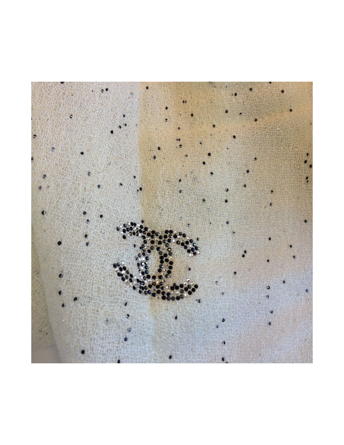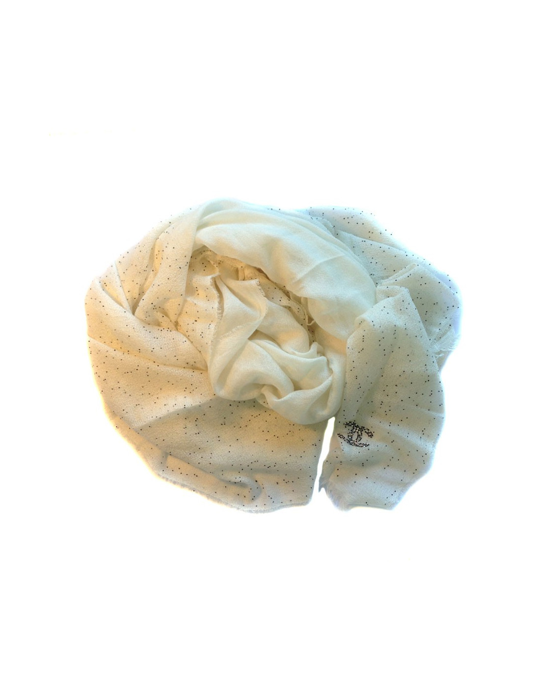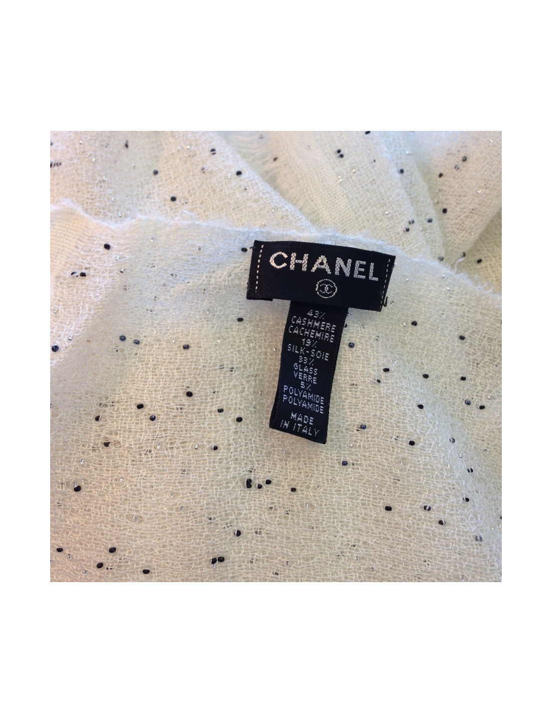Superbe étole CHANEL écrue à bord frangé. Composition: cachemire et soie et divers, CC en petits strass noirs et brillants sur un bord de l'étole. Petites perles brodées de façon aléatoire sur les deux pans de l'étole. Etiquette de matière présente. Très bon état.