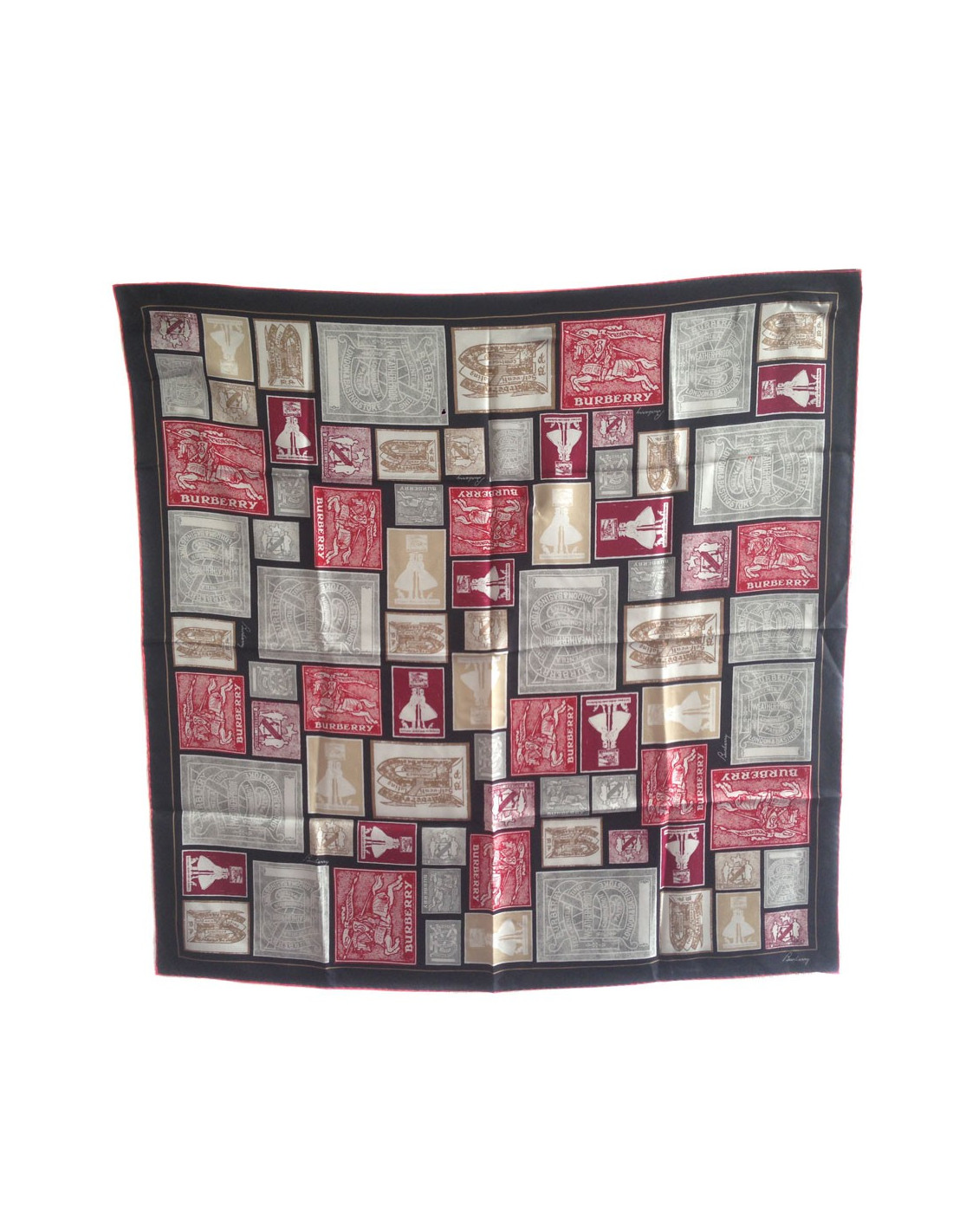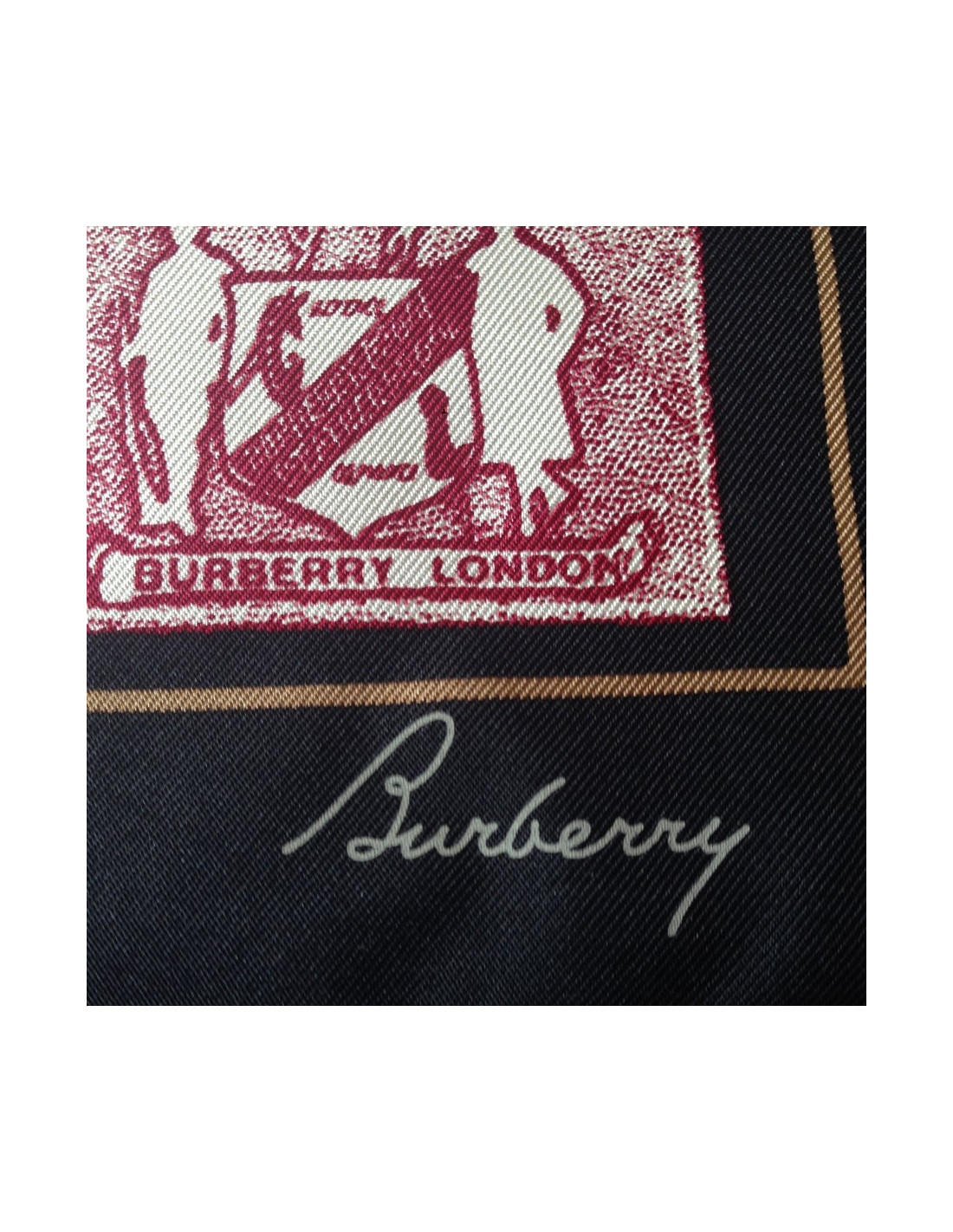 Superbe foulard BURBERRY en soie. Motif: vignettes de différentes tailles dans les tons beiges, gris et rouges sur un fond noir. Le roulotté rouge est en parfait état. Carré jamais porté.