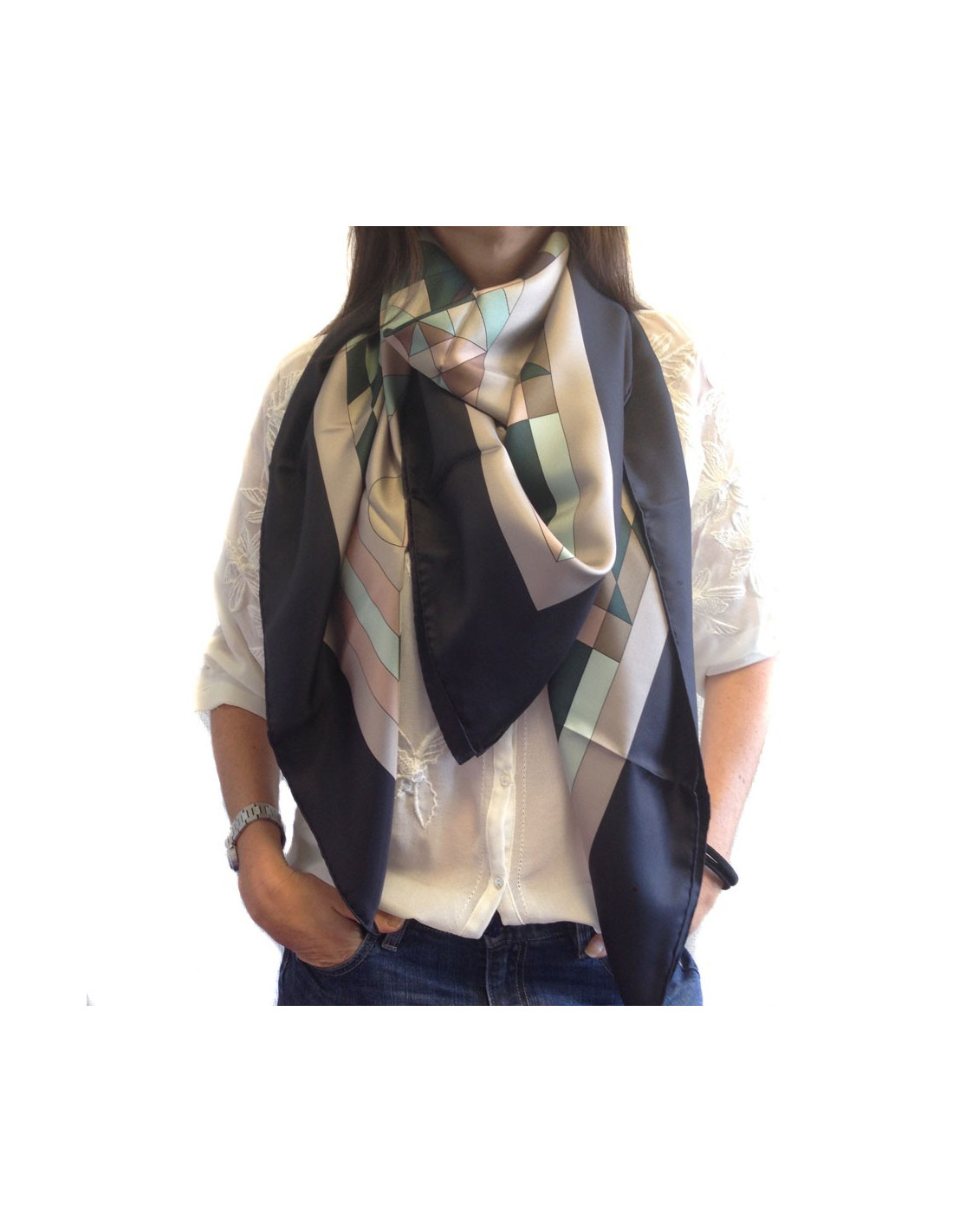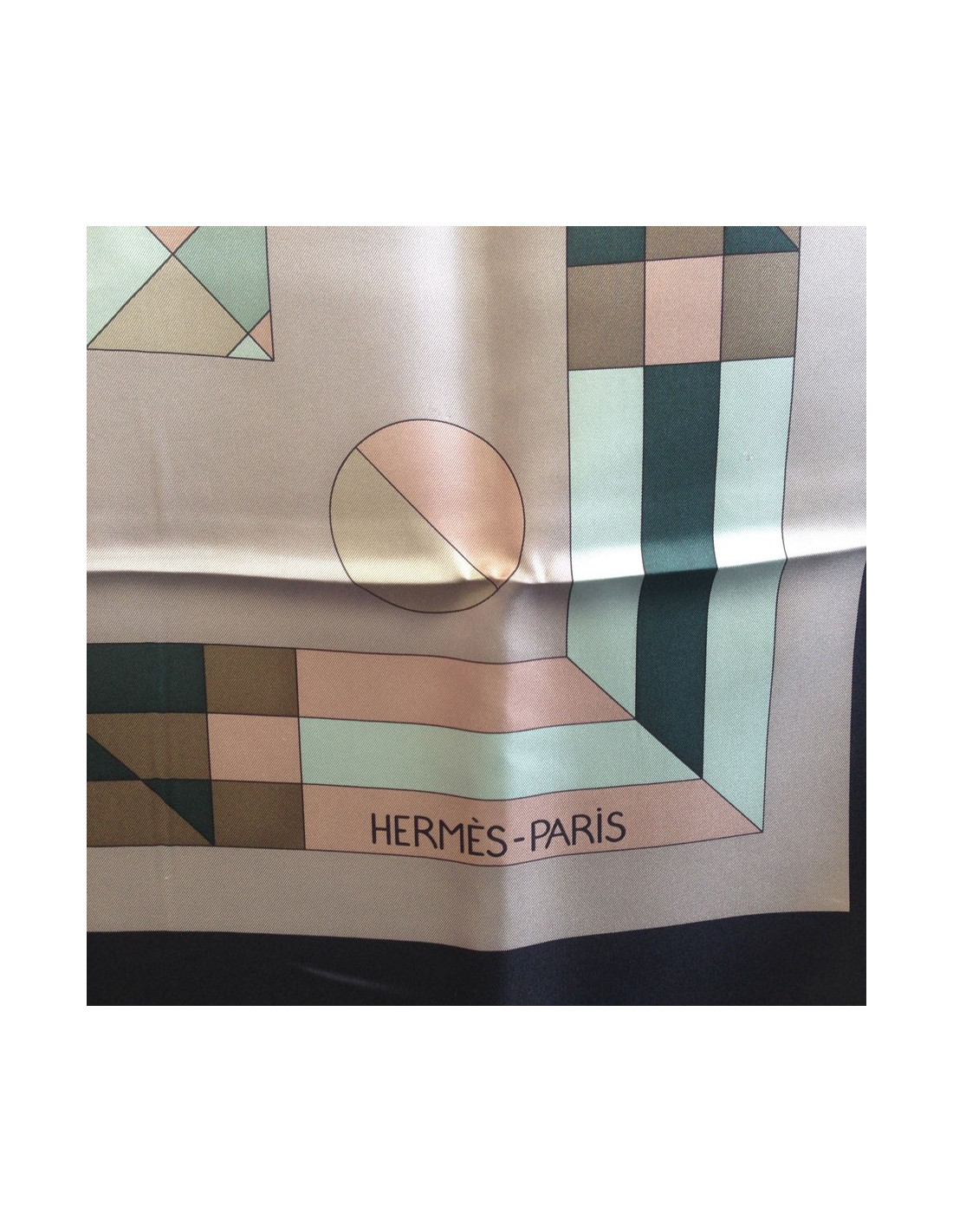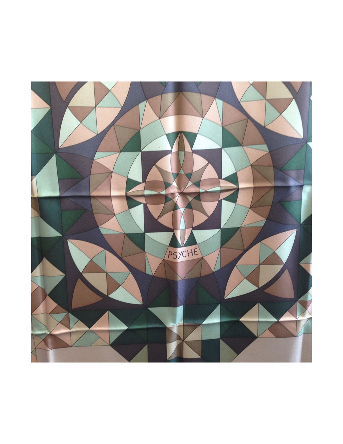 Grand carré HERMES modèle "Psyché" en soie. Coloris neutres: noir, étoupe, vert, beige, vieux rose. Le roulotté est impeccable. Petit trou sur le foulard (voir photo).
