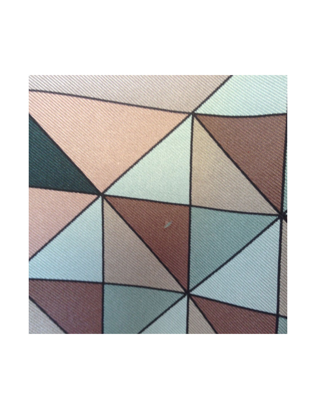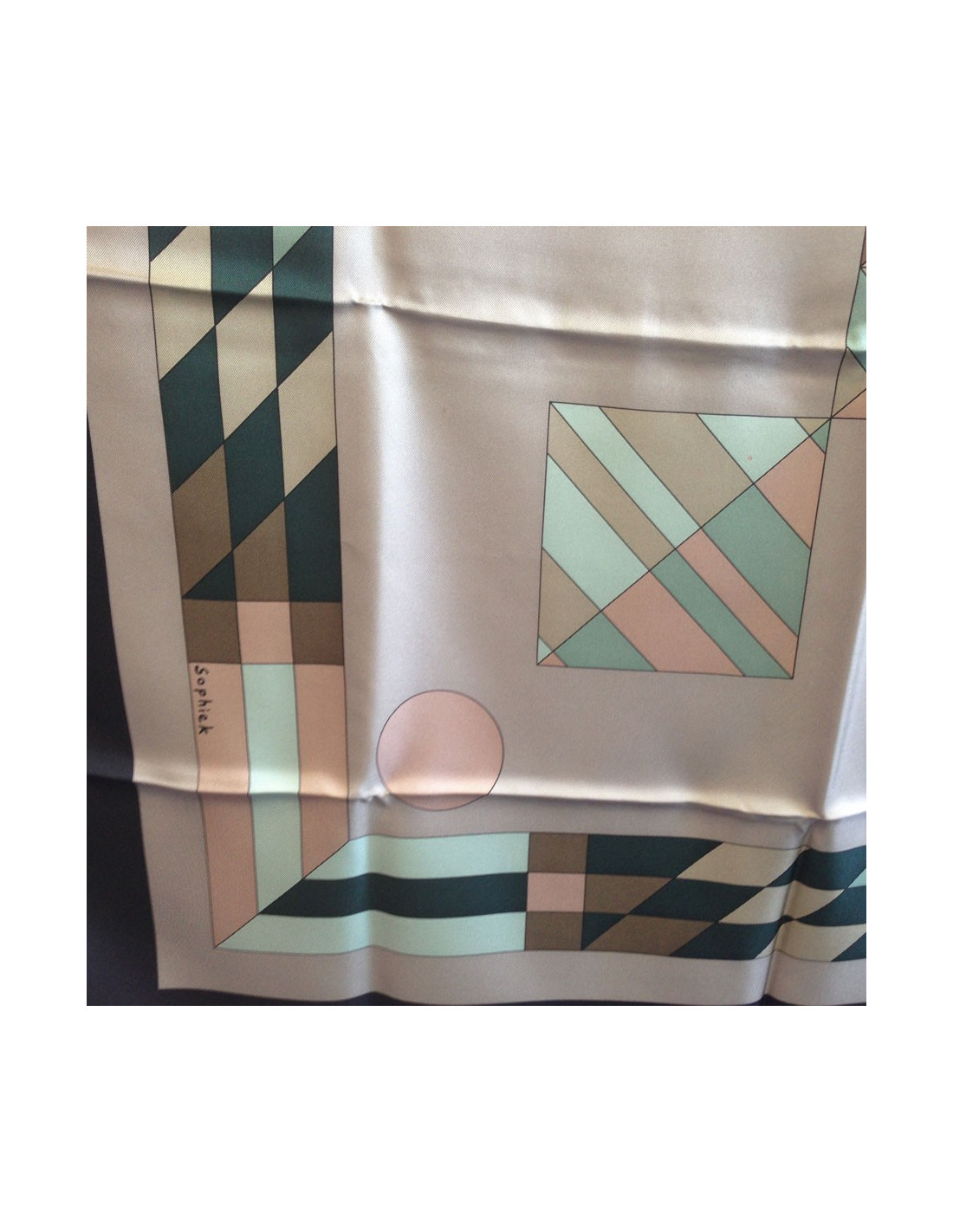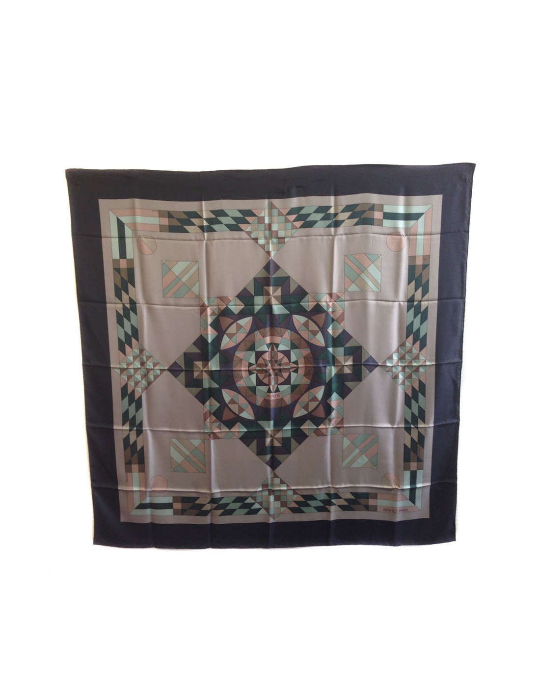 Grand carré HERMES modèle "Psyché" en soie. Coloris neutres: noir, étoupe, vert, beige, vieux rose. Le roulotté est impeccable. Petit trou sur le foulard (voir photo).