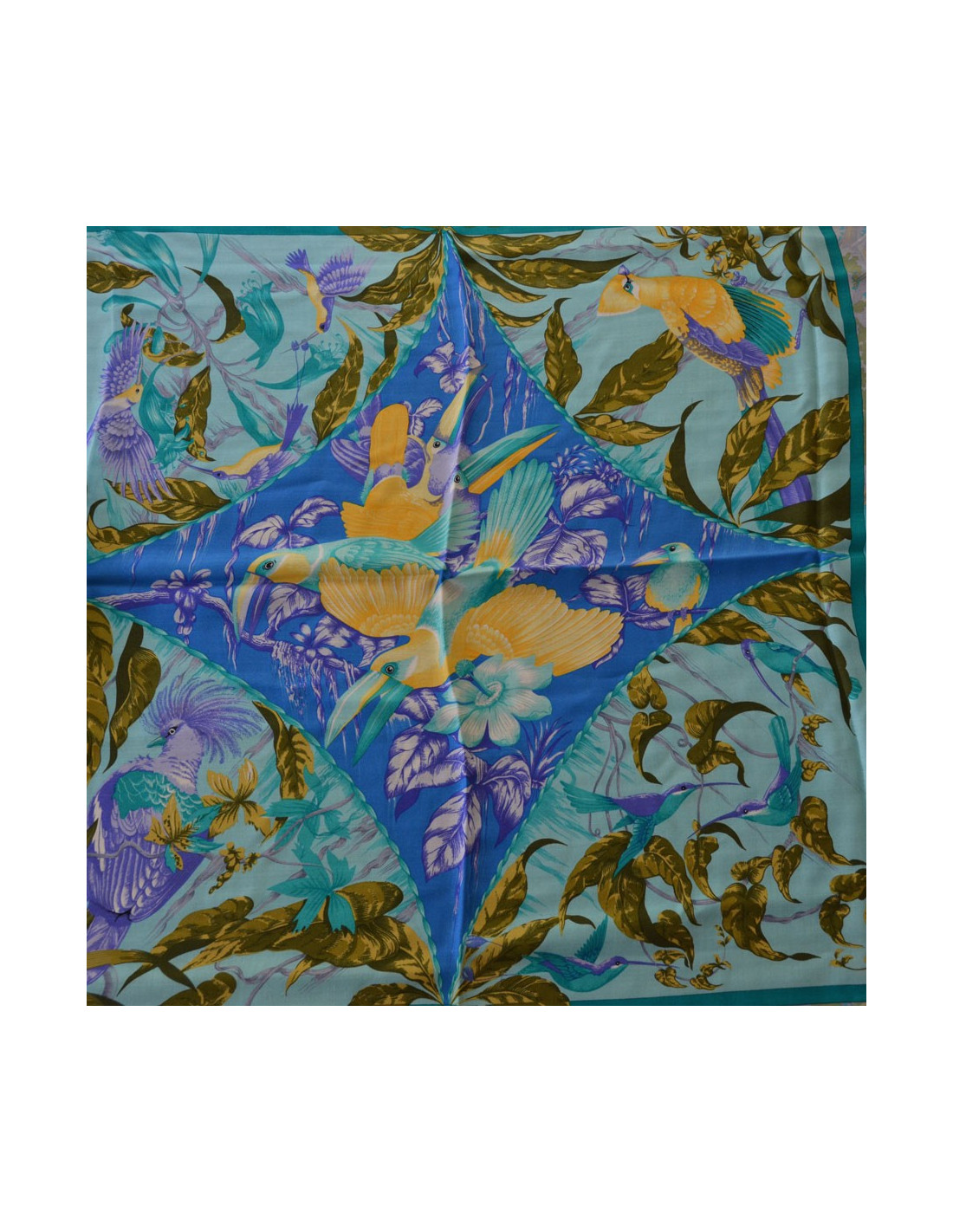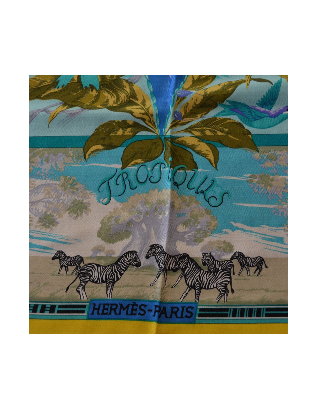 Châle HERMES "Tropiques" en cachemire et soie, coloris à dominante de jaune, bleu et vert. Le roulotté est impeccable. Des petites tirettes infimes.