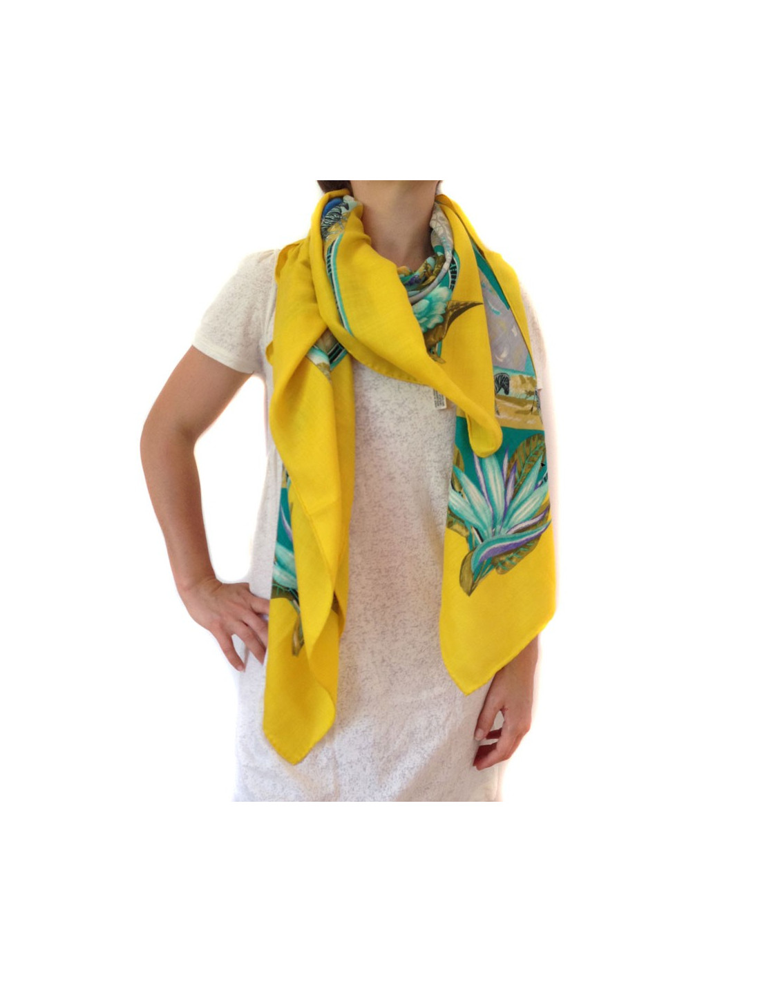 Châle HERMES "Tropiques" en cachemire et soie jaune