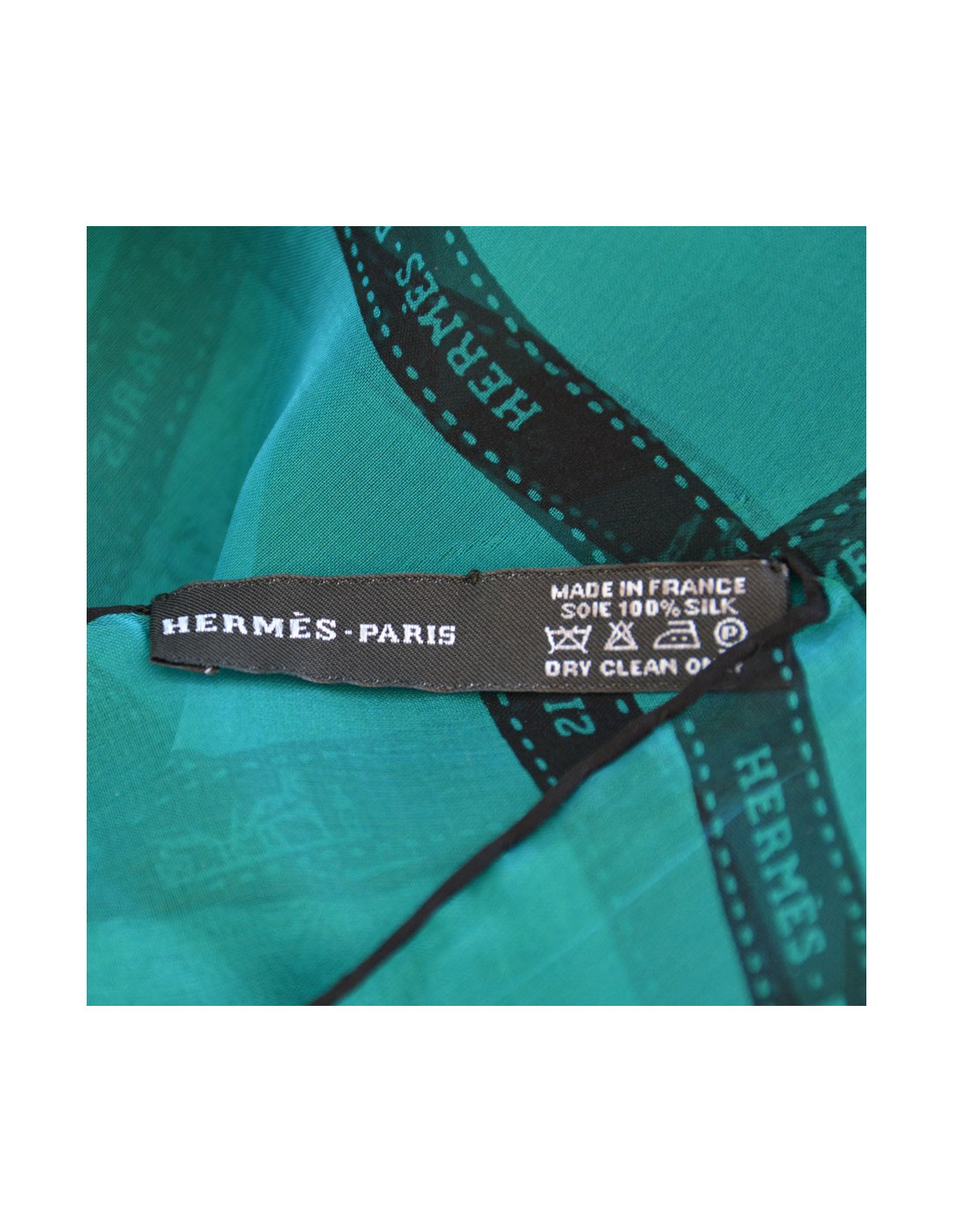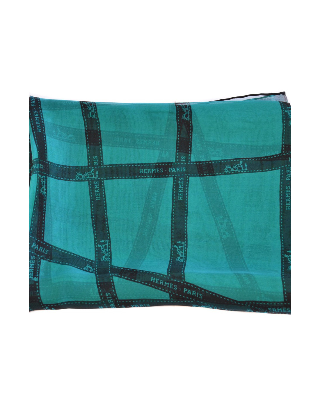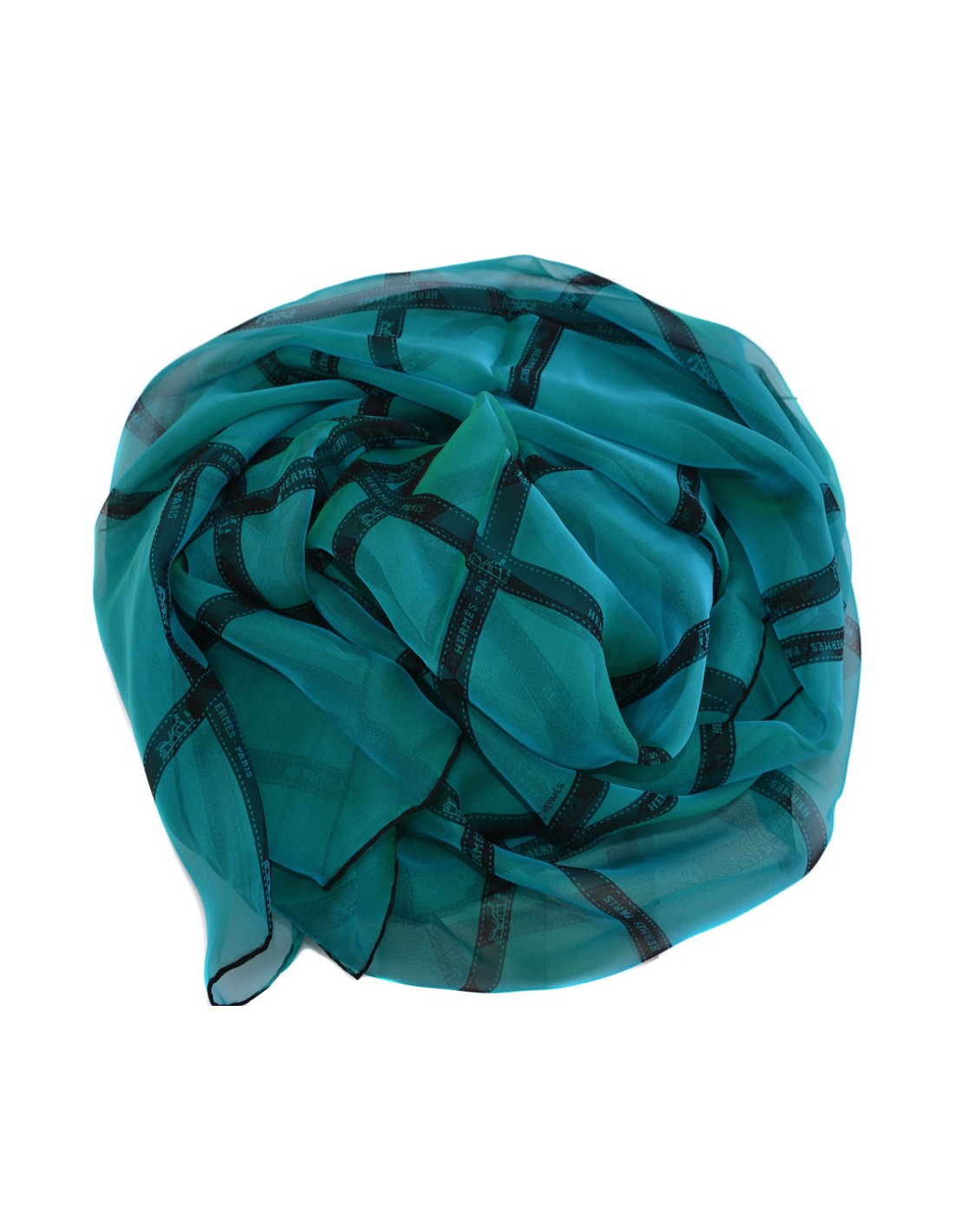 Foulard HERMES bolduc en mousseline de soie bleue à reflets verts