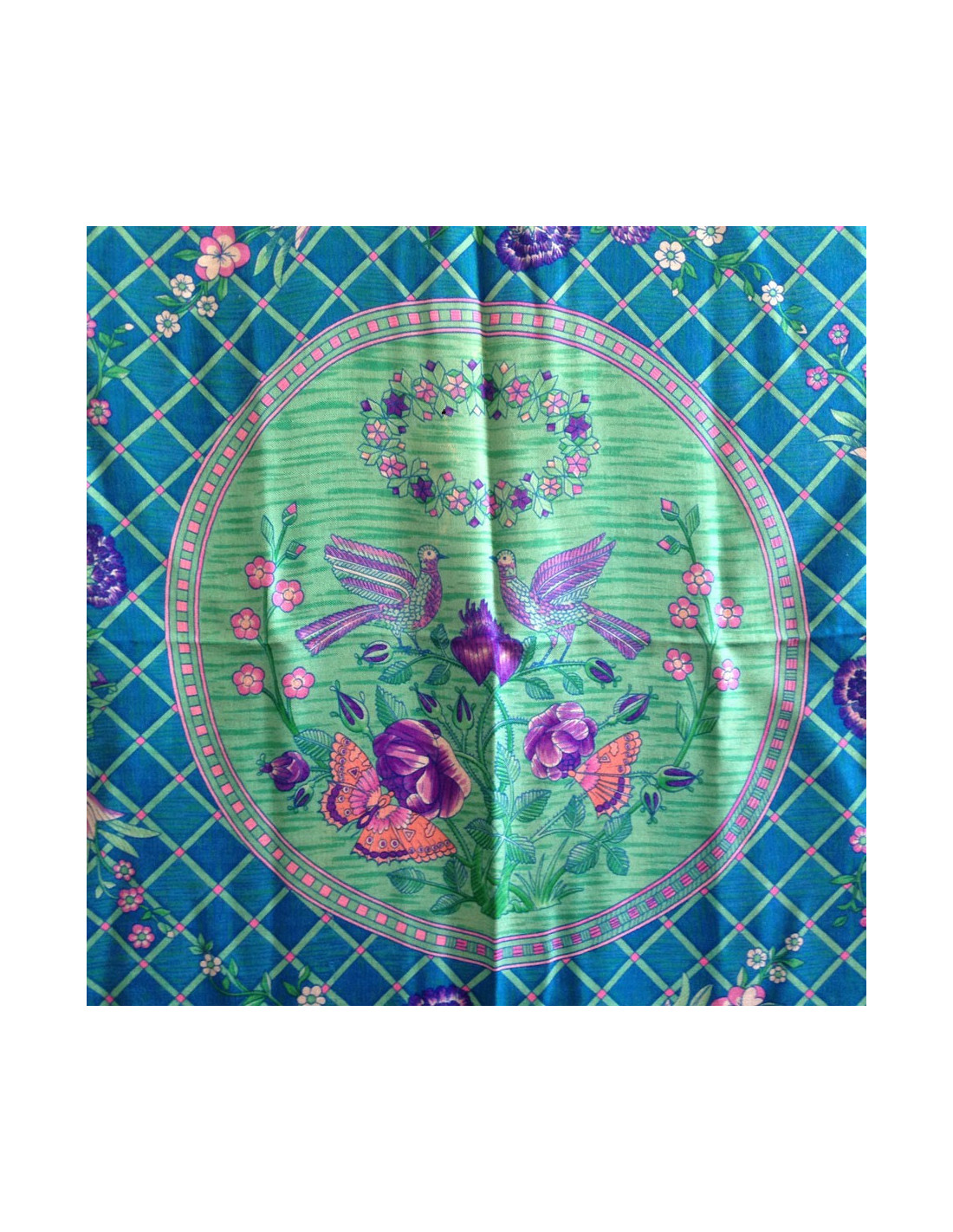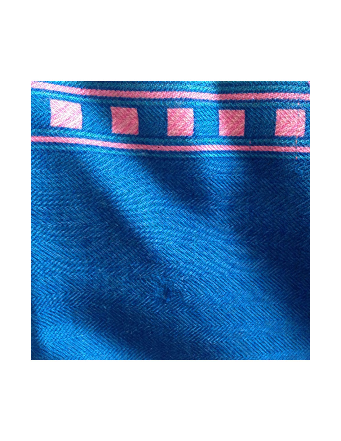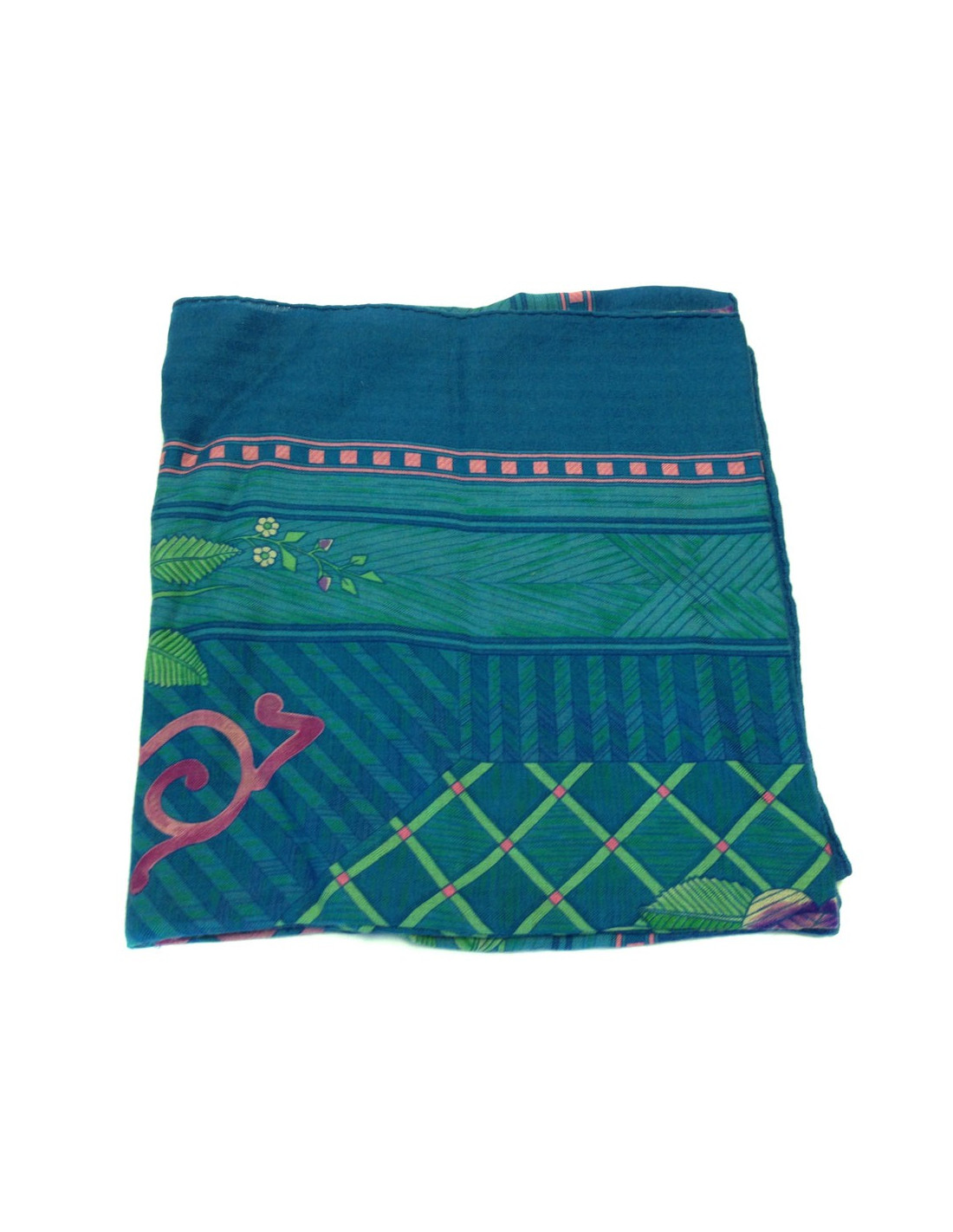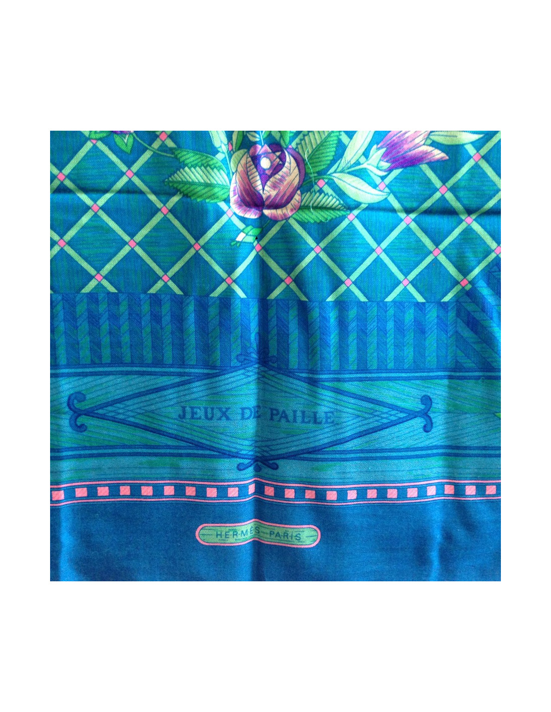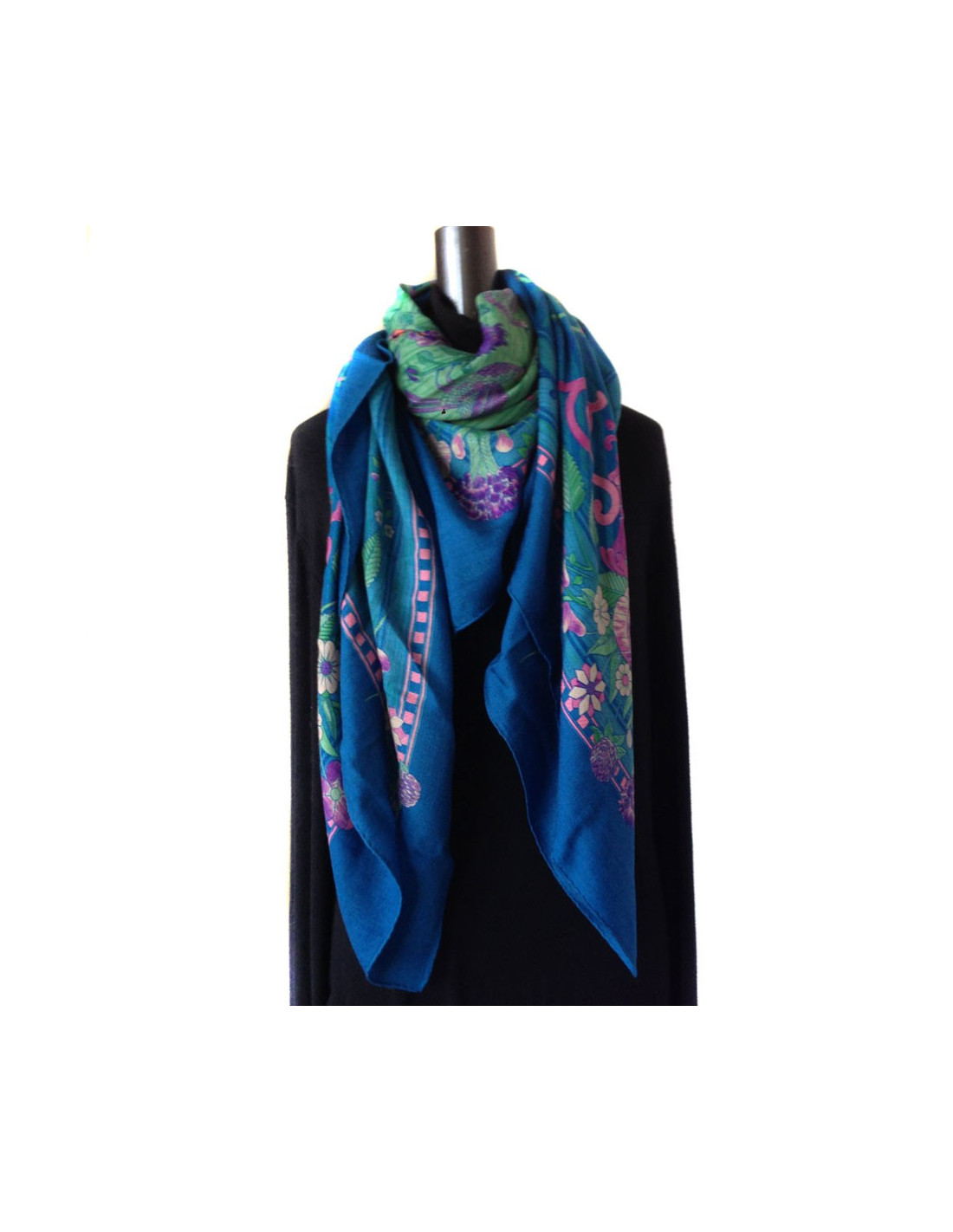Châle HERMES "Jeu de paille" en cachemire et soie couleur bleu canard. Motifs floraux dans les tons de rose, vert. Un petit accro léger sur le fond bleu (voir photos). Le roulotté est un peu défait sur un coin du châle (voir photo). En bon état général.