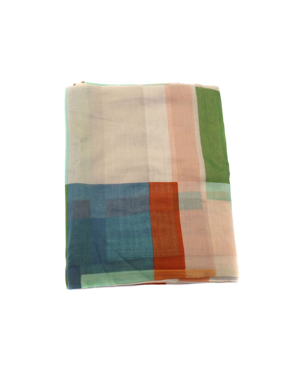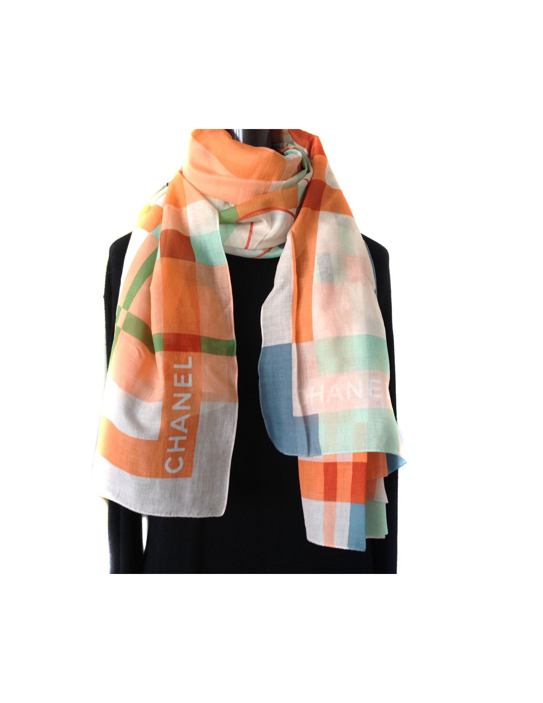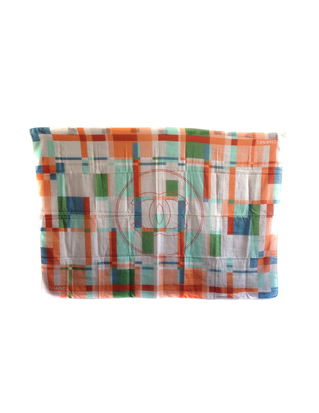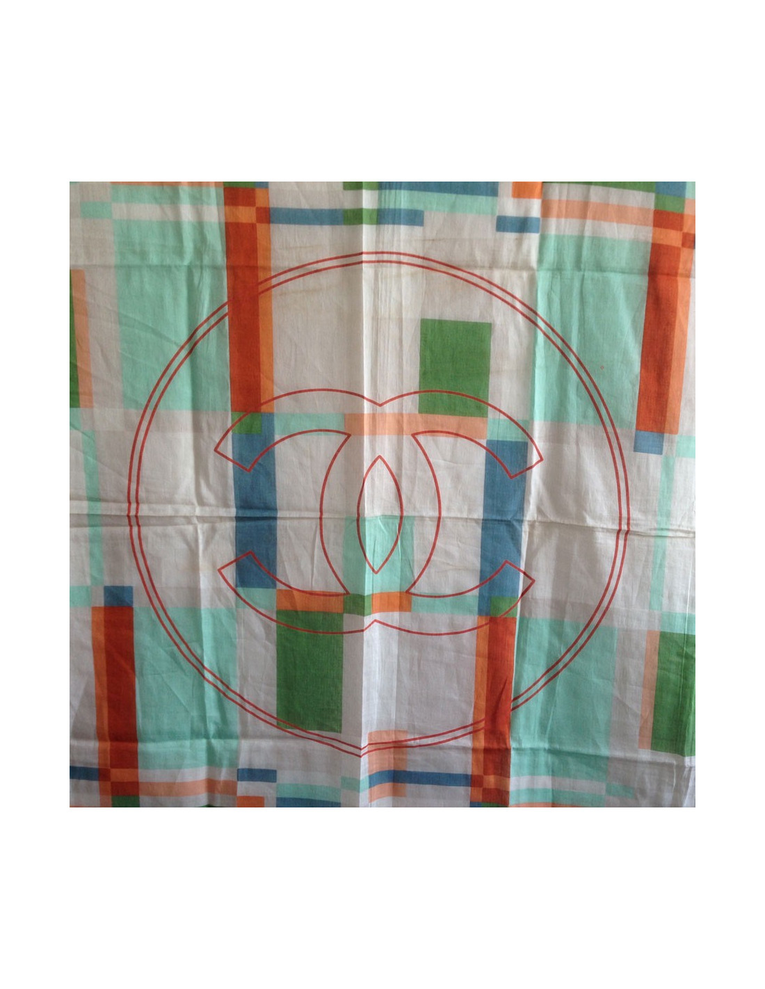 Foulard CHANEL en coton, motifs géométriques multicolores, tons pastels avec un grand CC au centre.