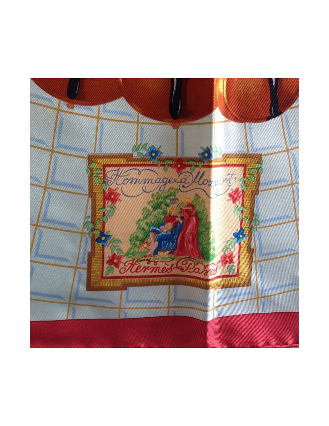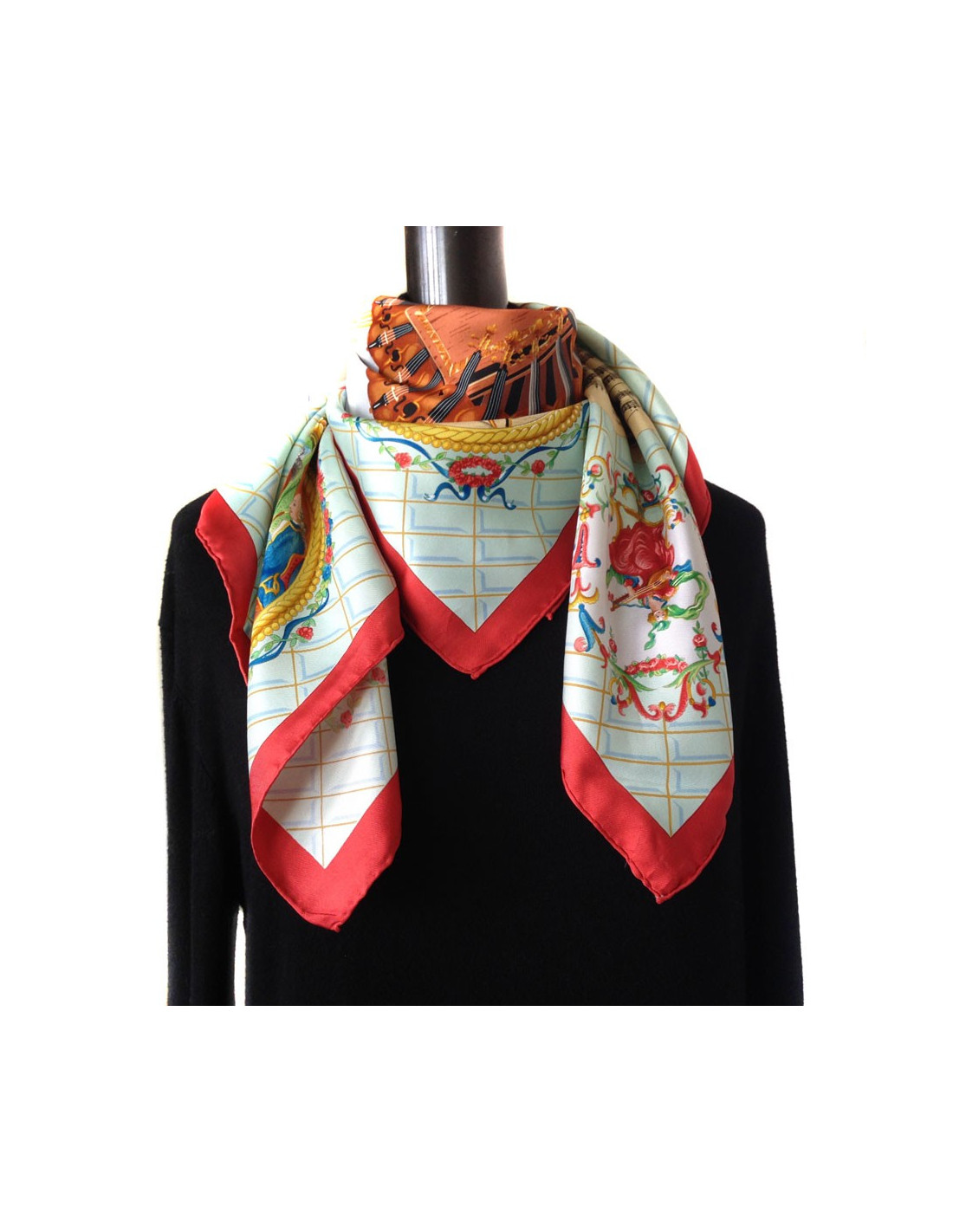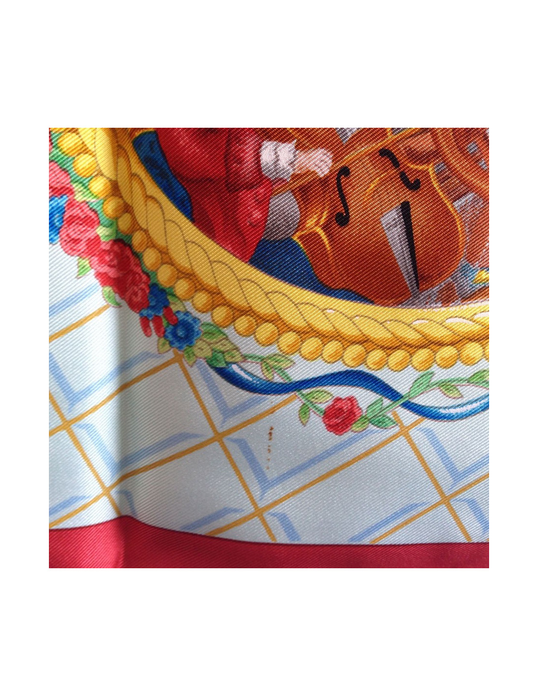 Ravissant carré Hermes en soie dans des teintes pastels. Motif: portée de musique et instruments.